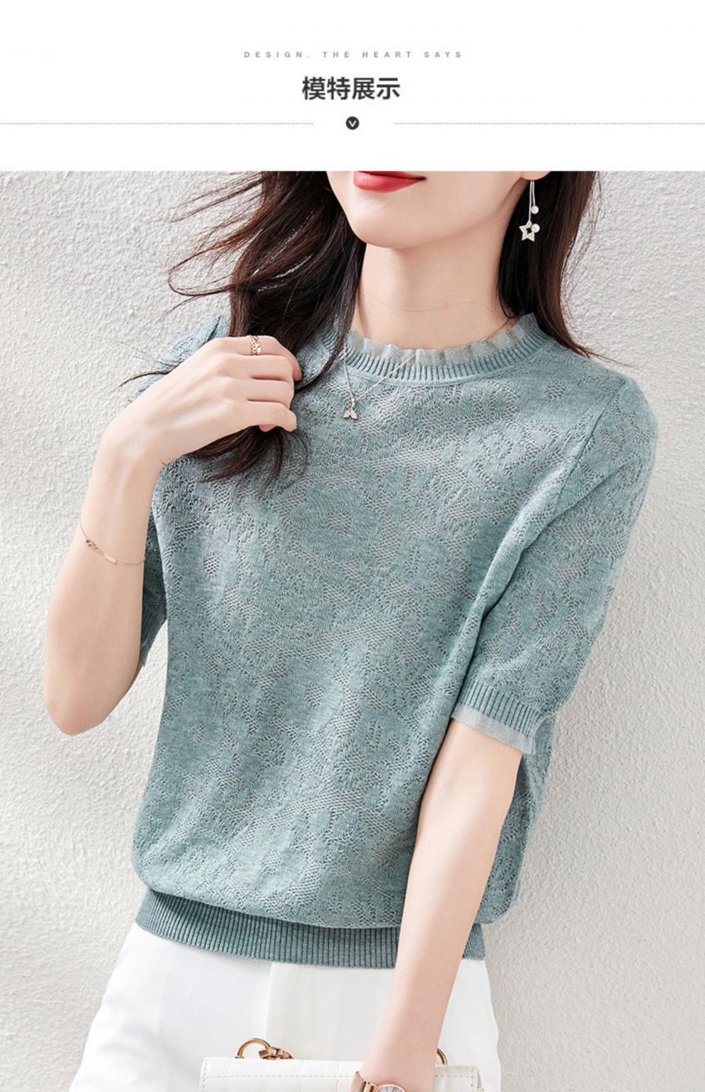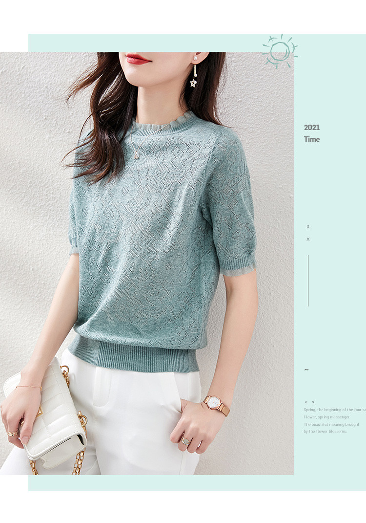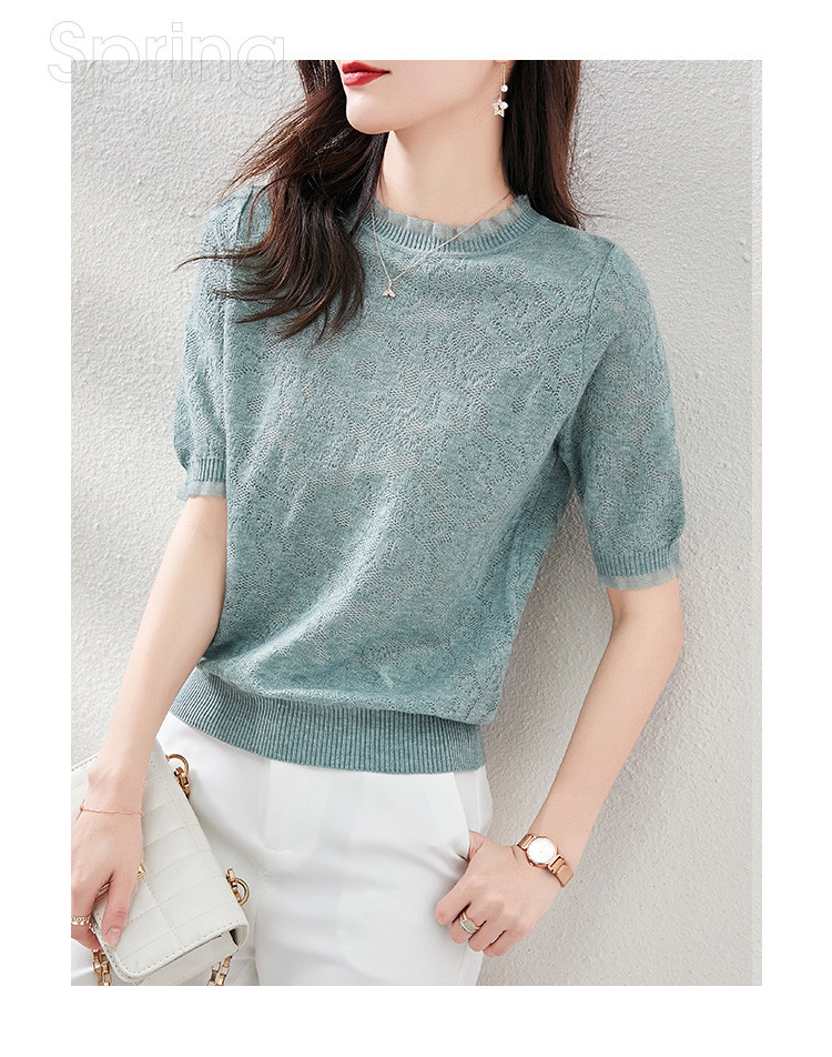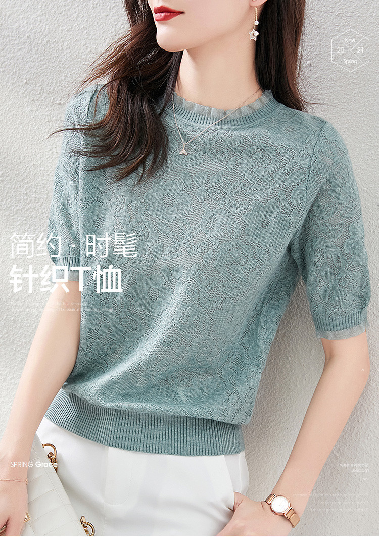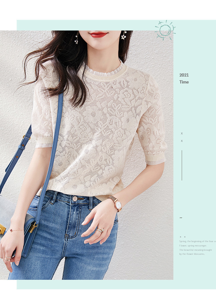 레이스 엣지 반팔 티셔츠 여성용 2023 여름 새로운 중공 크로 셰 뜨개질 얇은 니트 스웨터 짧은 우아한 작은 탑스토어 가기