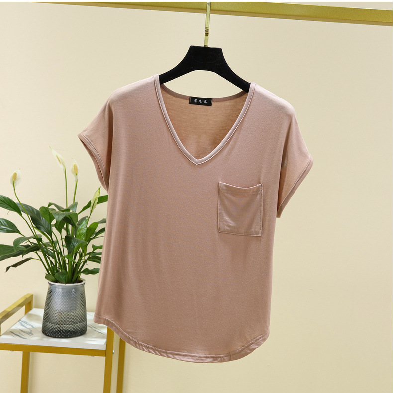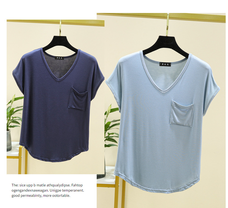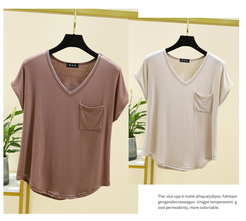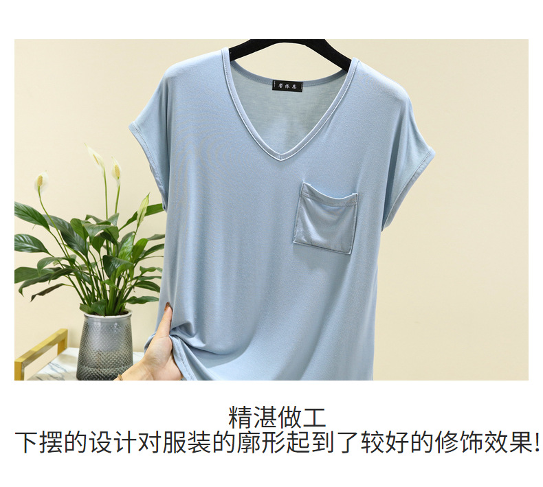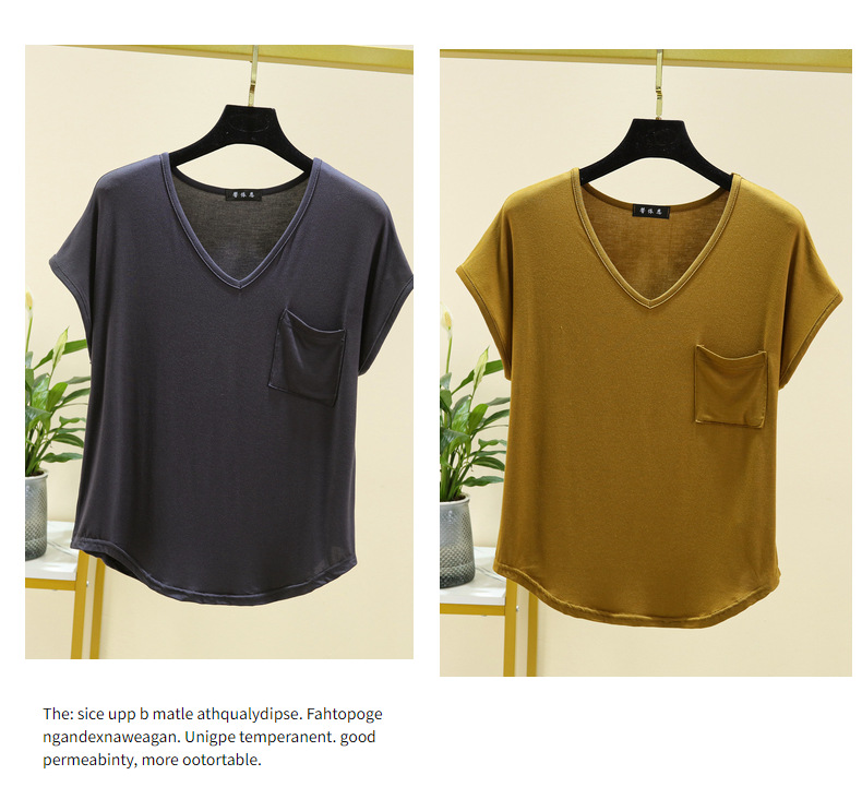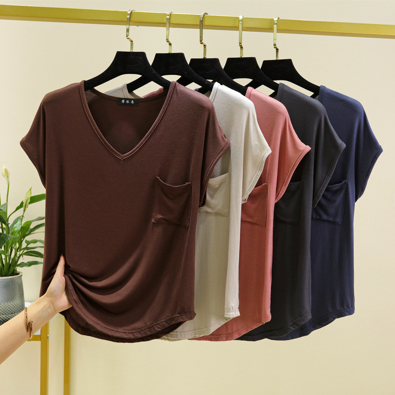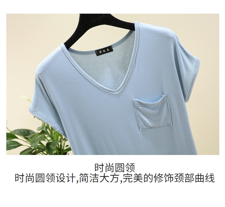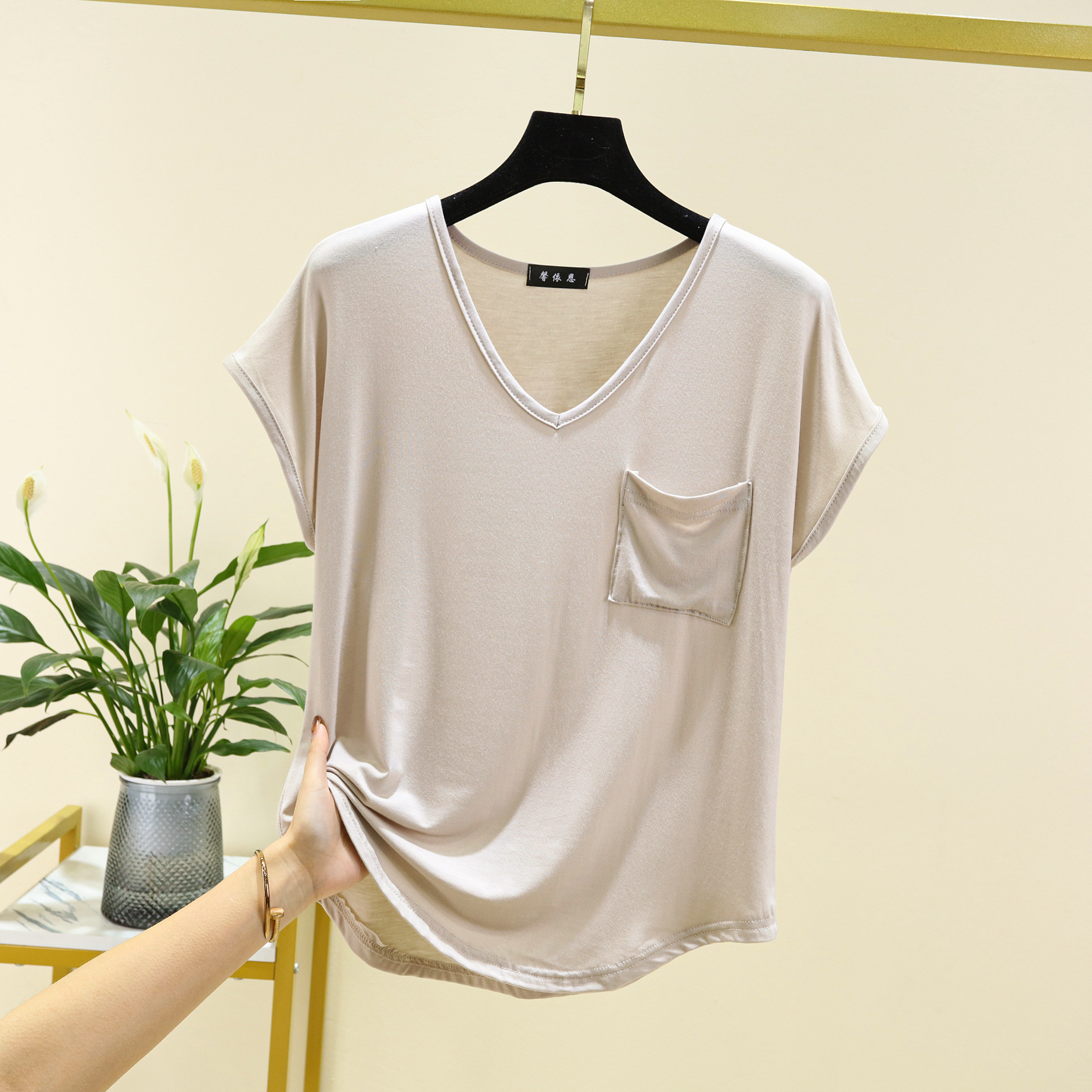 모달베이스 티셔츠 여자의 여름 얇은 단색 한국 스타일 느슨한 슬리밍 통통녀 플러스 사이즈 V-넥 짧은 소매 탑스토어 가기