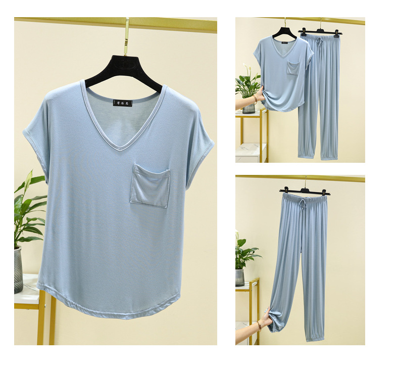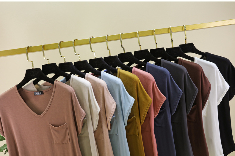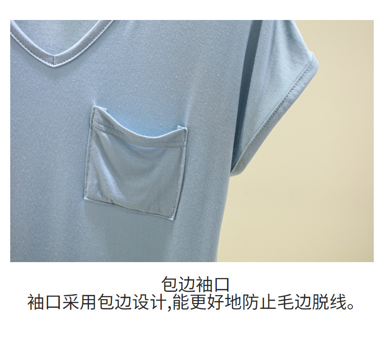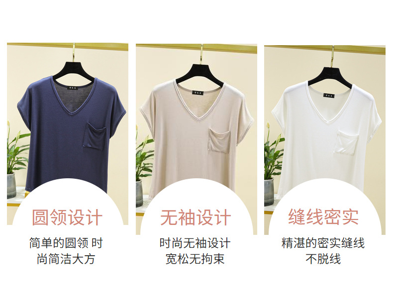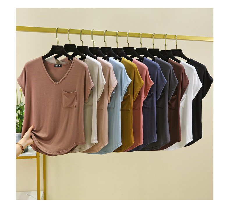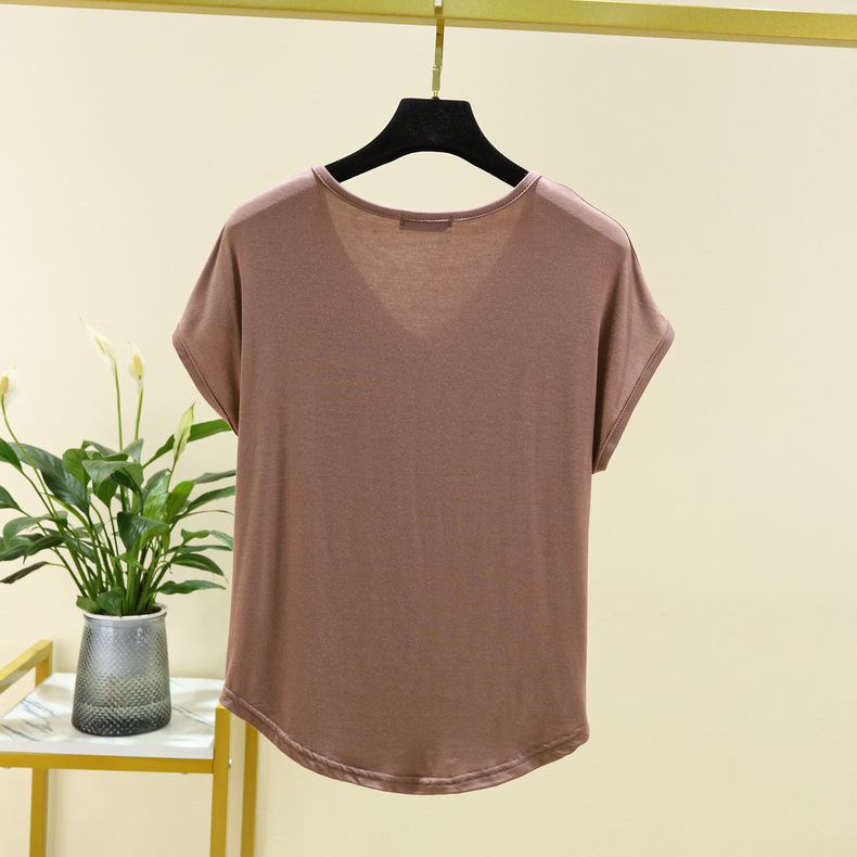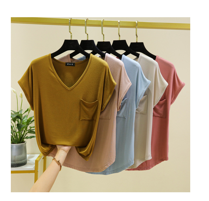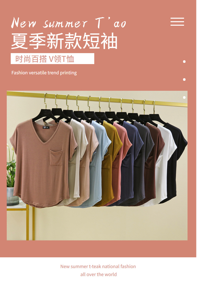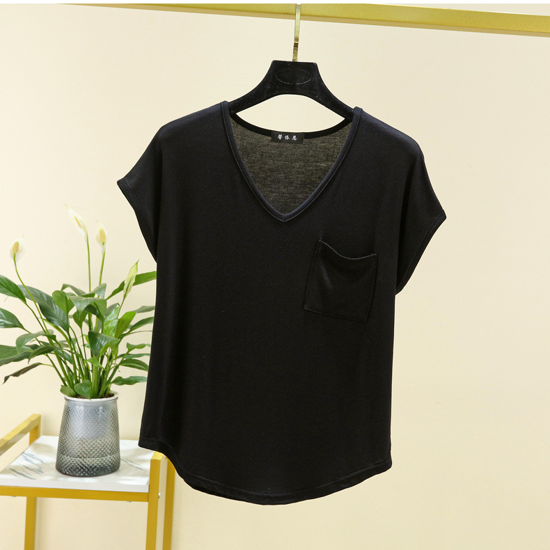 모달베이스 티셔츠 여자의 여름 얇은 단색 한국 스타일 느슨한 슬리밍 통통녀 플러스 사이즈 V-넥 짧은 소매 탑스토어 가기