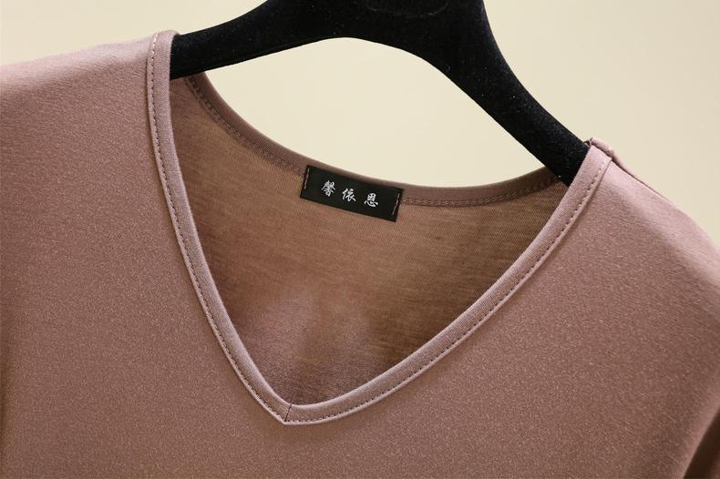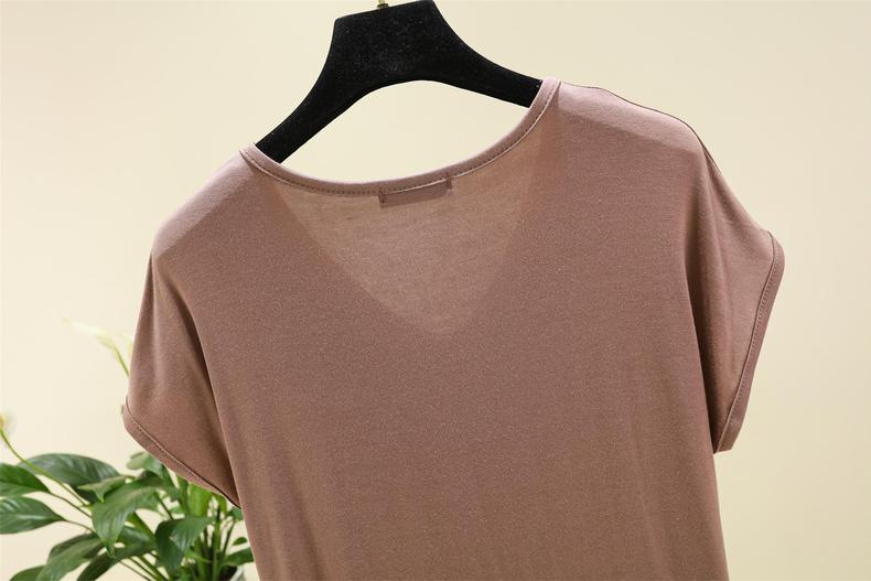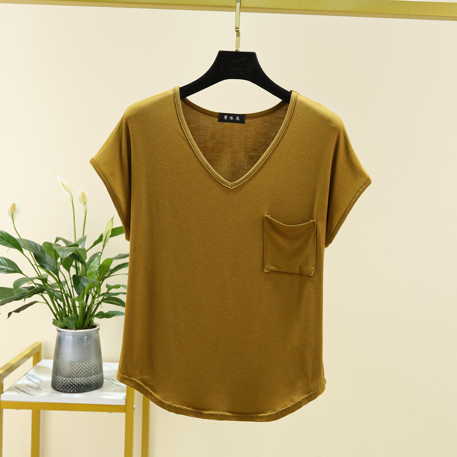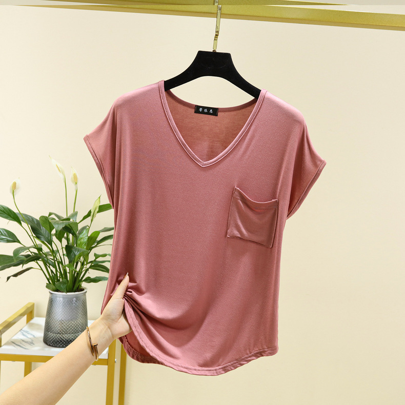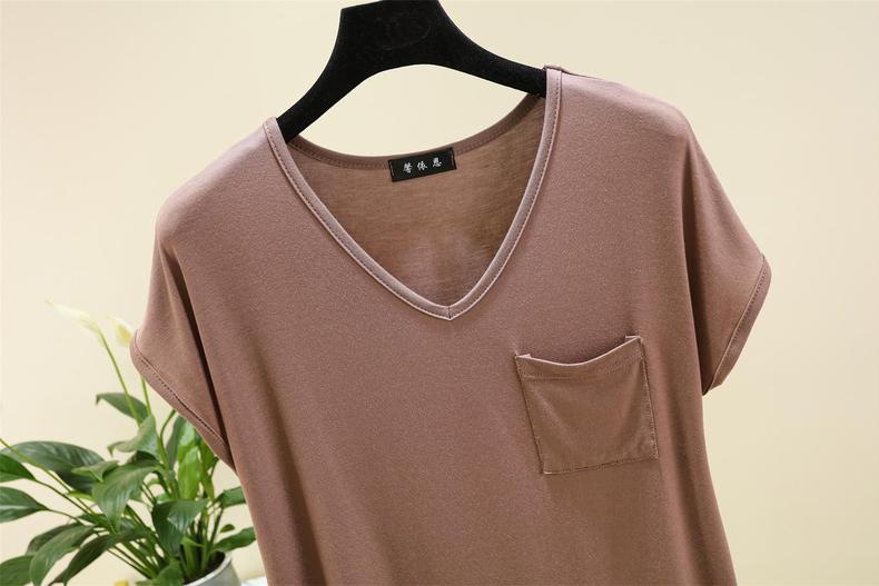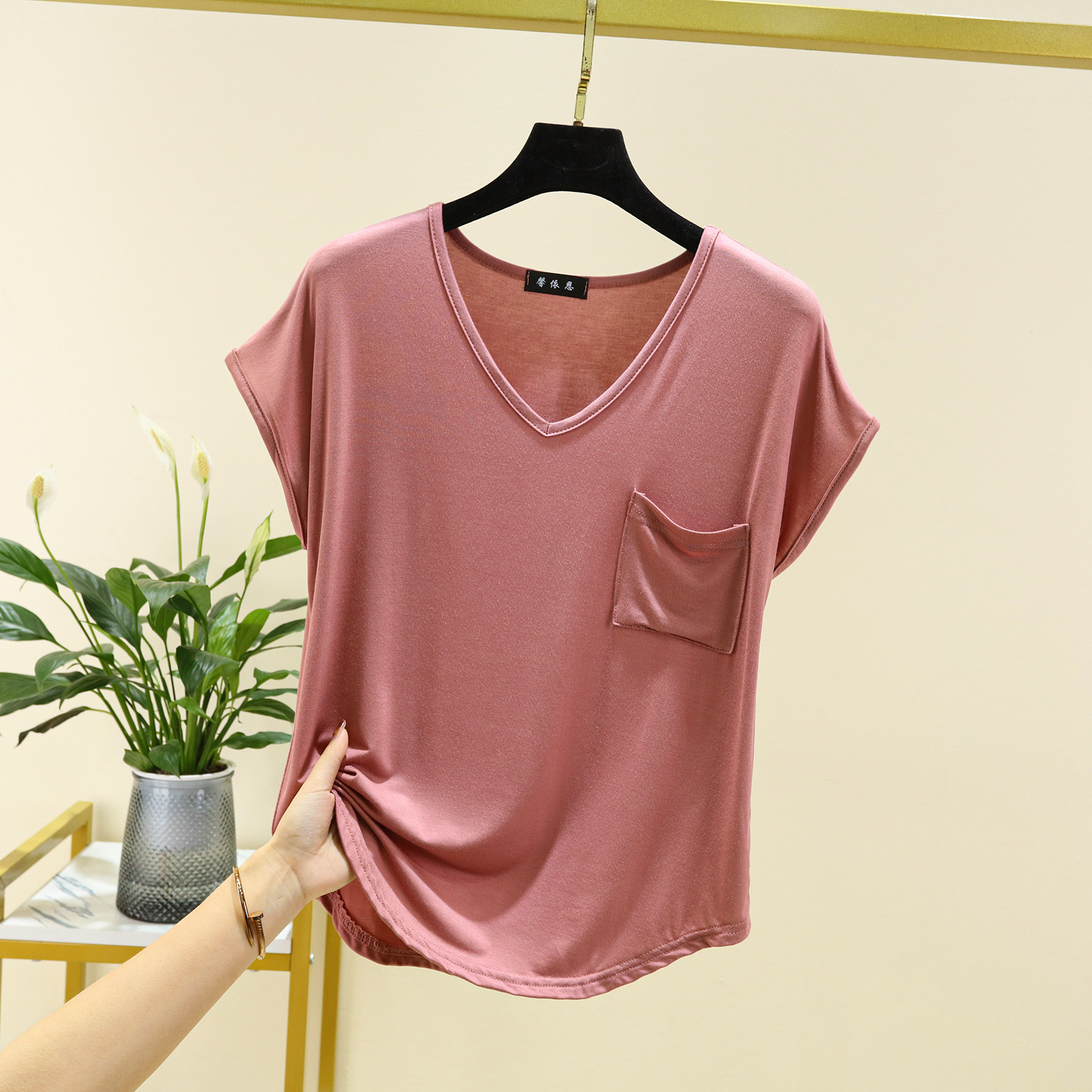 모달베이스 티셔츠 여자의 여름 얇은 단색 한국 스타일 느슨한 슬리밍 통통녀 플러스 사이즈 V-넥 짧은 소매 탑