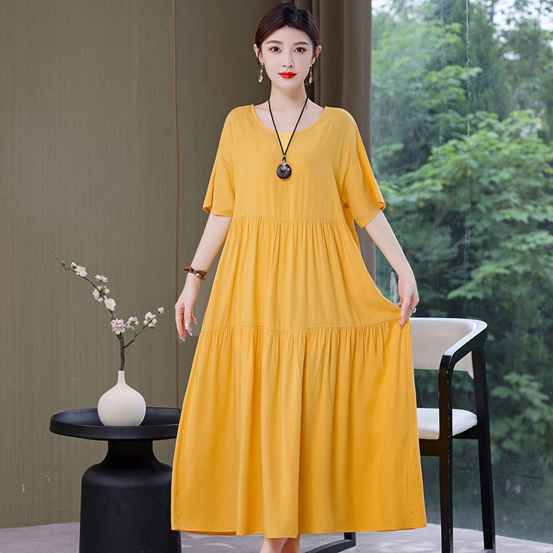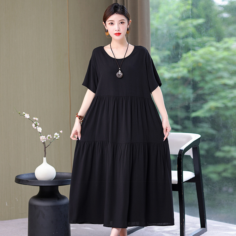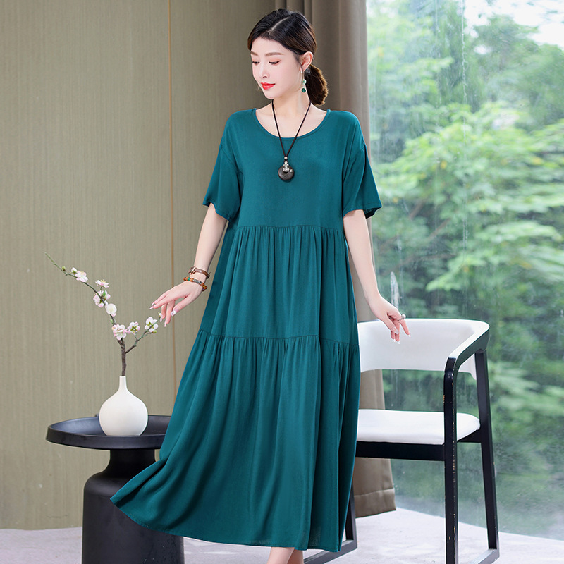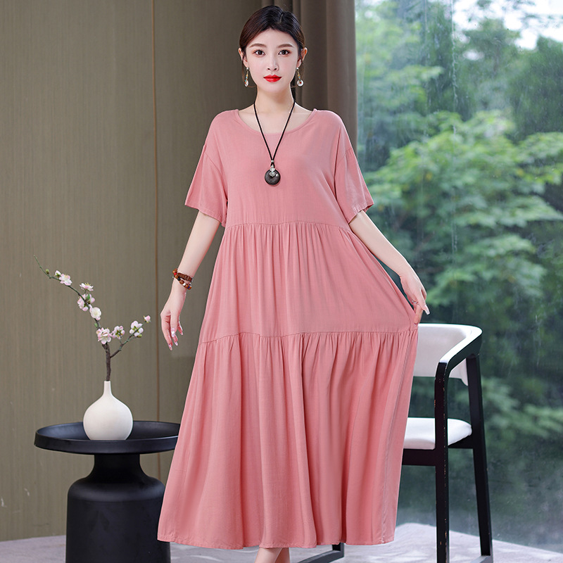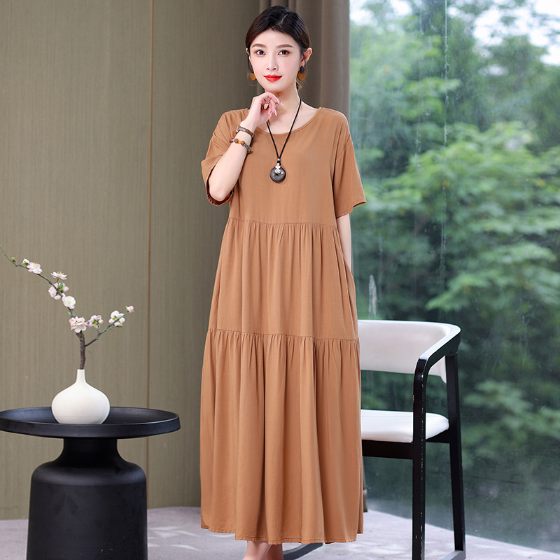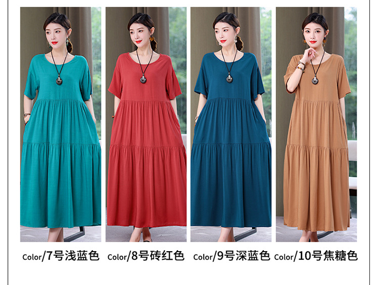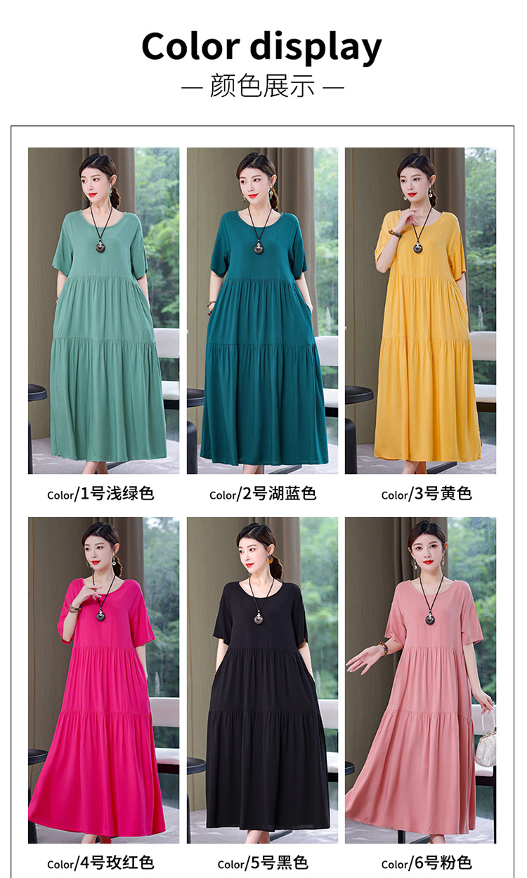 여름 새로운 솔리드 컬러 코튼 실크 원피스 여성 여름 우아한 어머니 느슨한 배 플러스 사이즈 인공 면 긴 치마스토어 가기