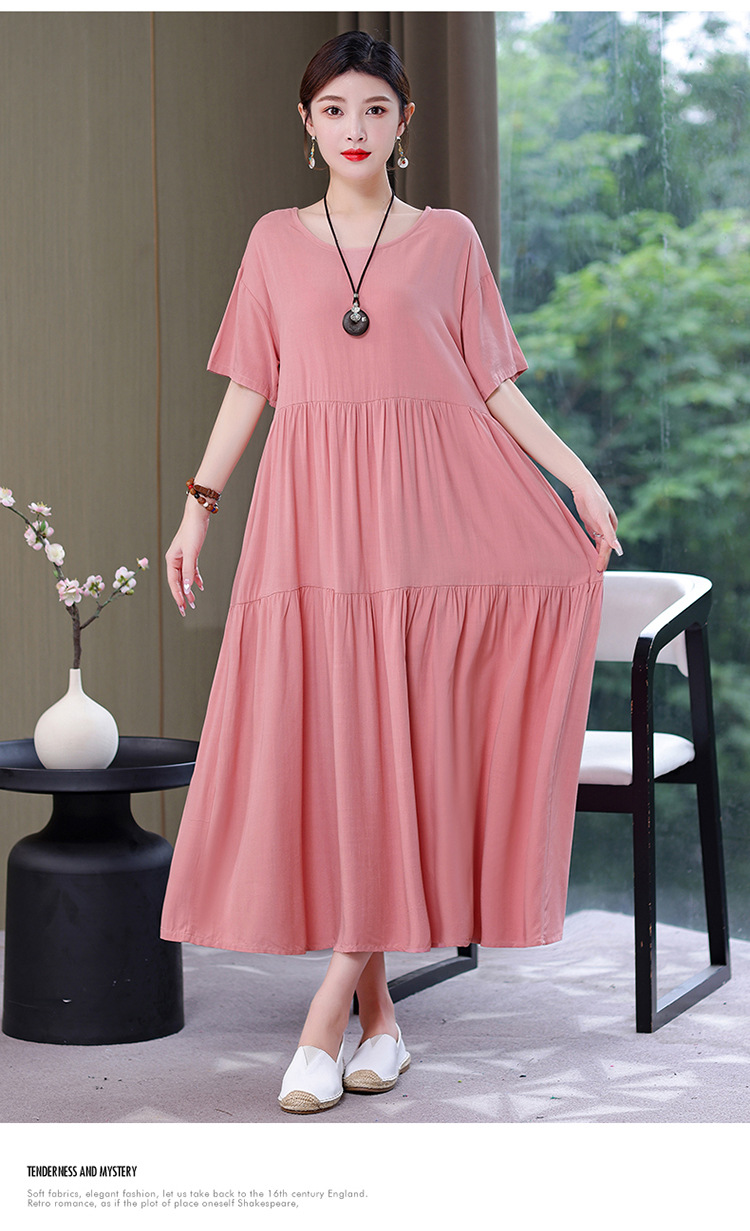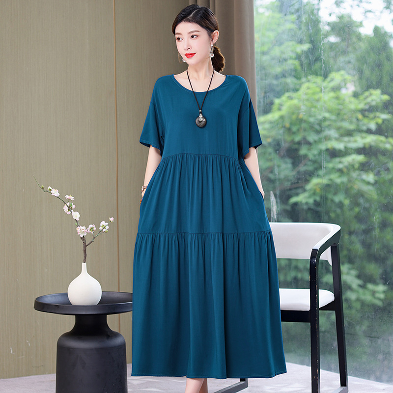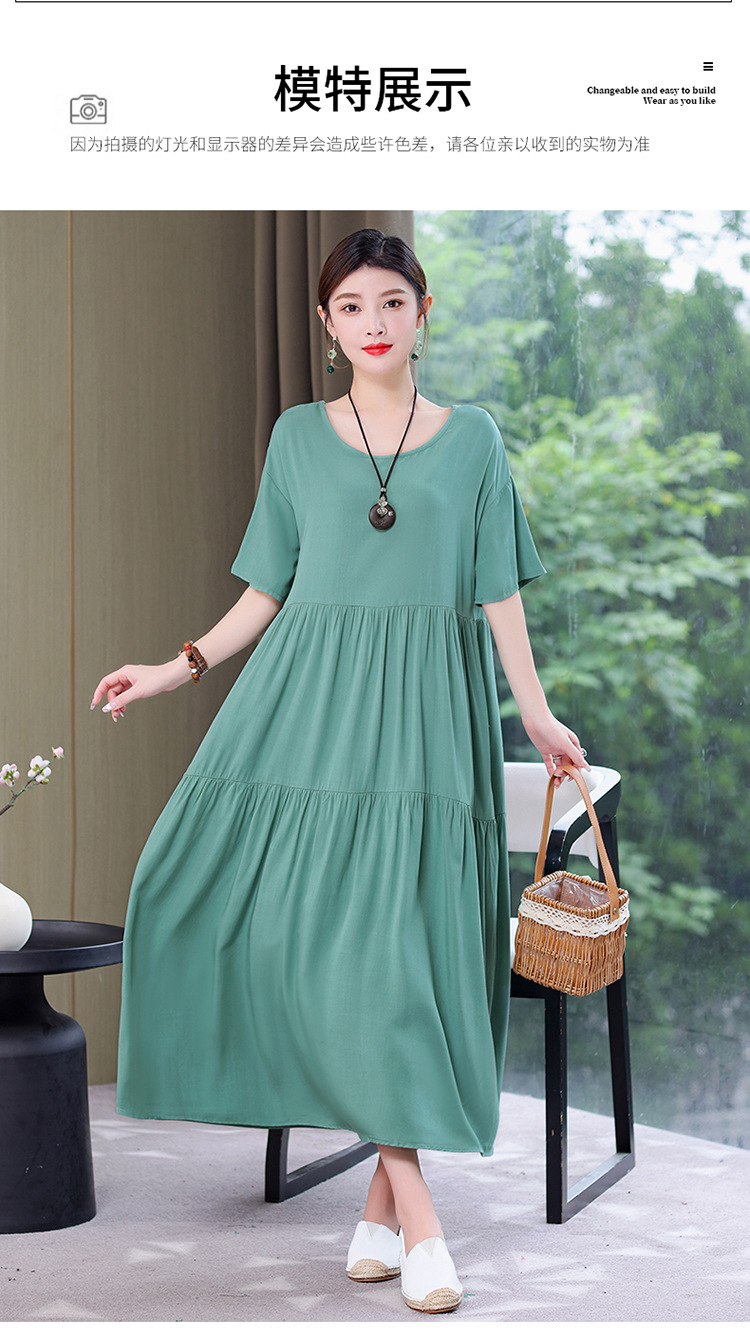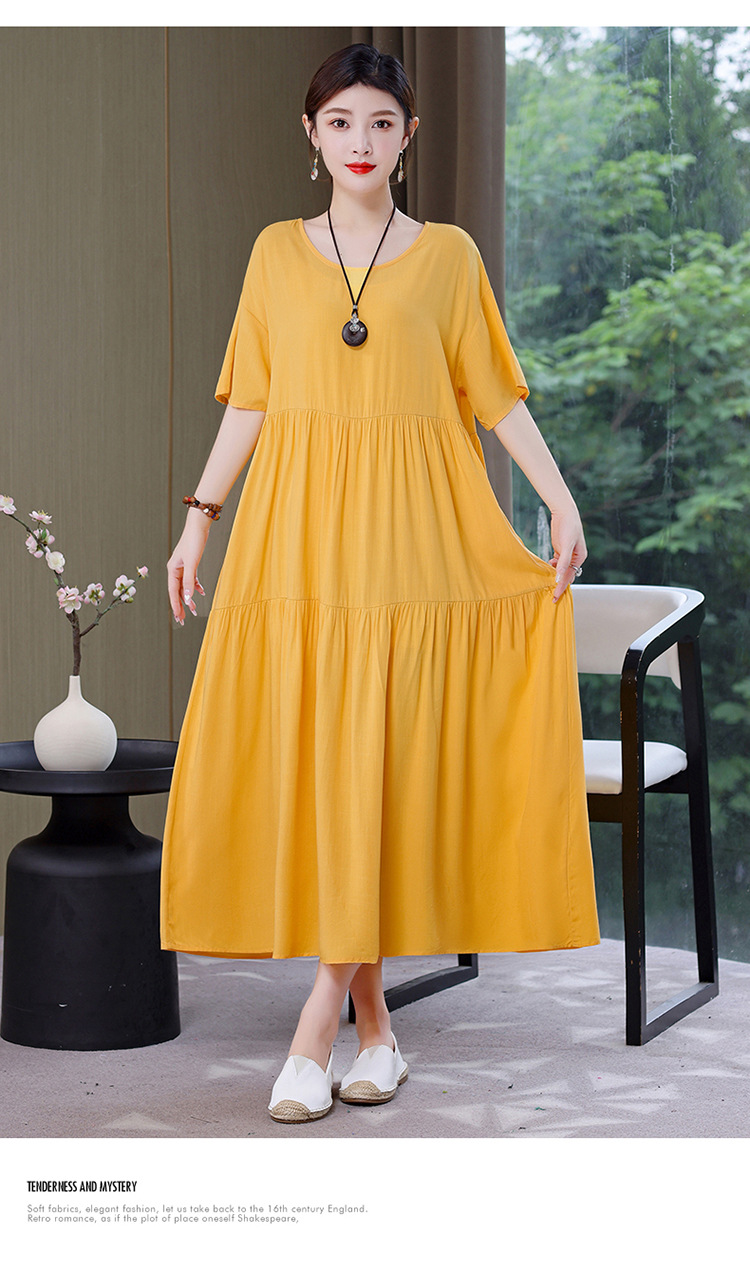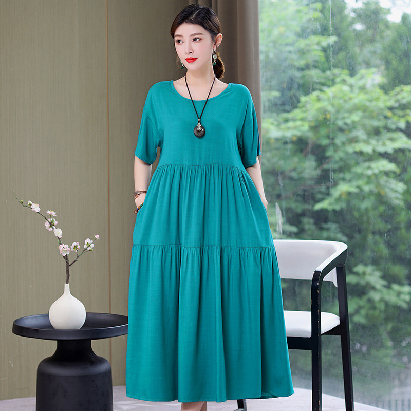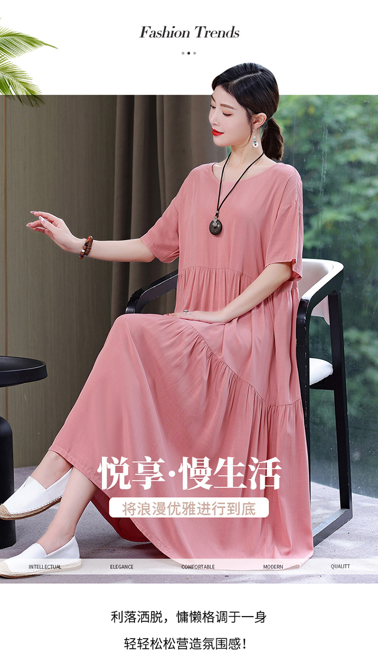 여름 새로운 솔리드 컬러 코튼 실크 원피스 여성 여름 우아한 어머니 느슨한 배 플러스 사이즈 인공 면 긴 치마스토어 가기