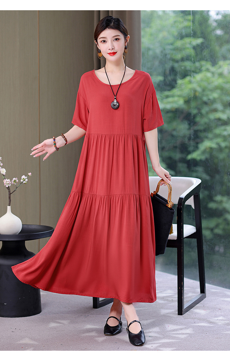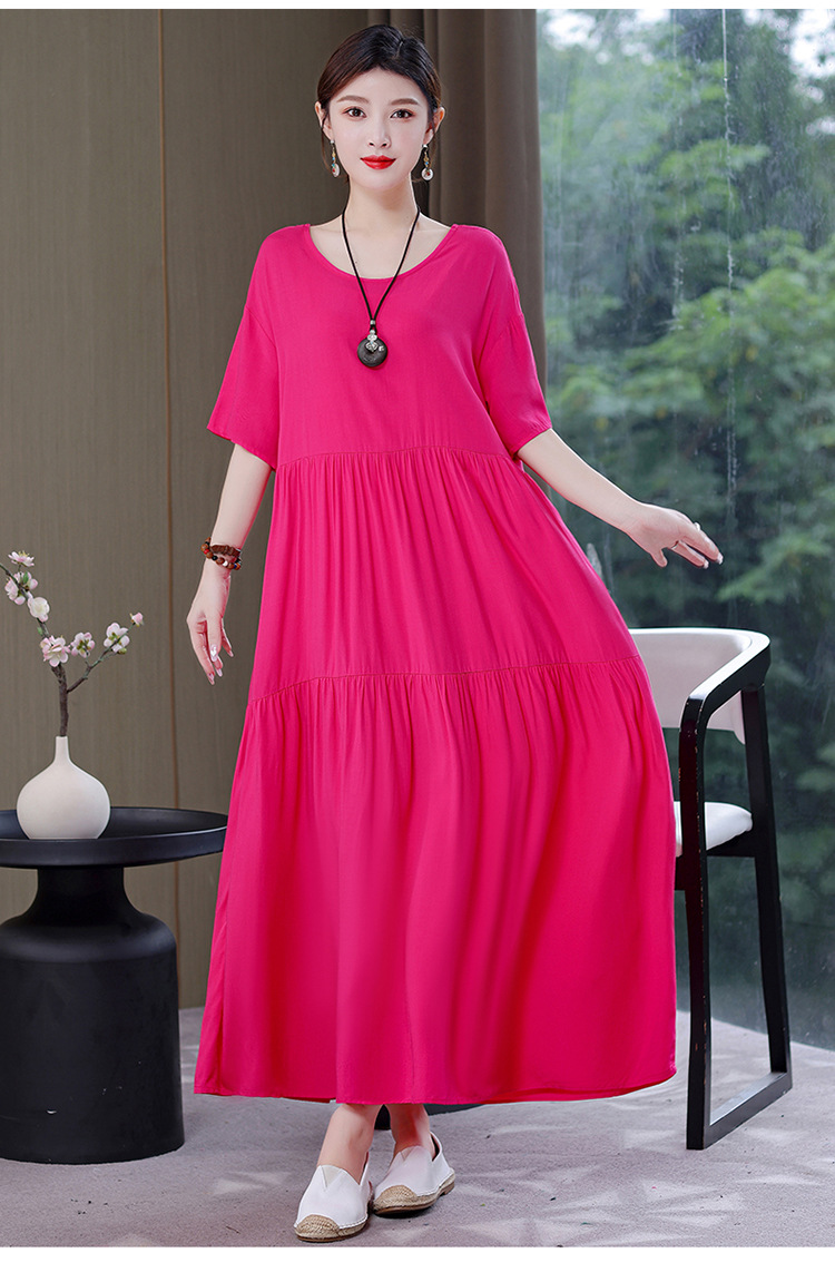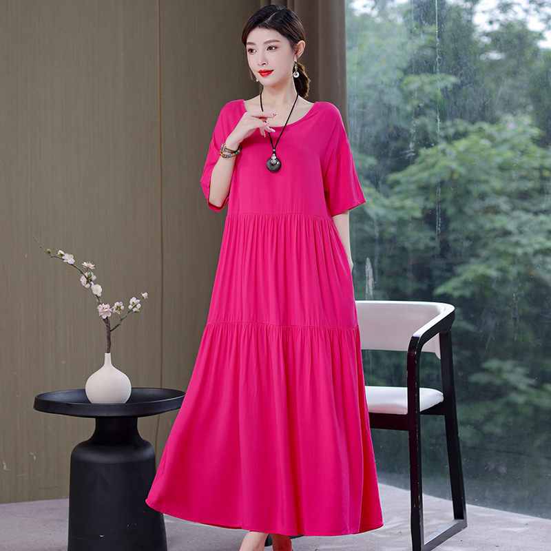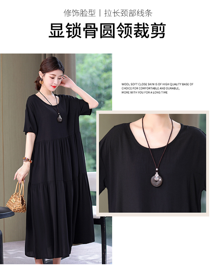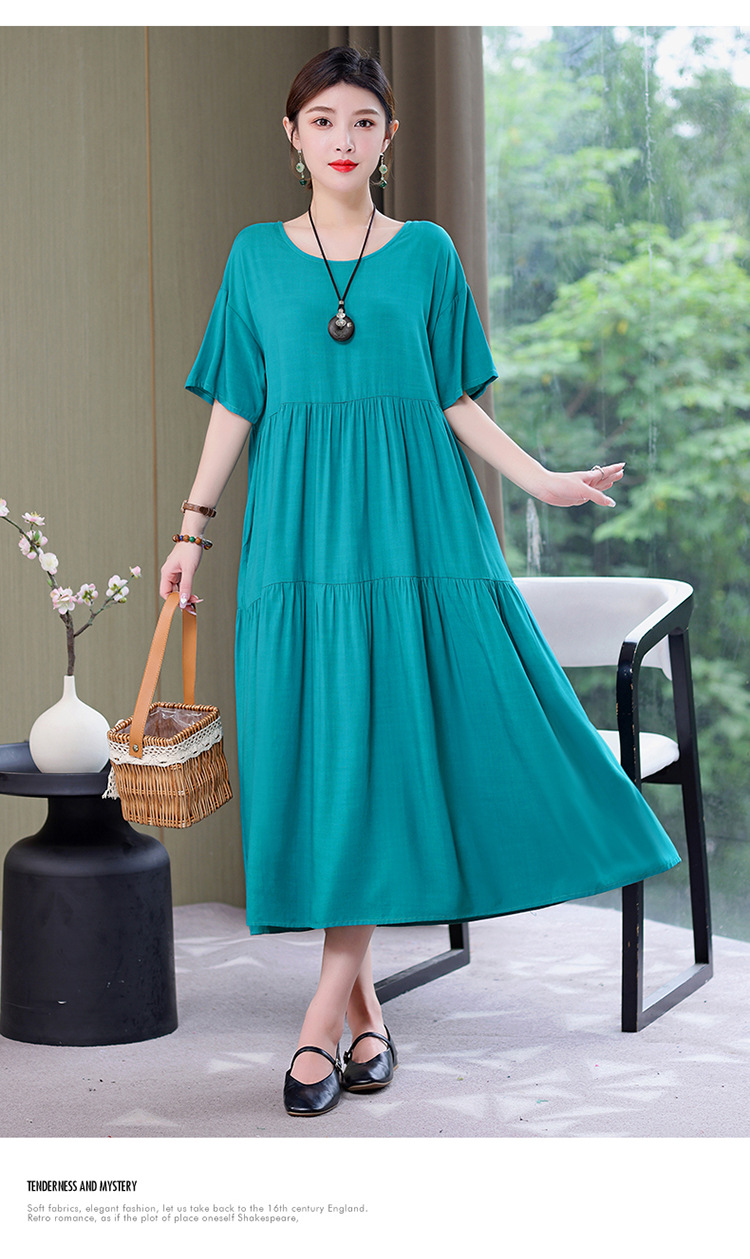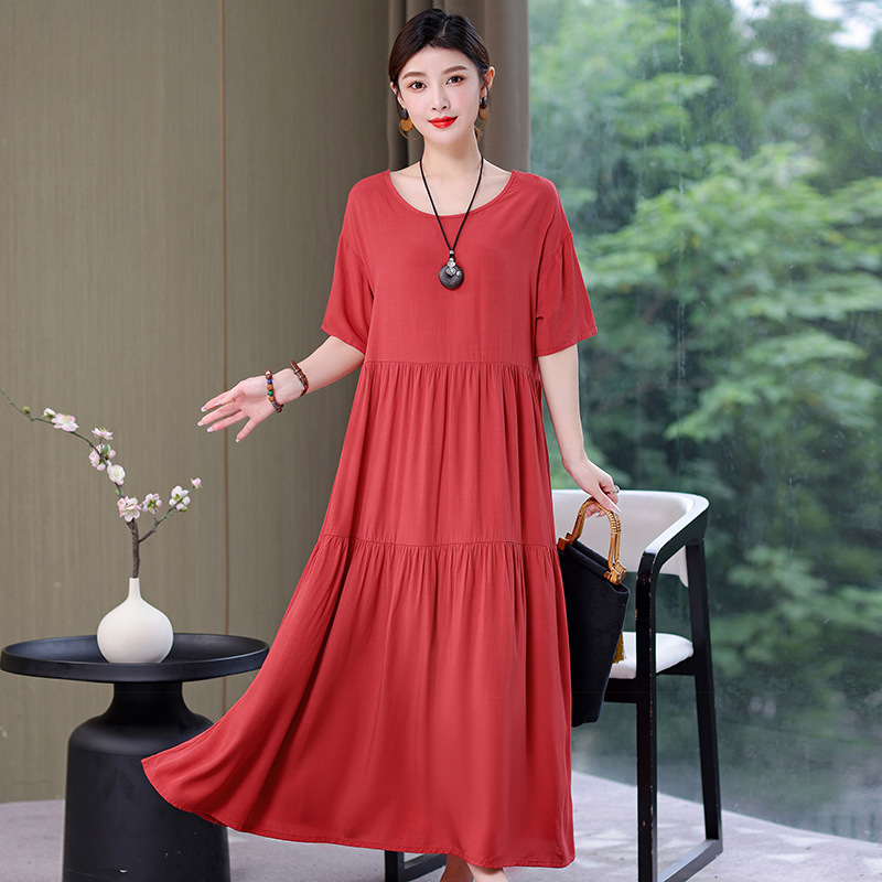 여름 새로운 솔리드 컬러 코튼 실크 원피스 여성 여름 우아한 어머니 느슨한 배 플러스 사이즈 인공 면 긴 치마스토어 가기