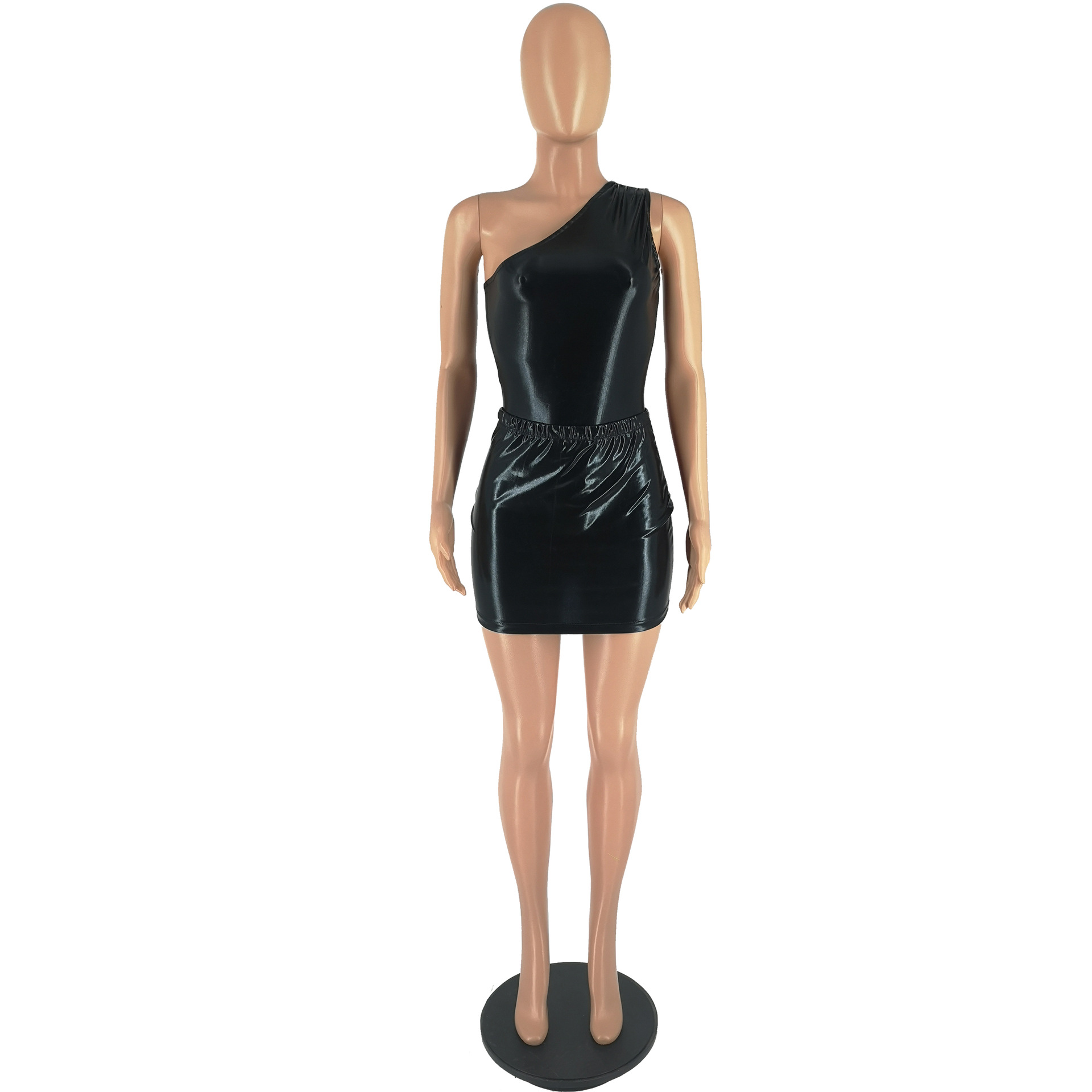 FA8335 유럽과 미국 스타일 여성의 새로운 밝은 어깨 섹시 민소매 점프 수트 + 짧은 치마 세트