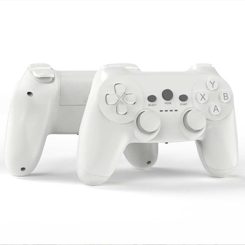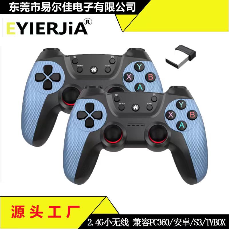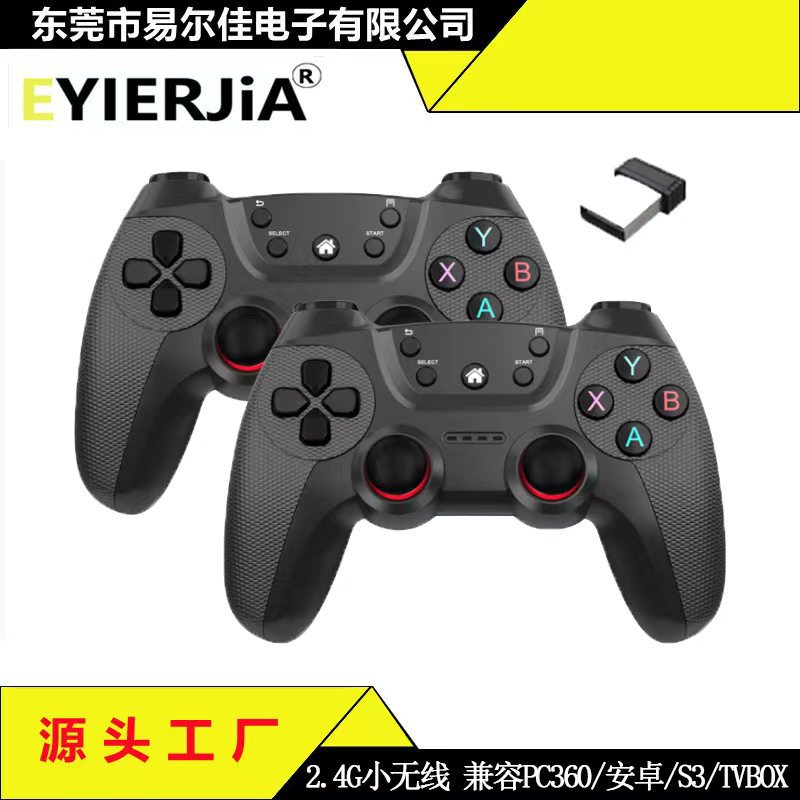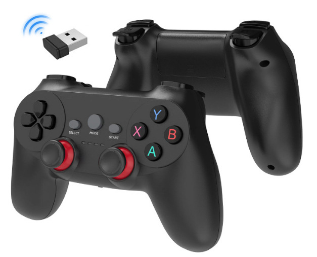 设备上插上2.4G接收器,双手柄安装上2个7号电池。(本品不配有电池)。打开手柄开关。
