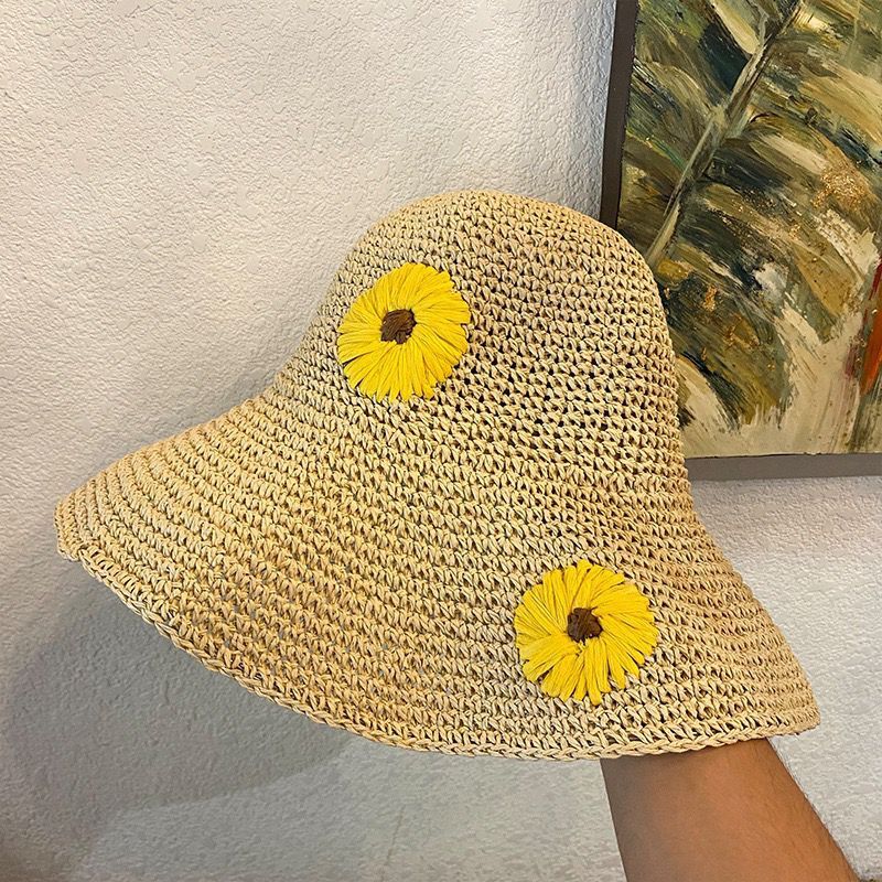 2023 봄과 여름 새로운 꽃 짠 밀짚모자 어부의 모자 여자 여름 한국식 올매치 자외선 차단제 모자스토어 가기