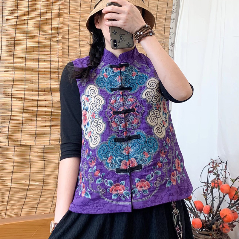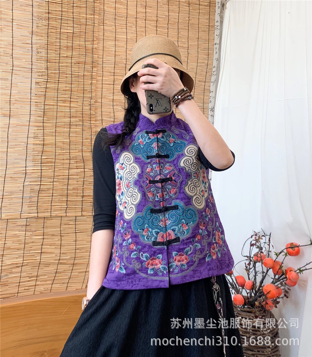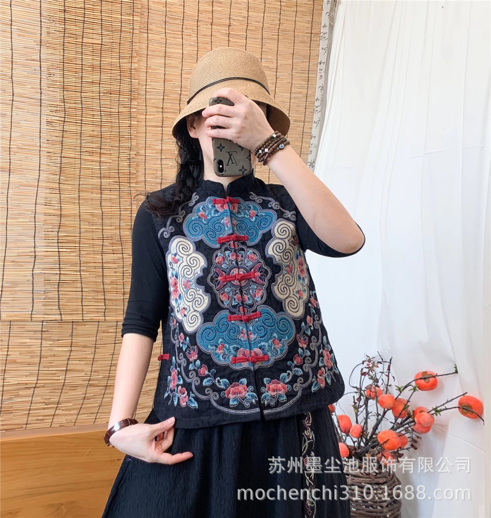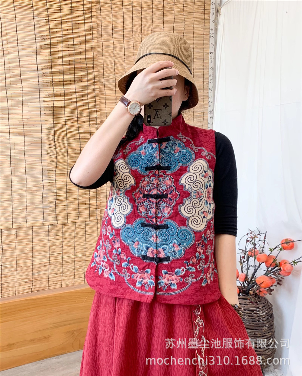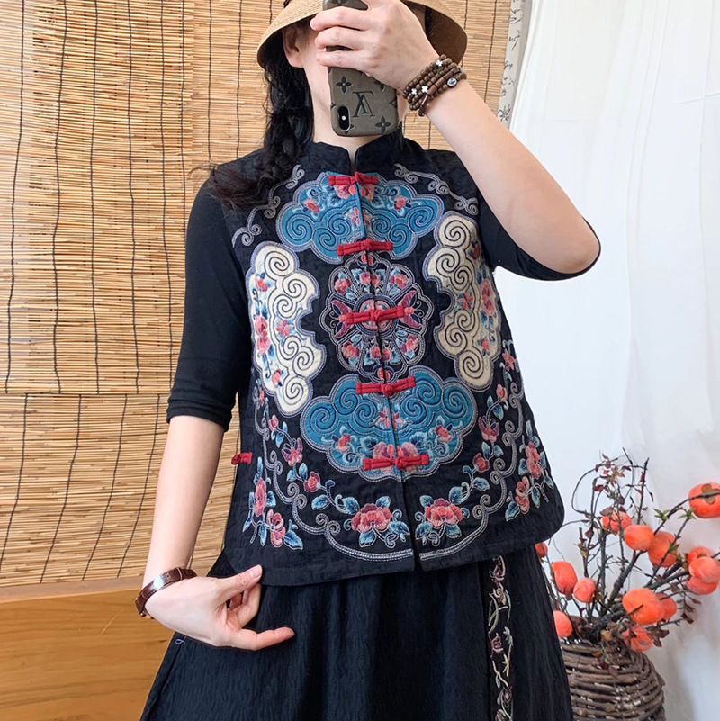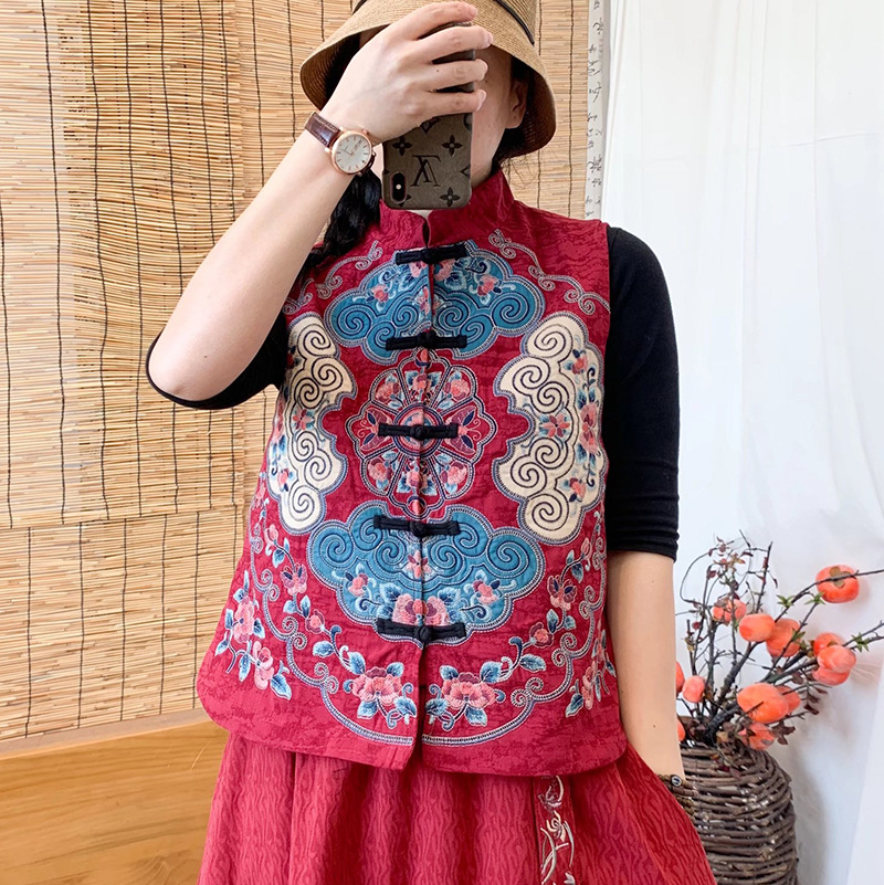 봄철 면마 자카드 민족풍 자수 용무늬 스탠드 칼라 여성용 단추 장식 전통풍 조끼스토어 가기