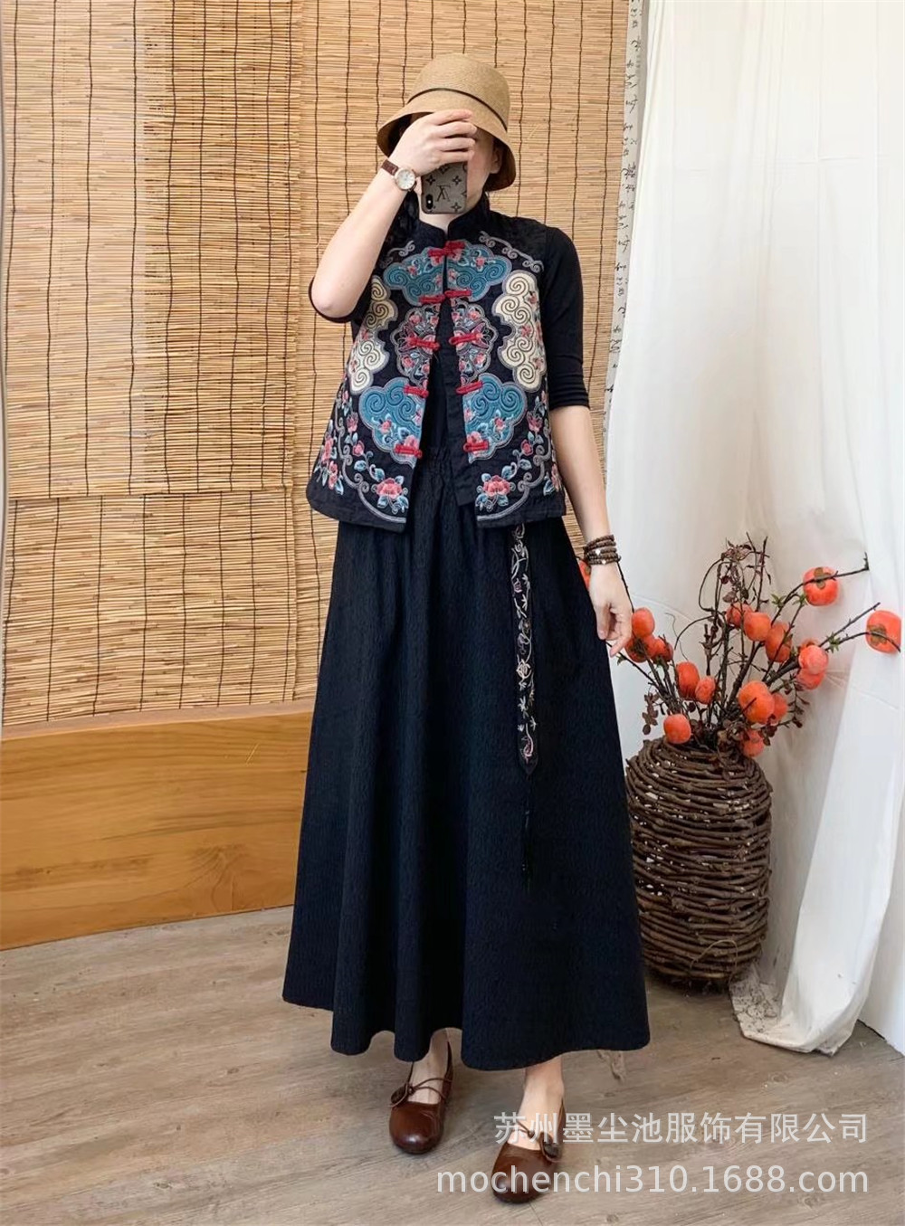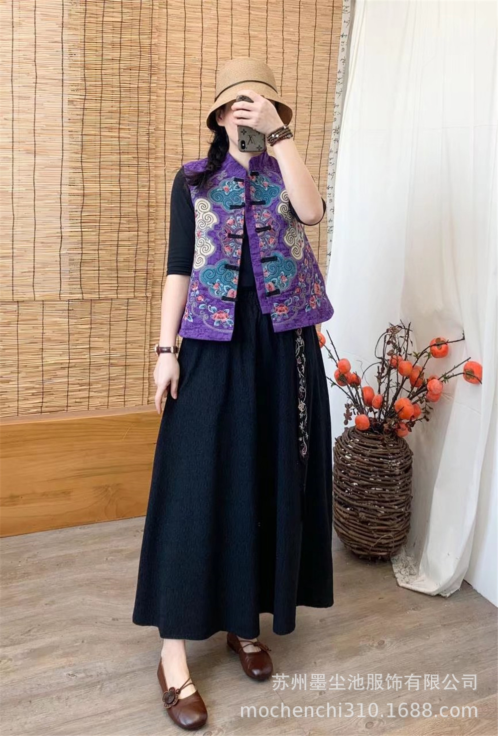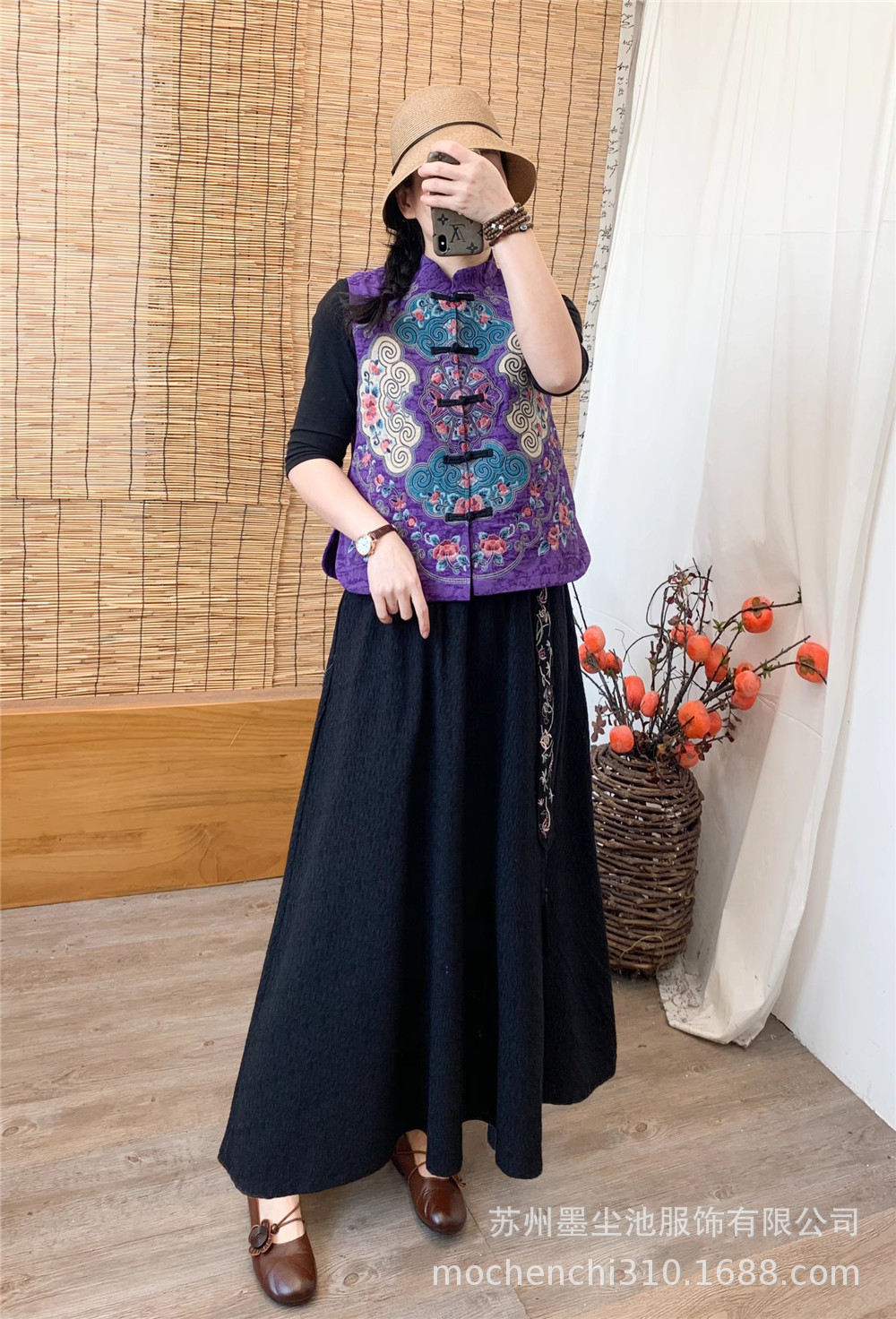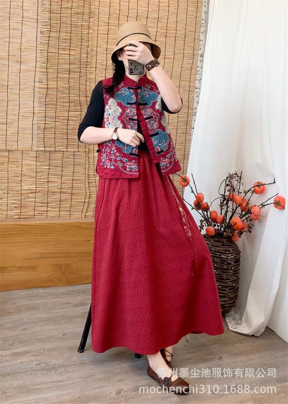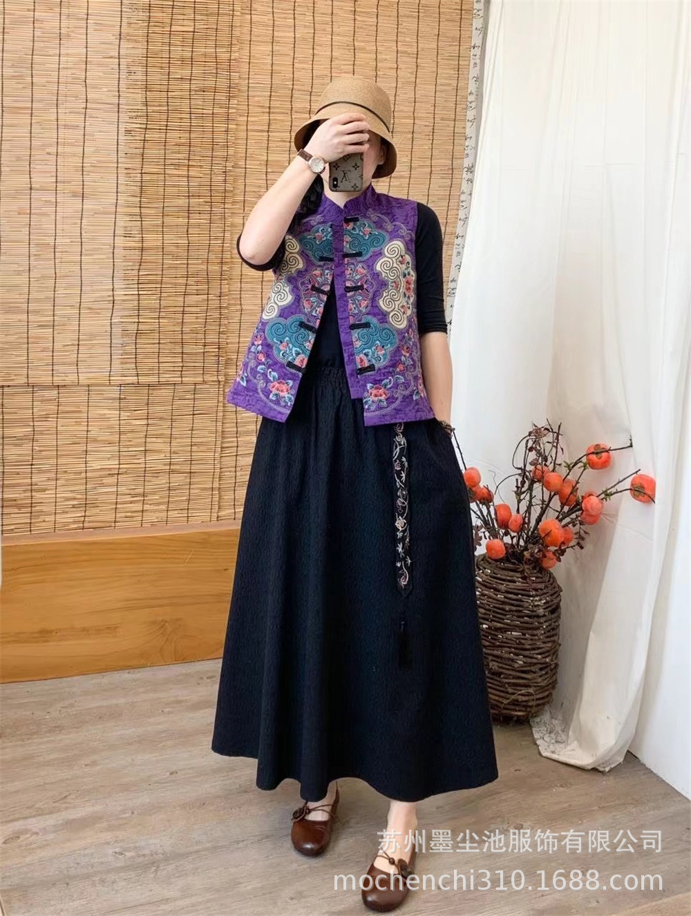 봄철 면마 자카드 민족풍 자수 용무늬 스탠드 칼라 여성용 단추 장식 전통풍 조끼스토어 가기
