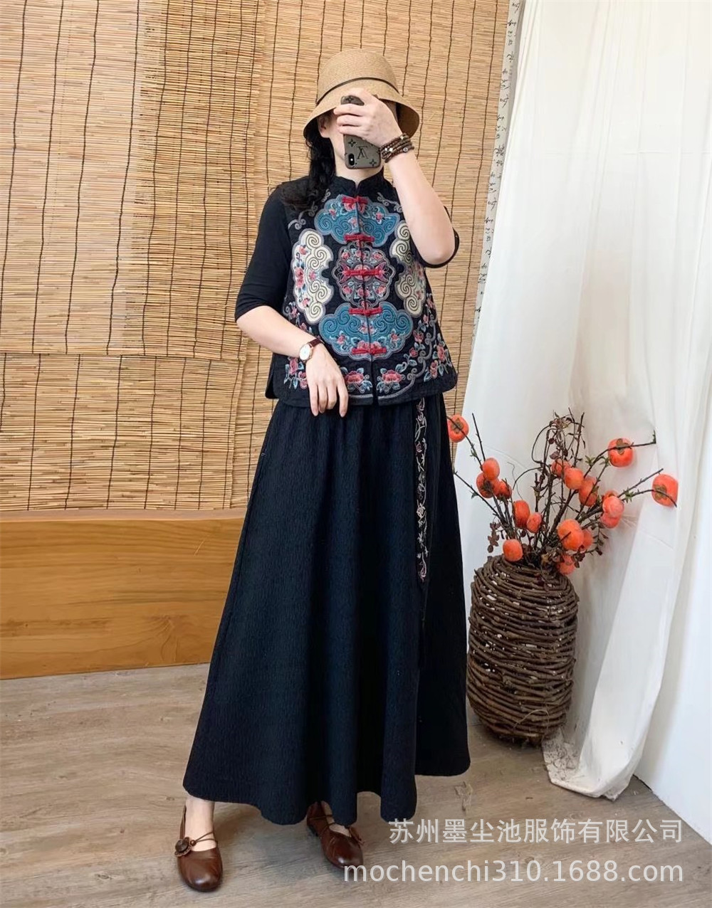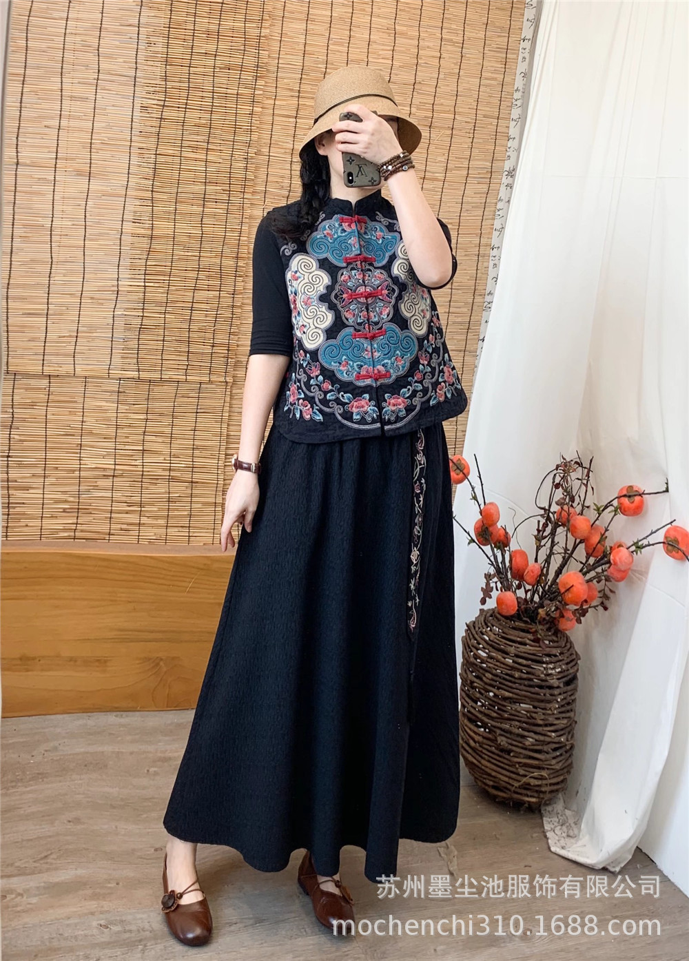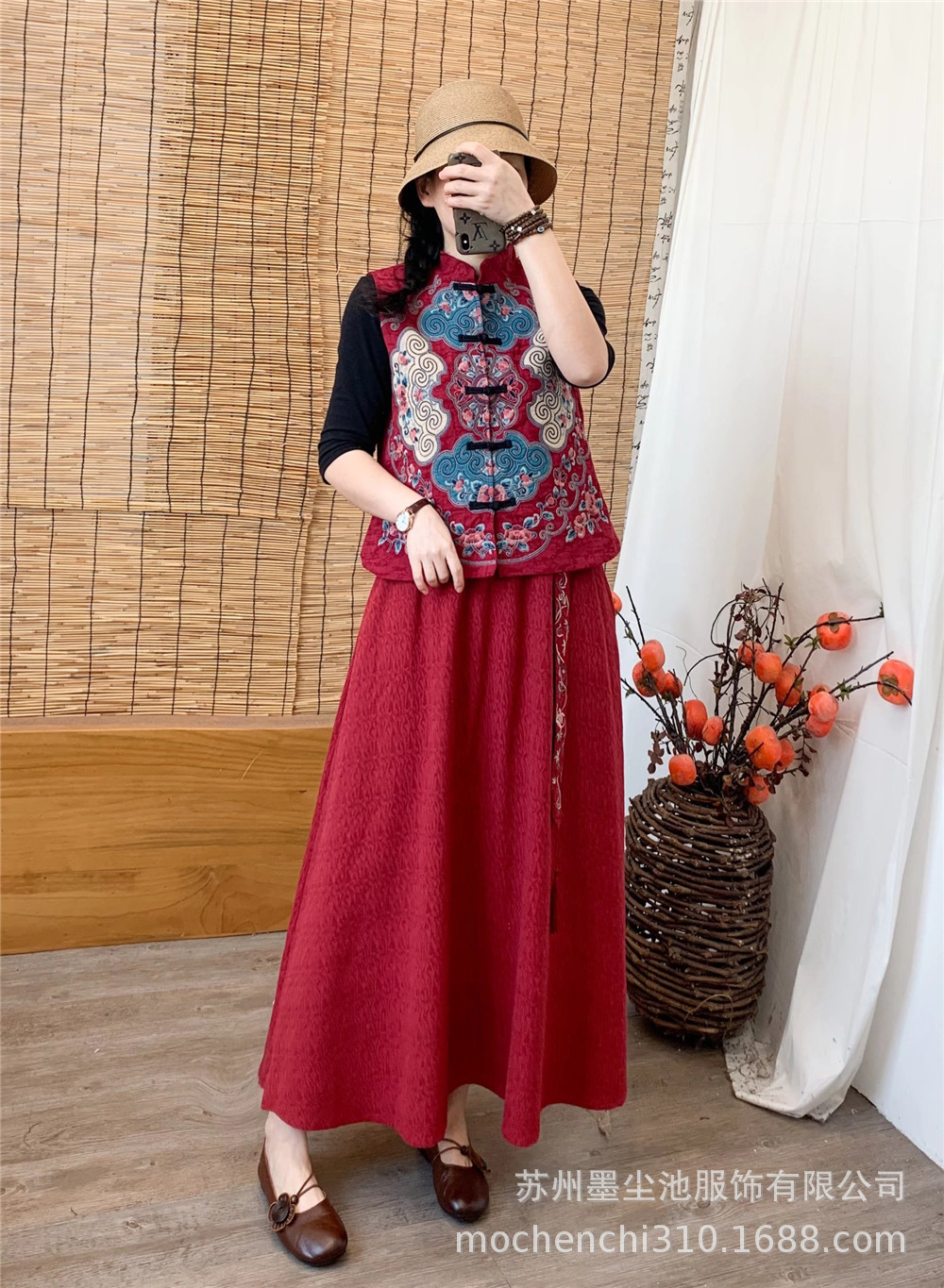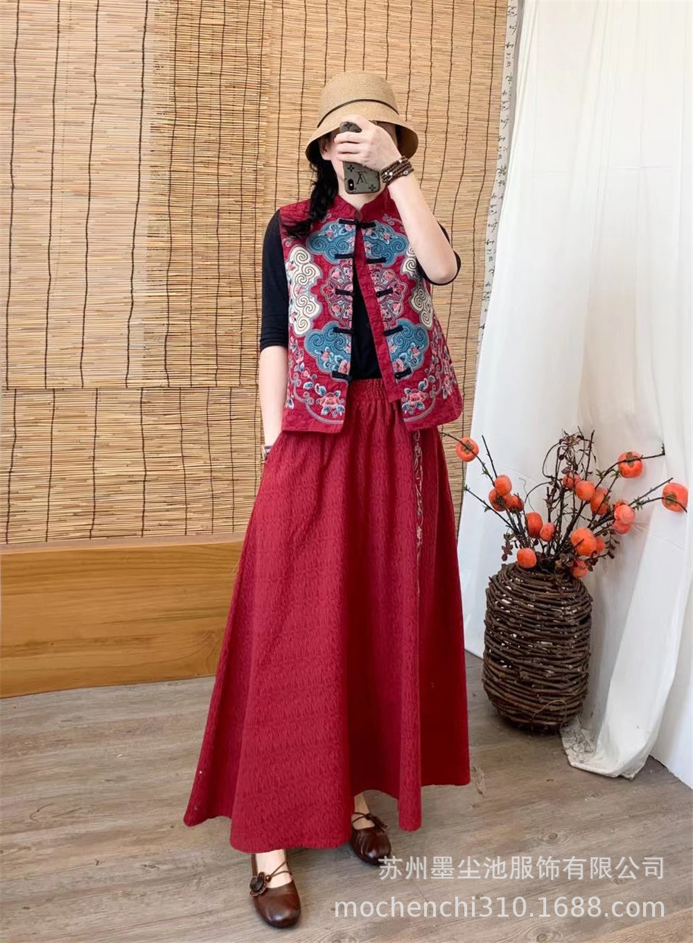 봄철 면마 자카드 민족풍 자수 용무늬 스탠드 칼라 여성용 단추 장식 전통풍 조끼스토어 가기