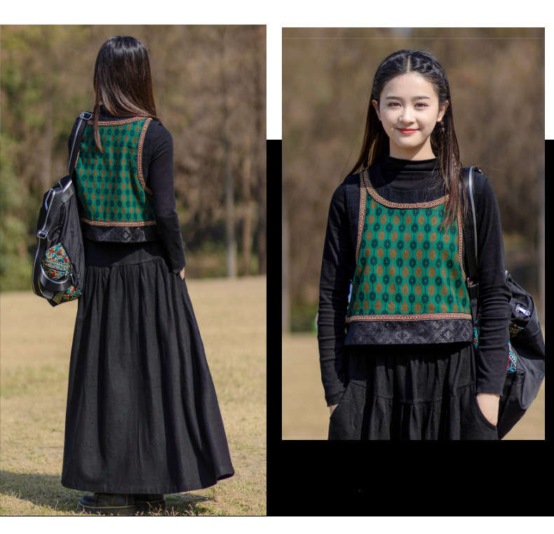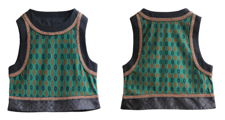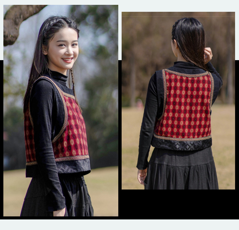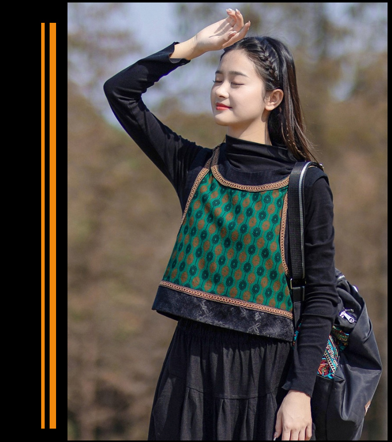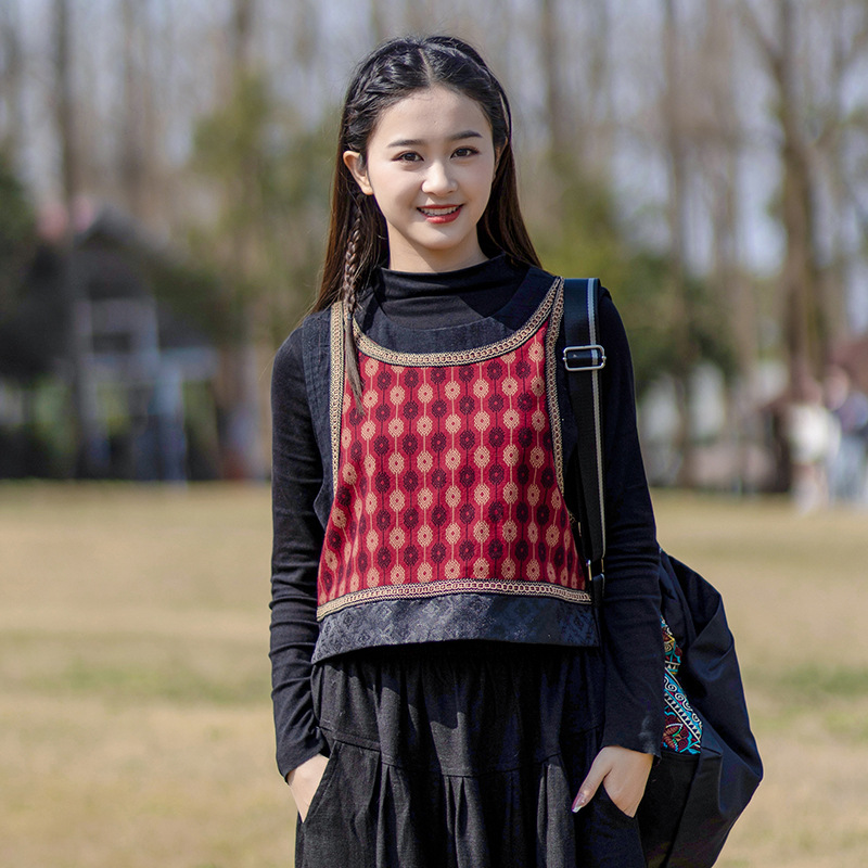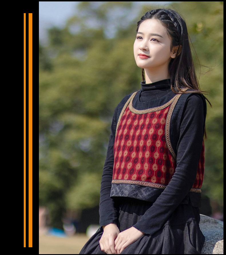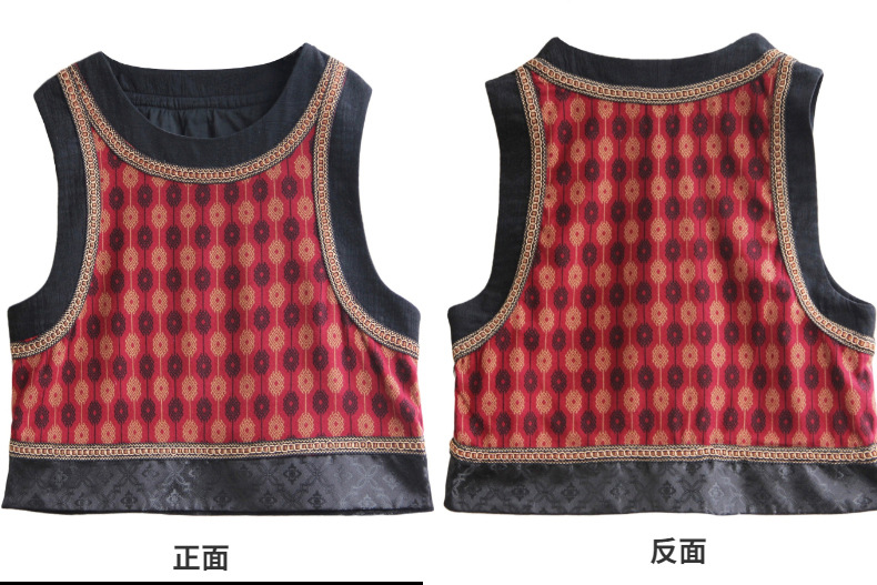 2025 가을 신상 민족풍 숏 조끼 기모면 레트로 배색 민소매 싱글 레이어 조끼 여성용