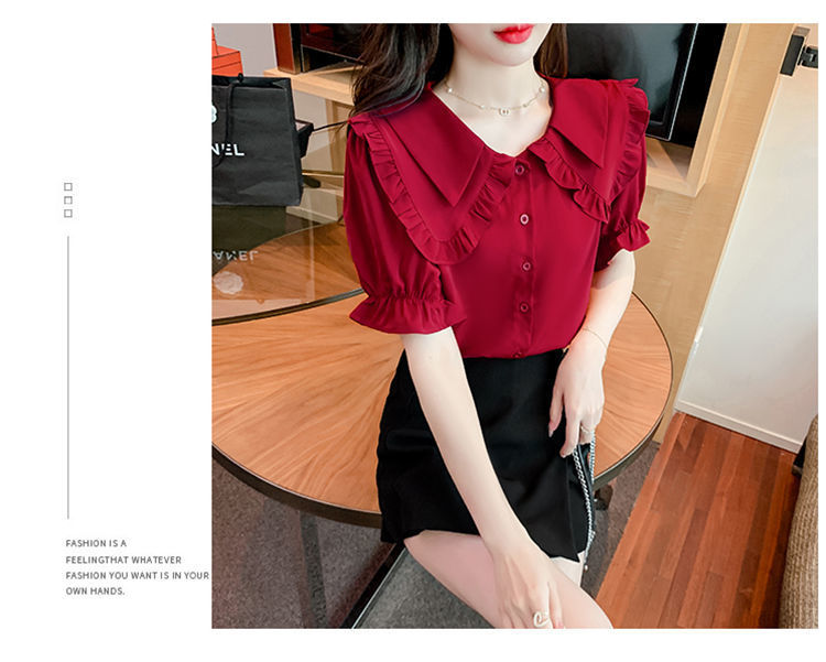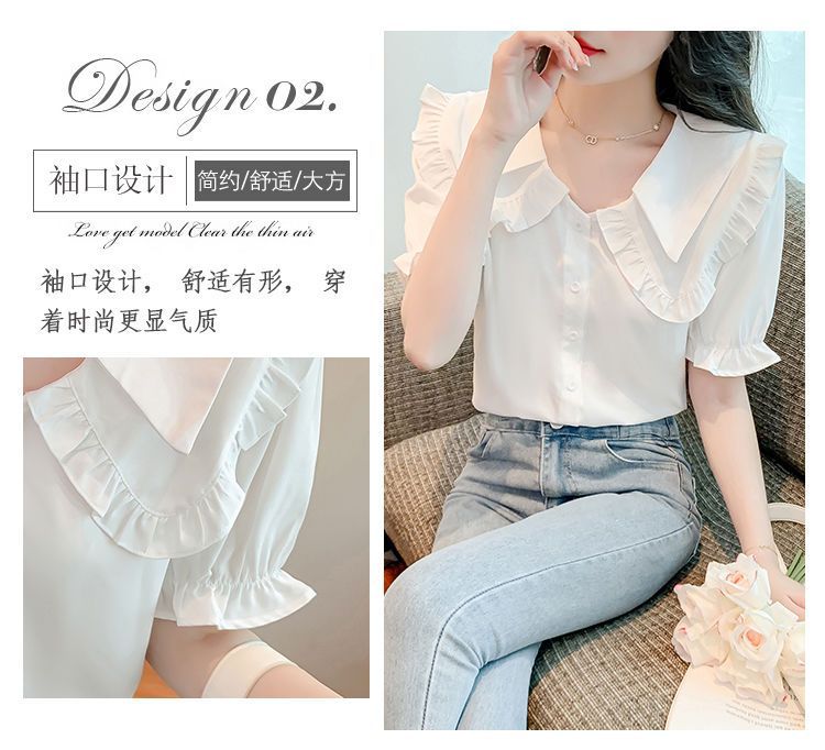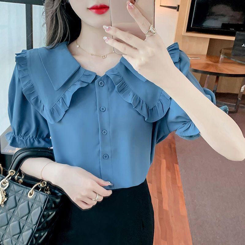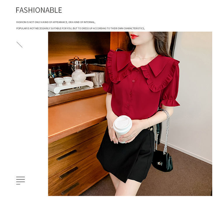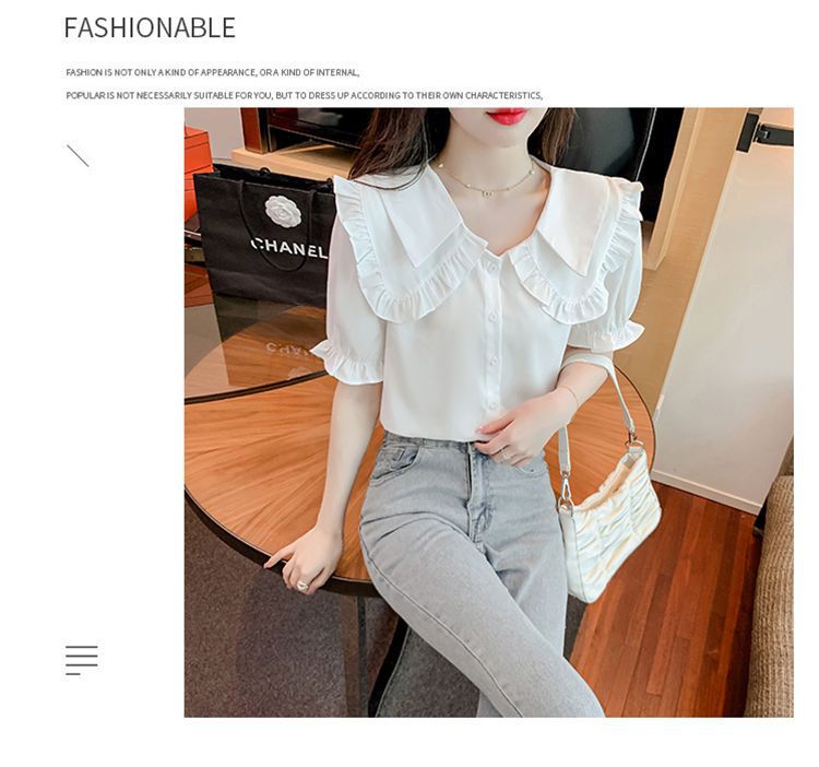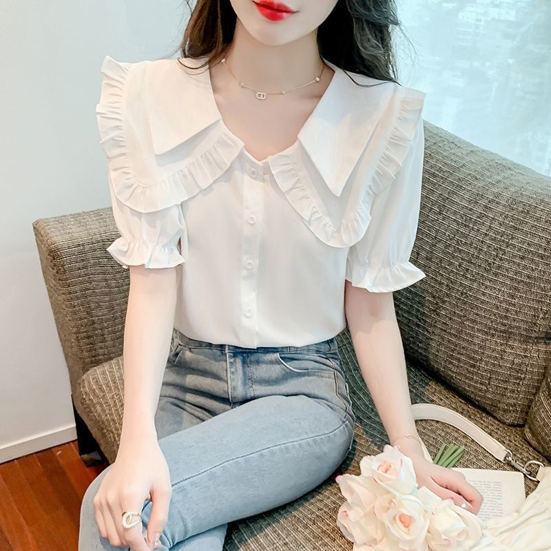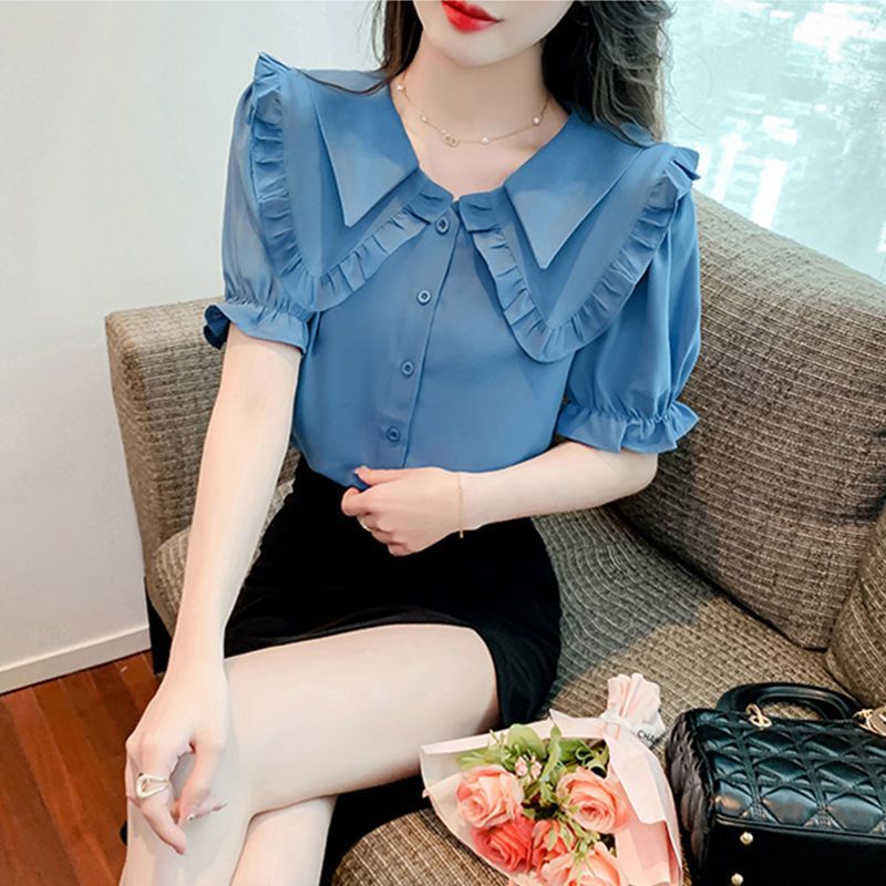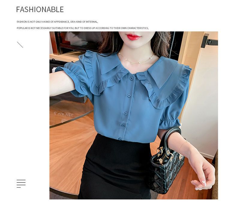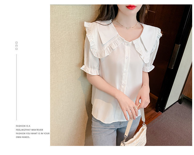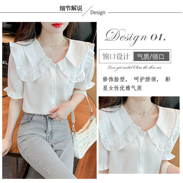 더블 레이어 인형 칼라 반팔 쉬폰 셔츠 여성용 2022 여름 새로운 한국 스타일 느슨한 유행 우아한 여성 탑스토어 가기