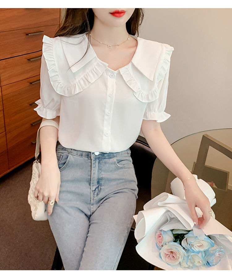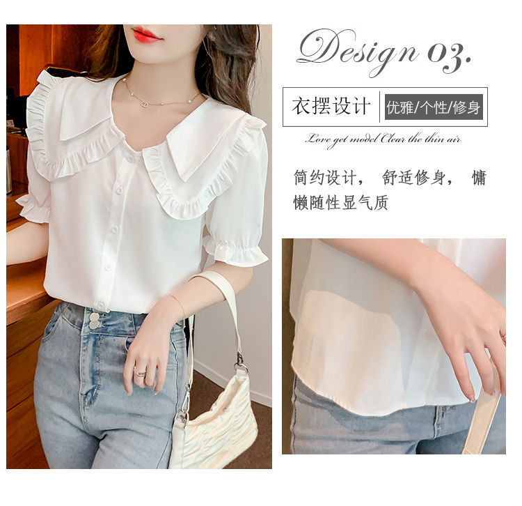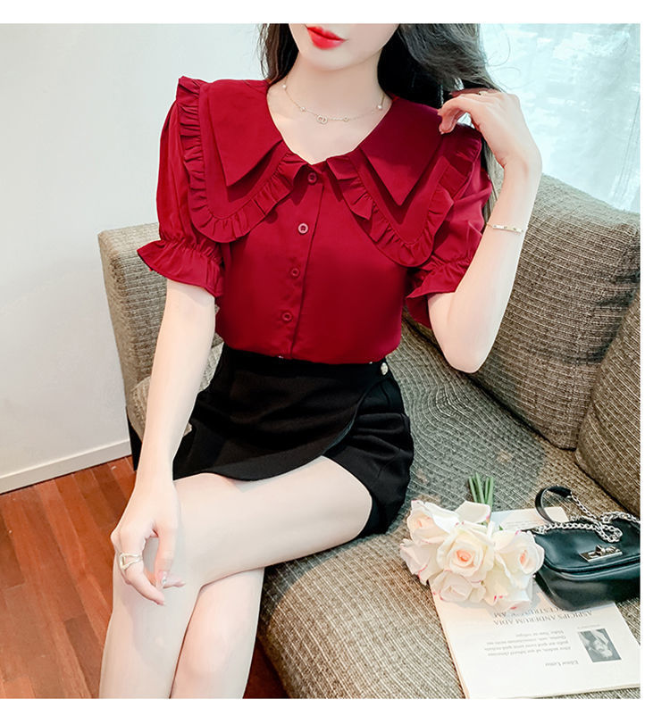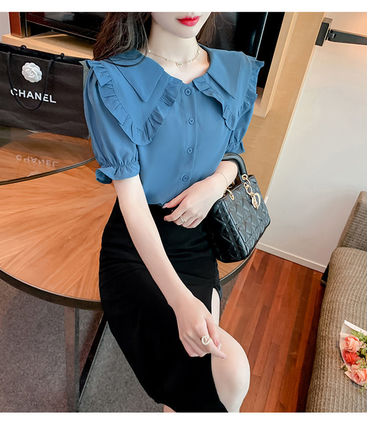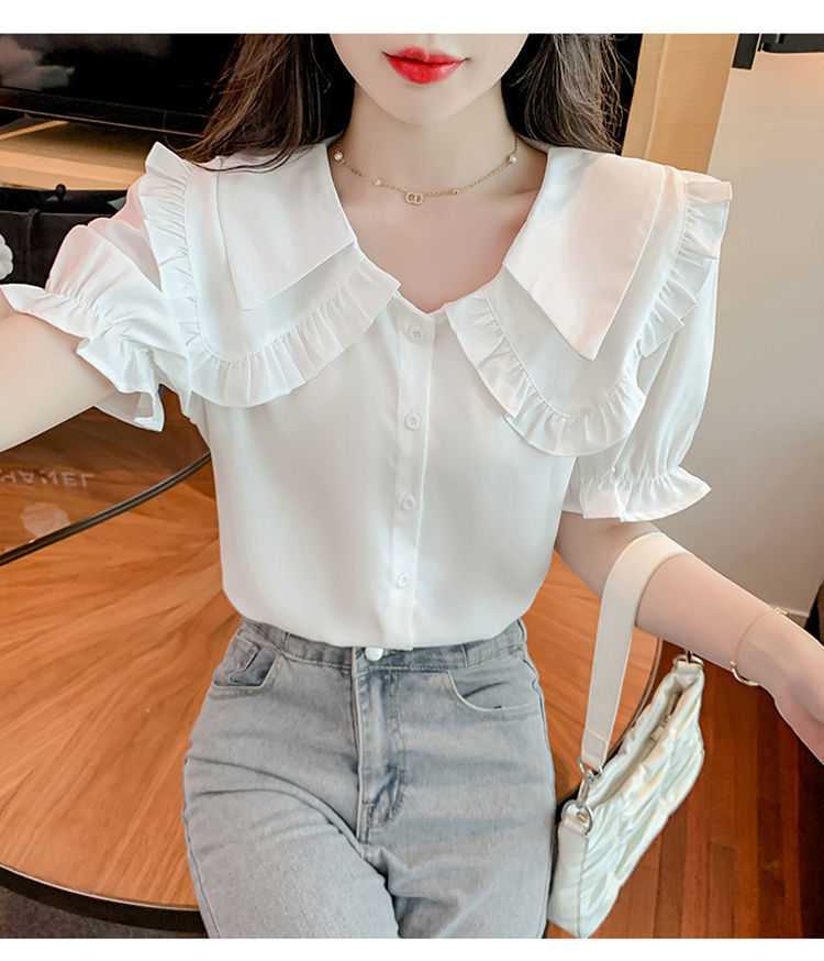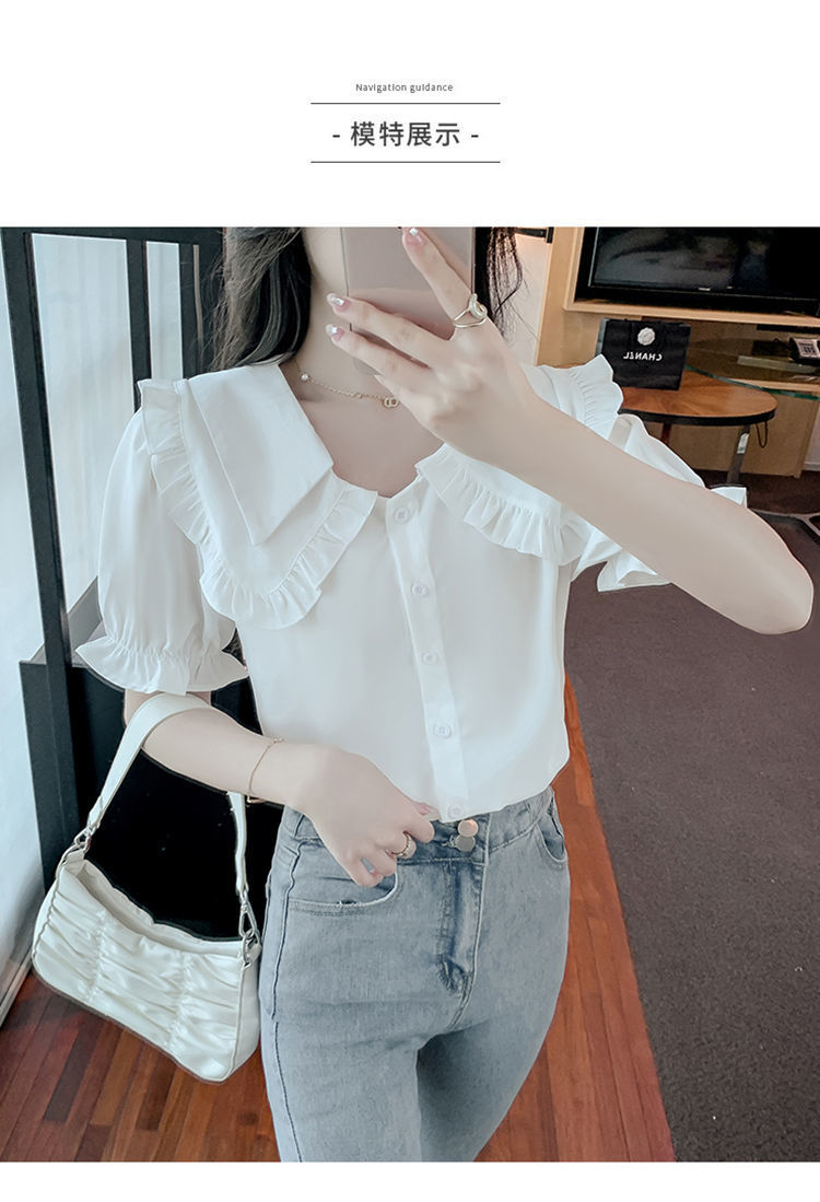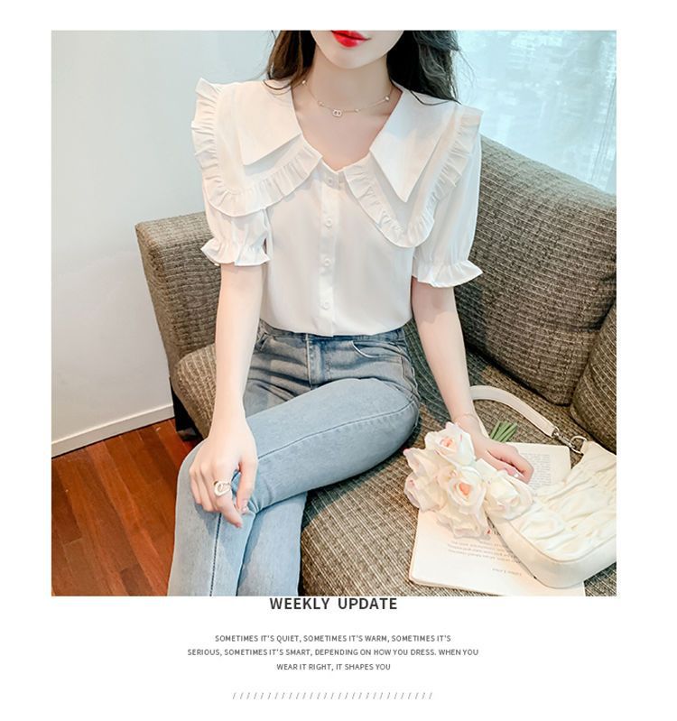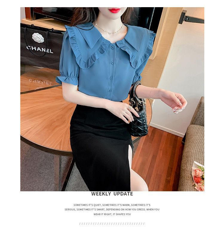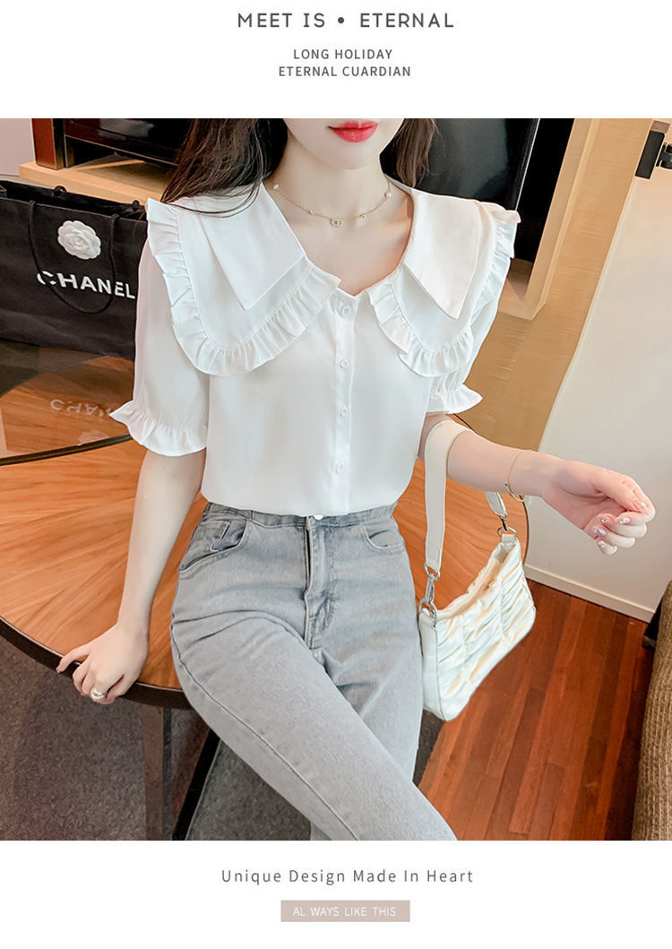 더블 레이어 인형 칼라 반팔 쉬폰 셔츠 여성용 2022 여름 새로운 한국 스타일 느슨한 유행 우아한 여성 탑스토어 가기