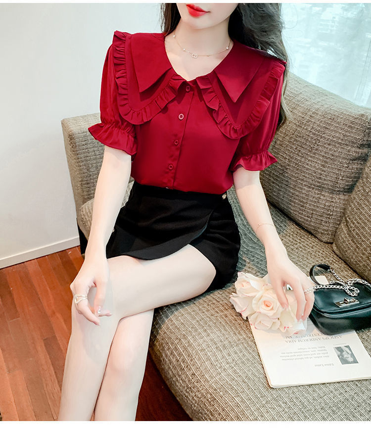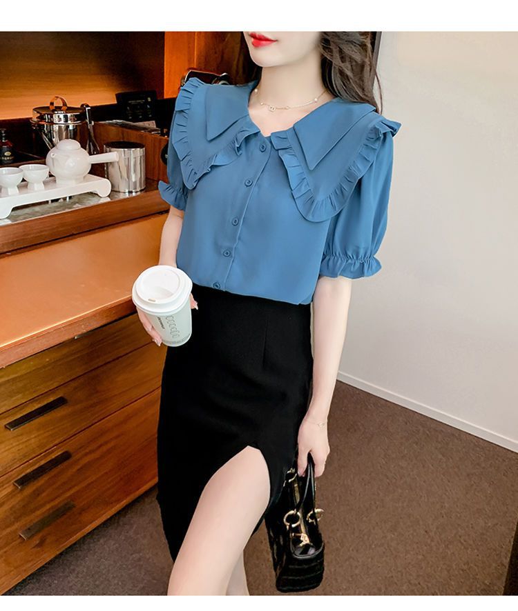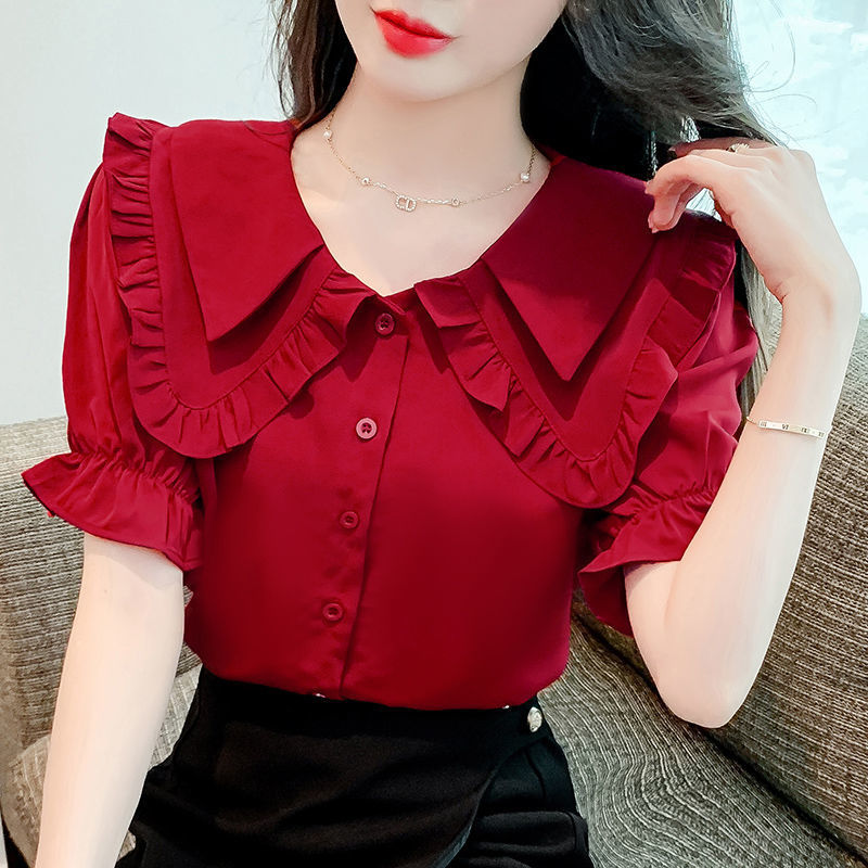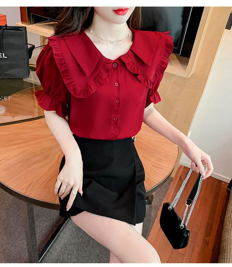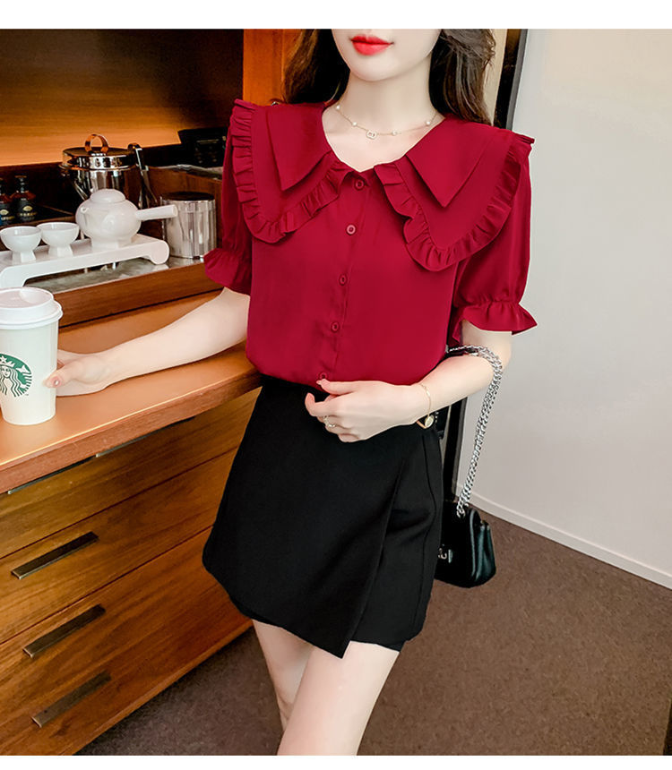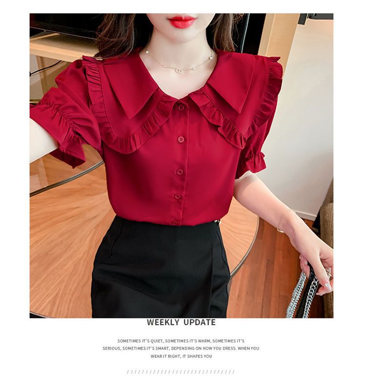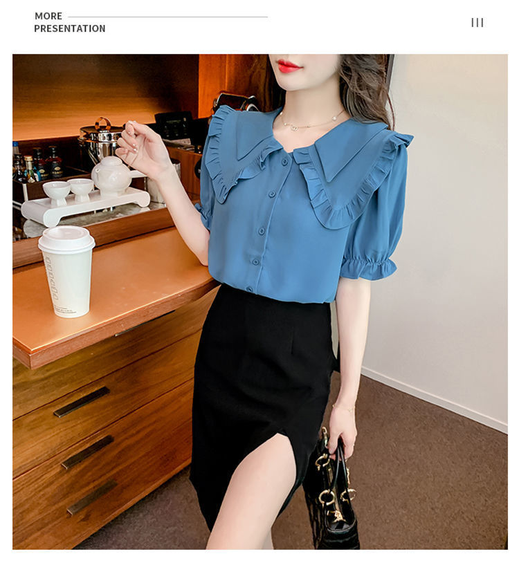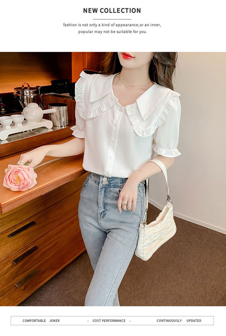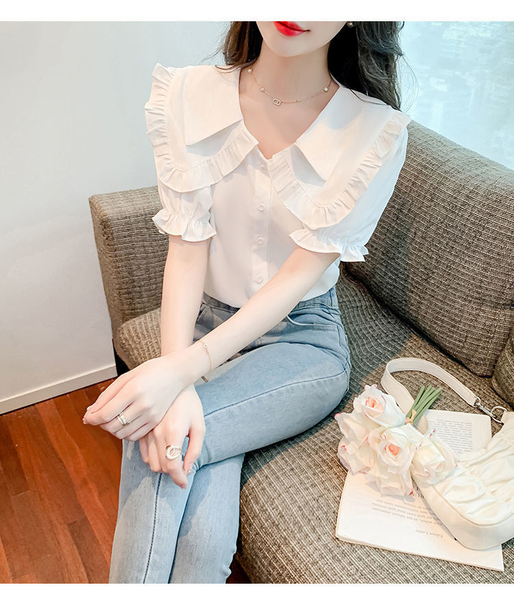 더블 레이어 인형 칼라 반팔 쉬폰 셔츠 여성용 2022 여름 새로운 한국 스타일 느슨한 유행 우아한 여성 탑스토어 가기