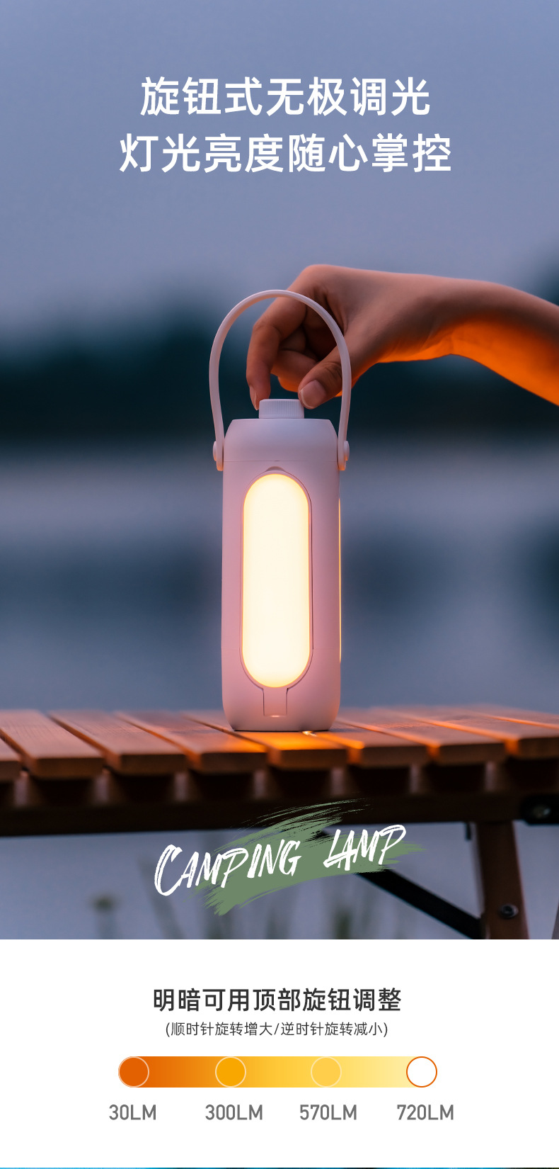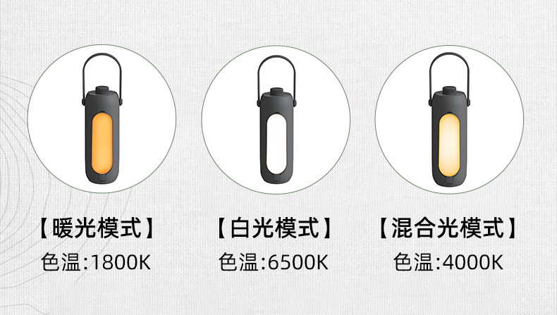 操作说明:短按旋钮按键,开启第一种暖光模式,再次短按按键,切换到白光模式,再次短按按键,切换到混合光模式,再次短按按键,切换到红色sos灯模式;双击旋钮按键,开启手电筒,再次双击旋钮按键,关闭手电筒;旋转开关按键,可调整灯灯亮度;任何模式下,长按旋钮按键即可关闭所有灯光。电量指示灯:四颗电量指示灯代表0-100的剩余电量