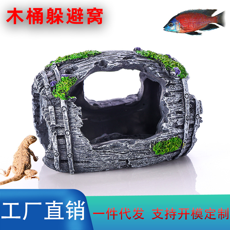 • 木桶躲避窝 跨境创意鱼缸造景装饰仿真树脂木酒桶鱼虾屋批发