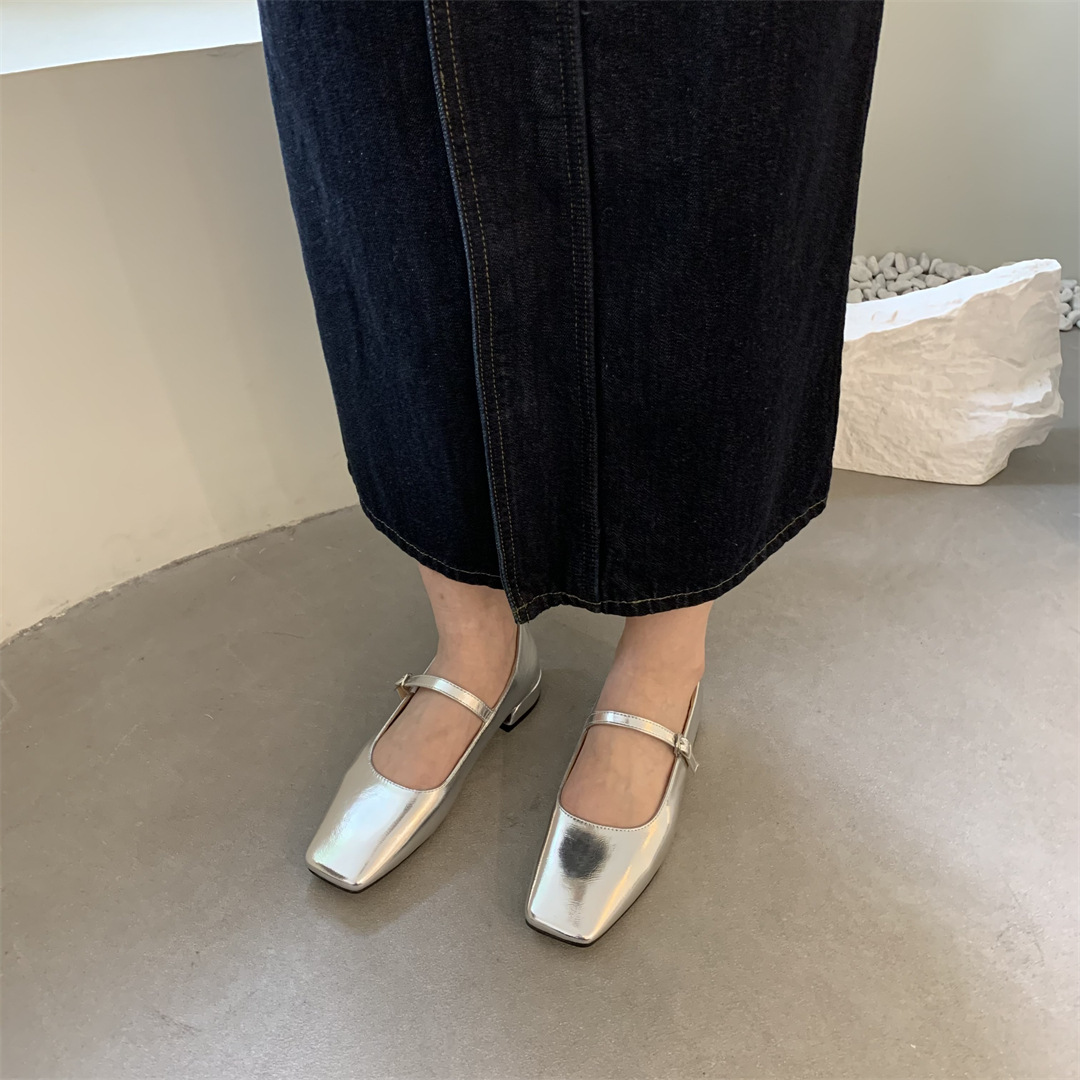 빅 미스 다이어리 ~ 프렌치 틈새 스퀘어 헤드 실버 작은 가죽 신발 봄 낮은 굽 두꺼운 굽 얕은 입 메리 제인 싱글 슈즈 여성