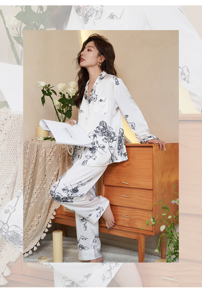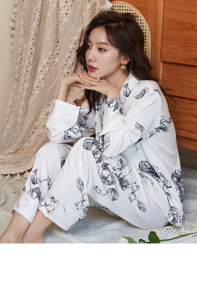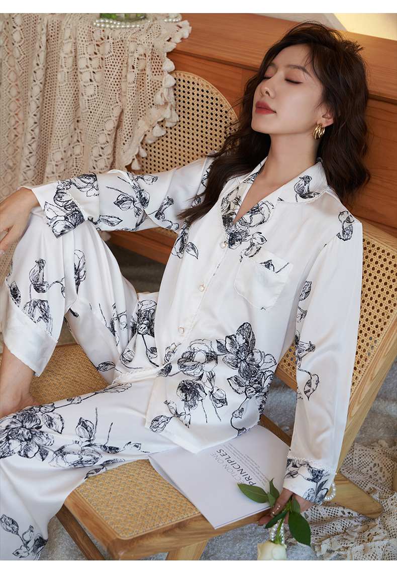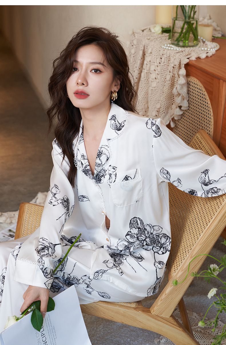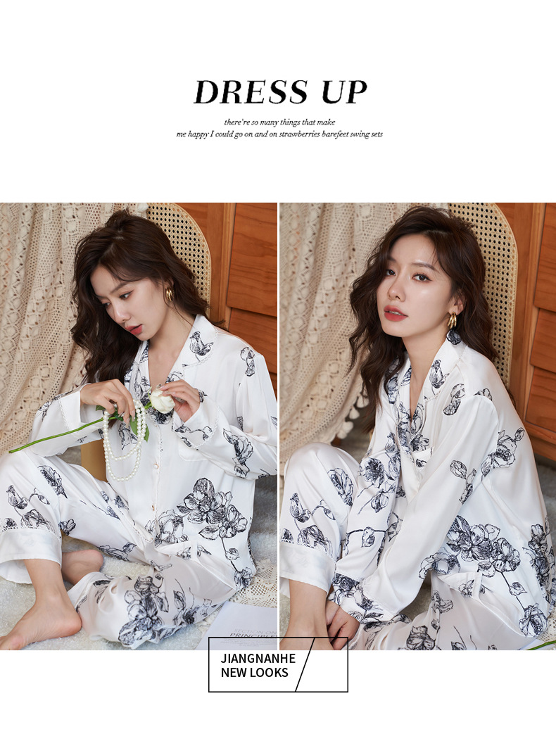 강남허 2025 봄 가을 프렌치 스타일 달달이 레이스 장식 긴팔 긴바지 아이스 실크 잠옷 여성 홈웨어 세트스토어 가기