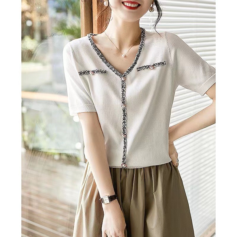 2023 봄과 여름 크로스 보더 여성용 니트웨어 새로운 한국식 브이넥 샤넬 스타일 반팔 가디건 아우터 탑 트렌디스토어 가기