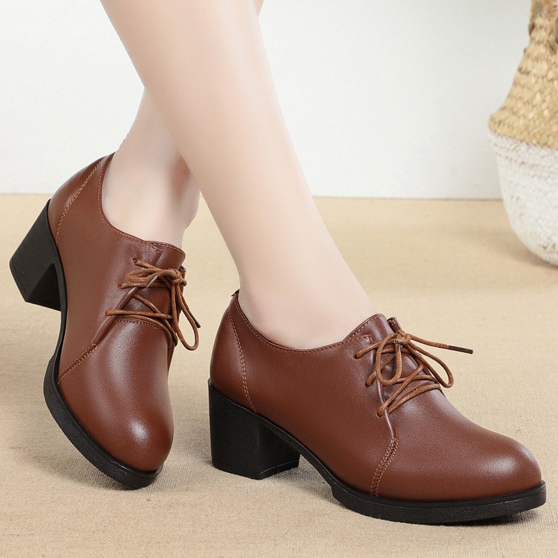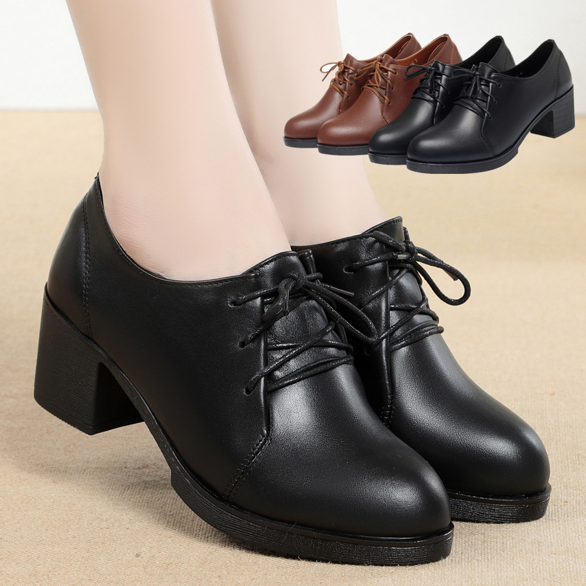 봄과 가을 새로운 싱글 슈즈 여성용 부드러운 가죽 레이스업 캐주얼 깊은 입 작업 신발 미들힐 두꺼운 굽 여성용 가죽 신발 43 어머니 신발스토어 가기