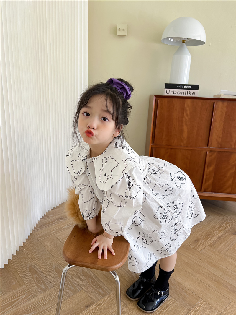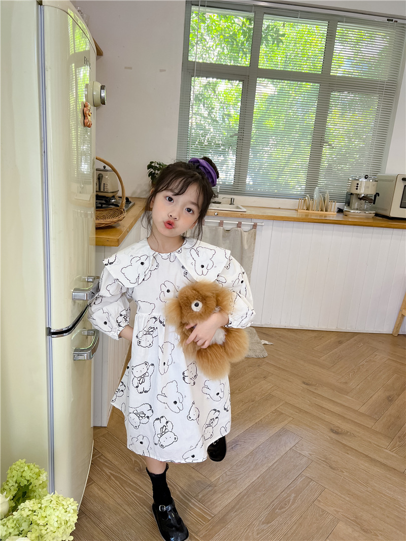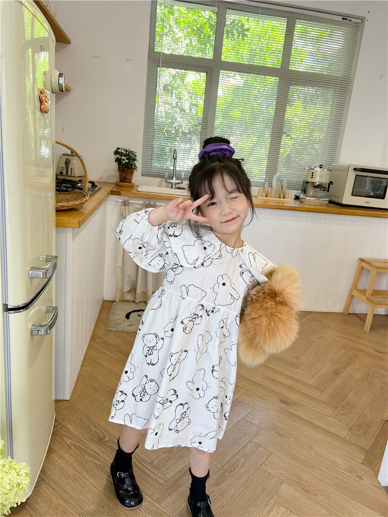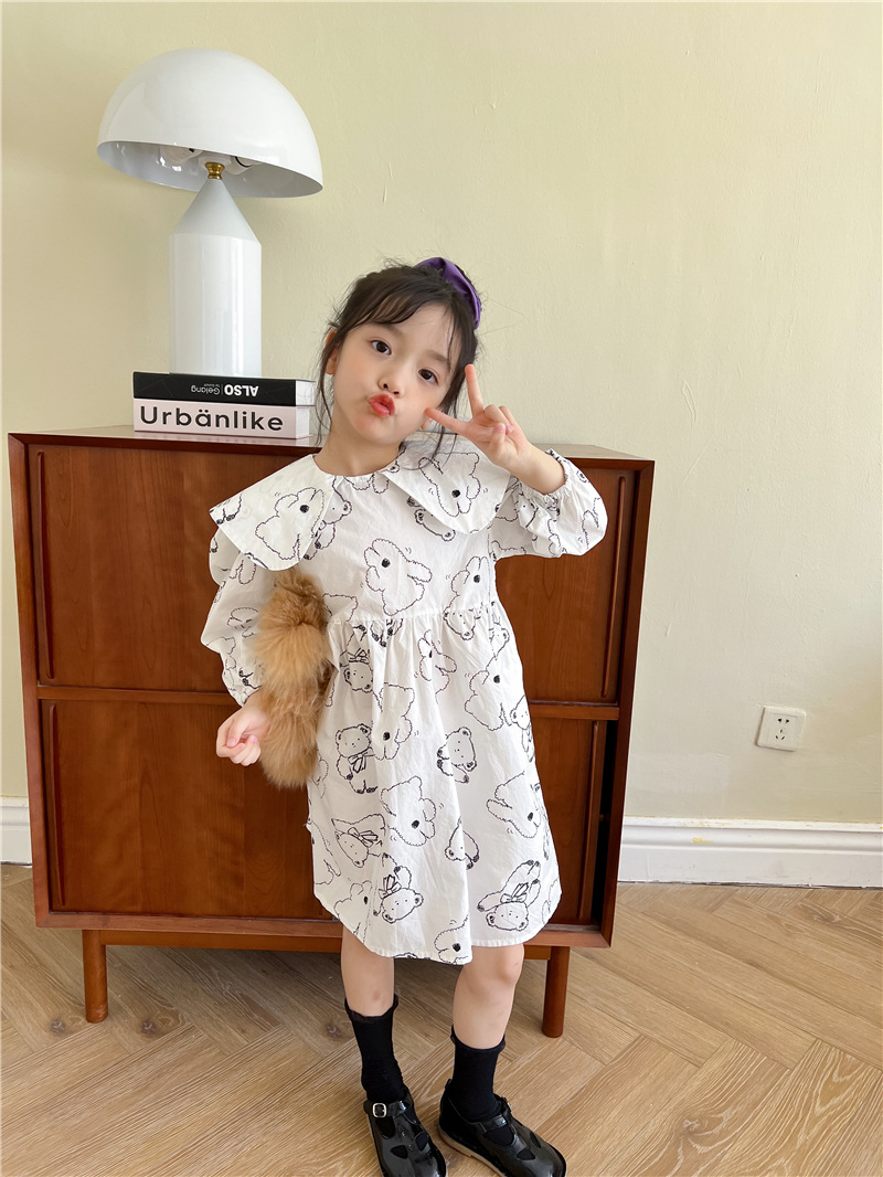 아동 의류 아동 치마 2023 여름 새로운 한국 여자 곰 프린트 원피스 외국 스타일 긴 소매 치마 Q392