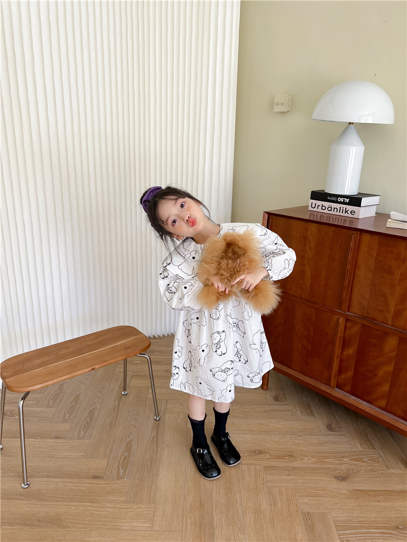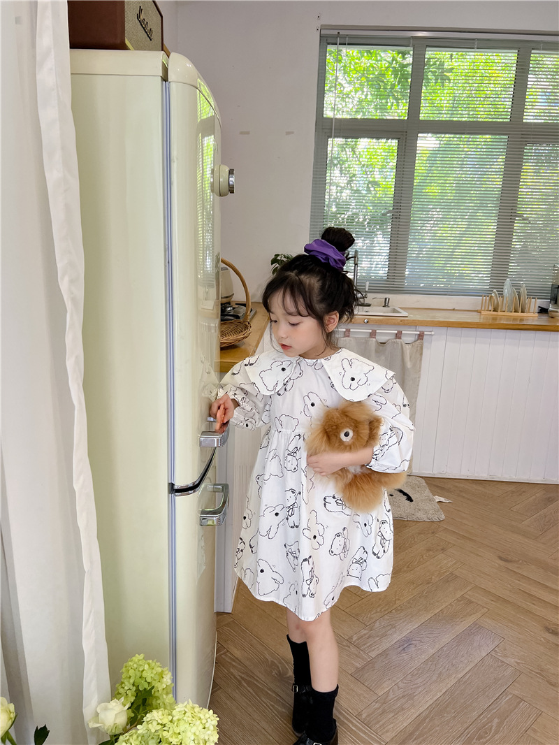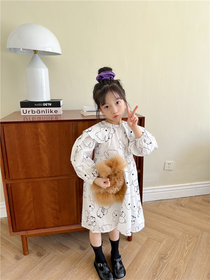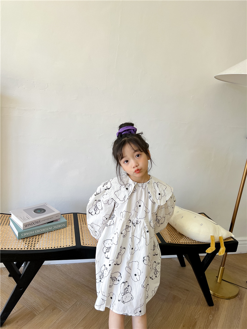 아동 의류 아동 치마 2023 여름 새로운 한국 여자 곰 프린트 원피스 외국 스타일 긴 소매 치마 Q392