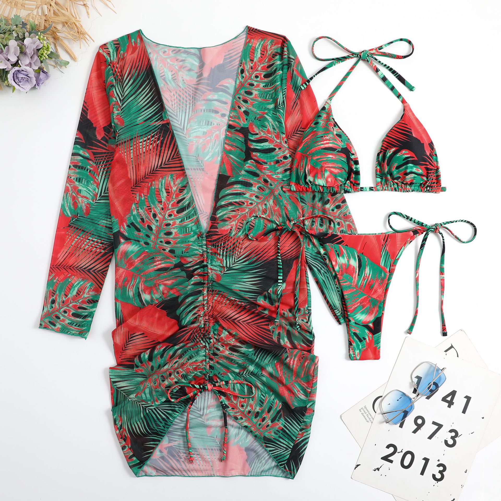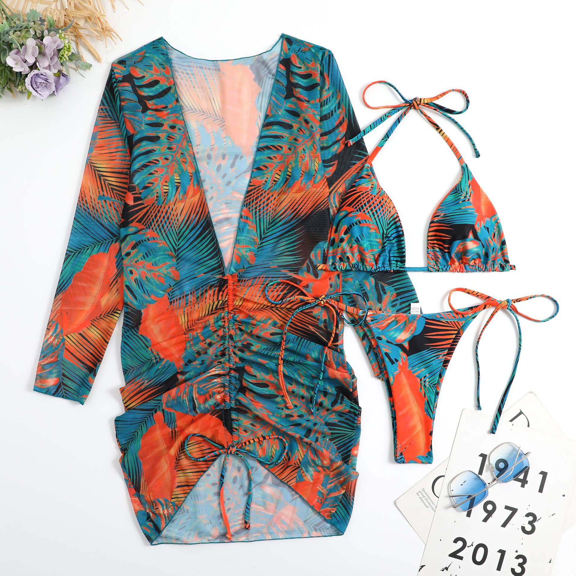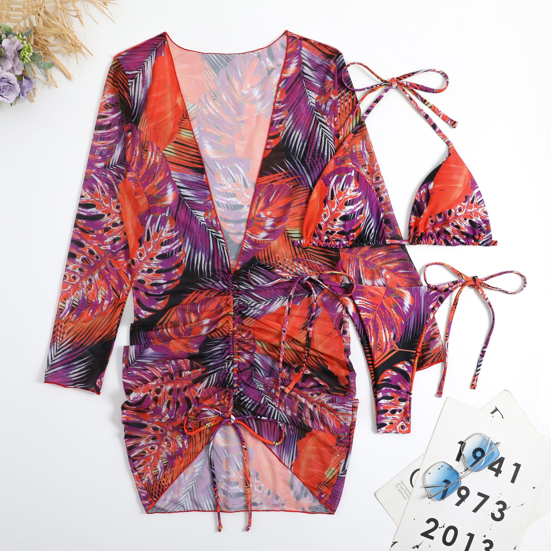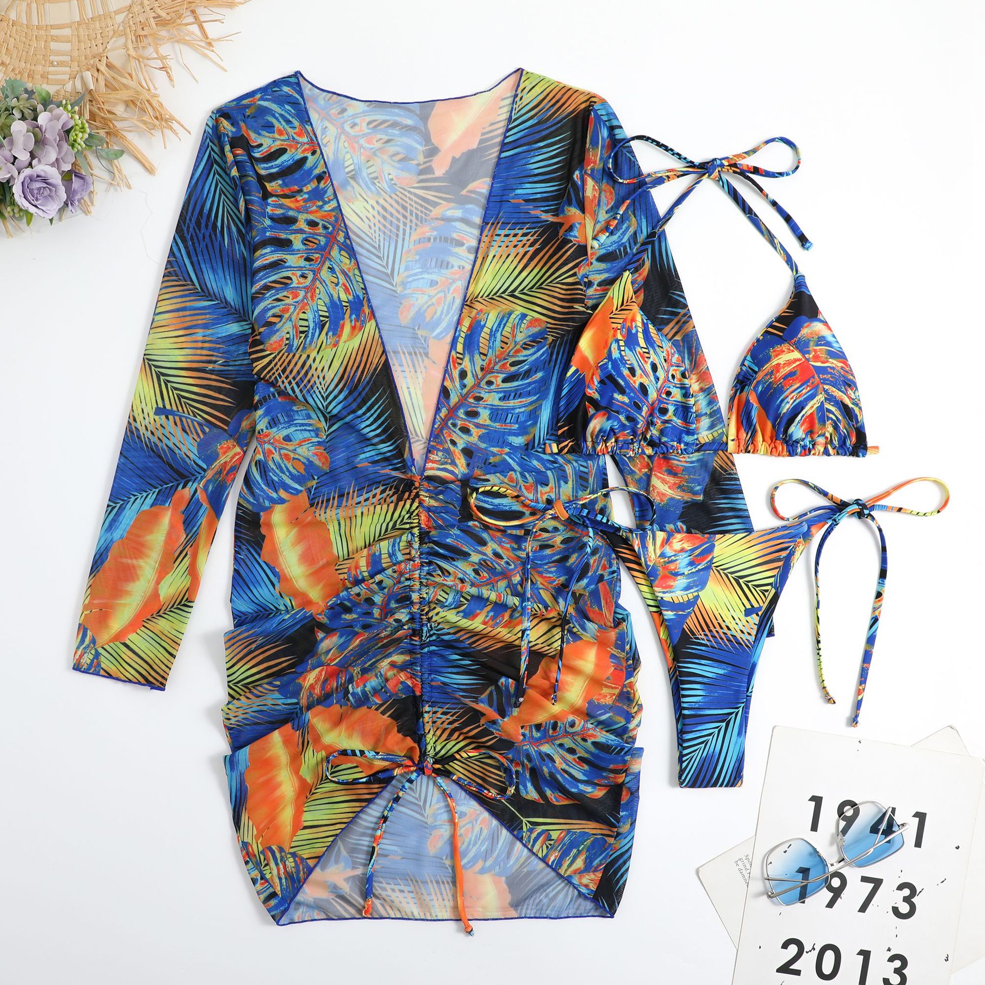 2023 유럽 및 미국 대외 무역 수영복 여성용 스플릿 쓰리 피스 세트 3 점 긴팔 in 블라우스 인터넷 연예인 크로스 보더 드로스트링 팩스토어 가기