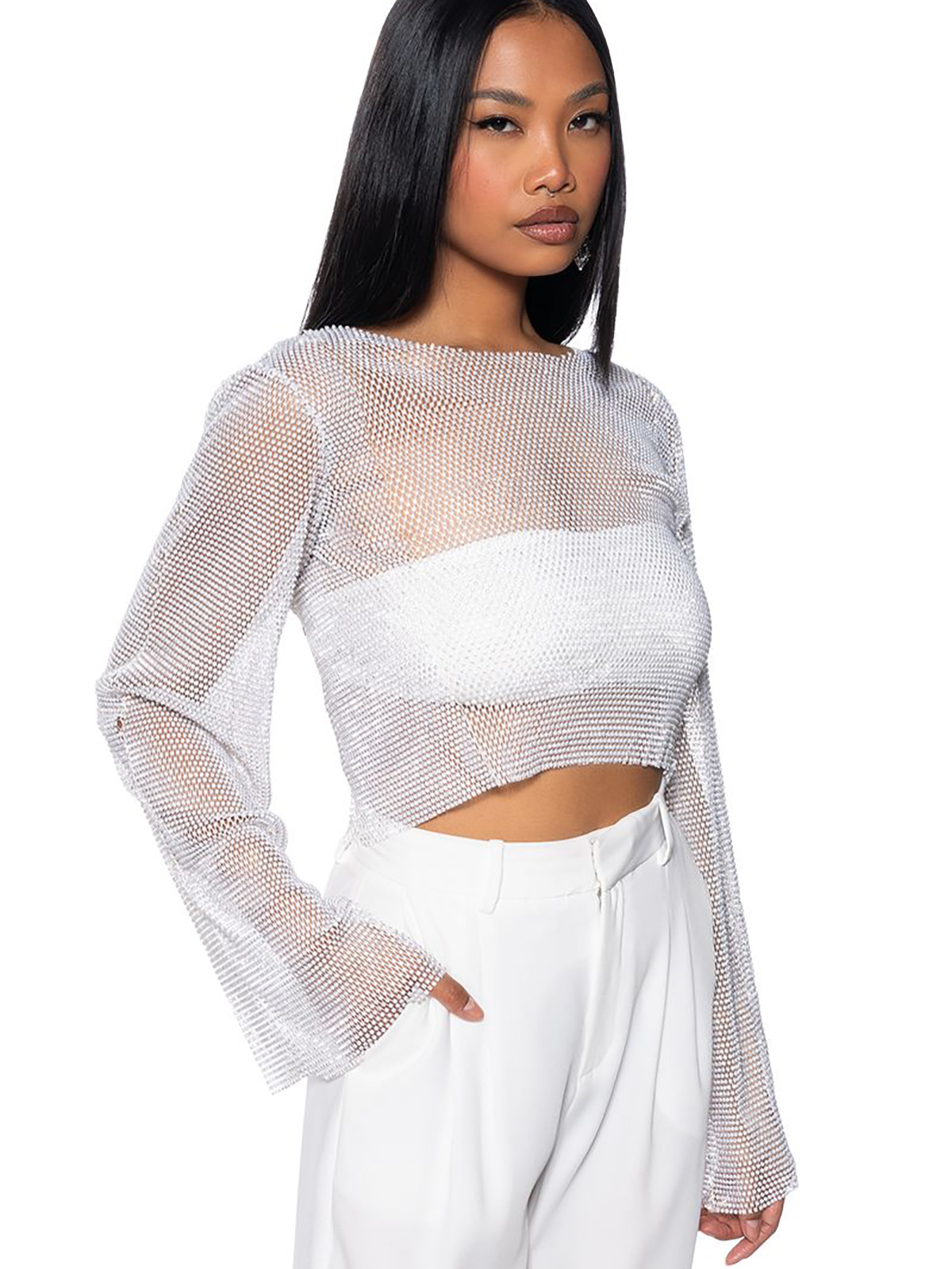 유럽 역 패션 대외 무역 여자의 라인 석 어깨 긴 소매 티셔츠 여자의 최고 개인 낚시 그물 플래시 다이아몬드 유행 티셔츠스토어 가기