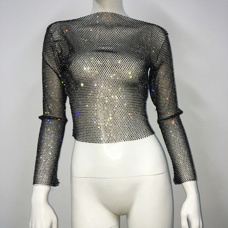 유럽 역 패션 대외 무역 여자의 라인 석 어깨 긴 소매 티셔츠 여자의 최고 개인 낚시 그물 플래시 다이아몬드 유행 티셔츠