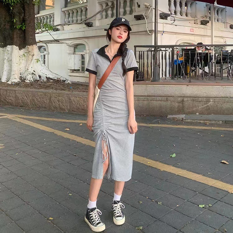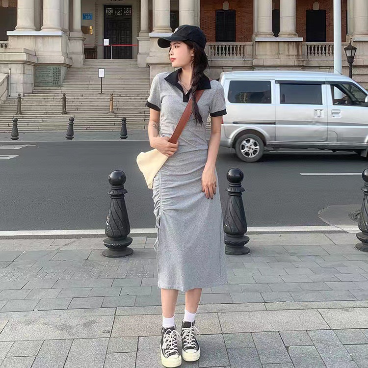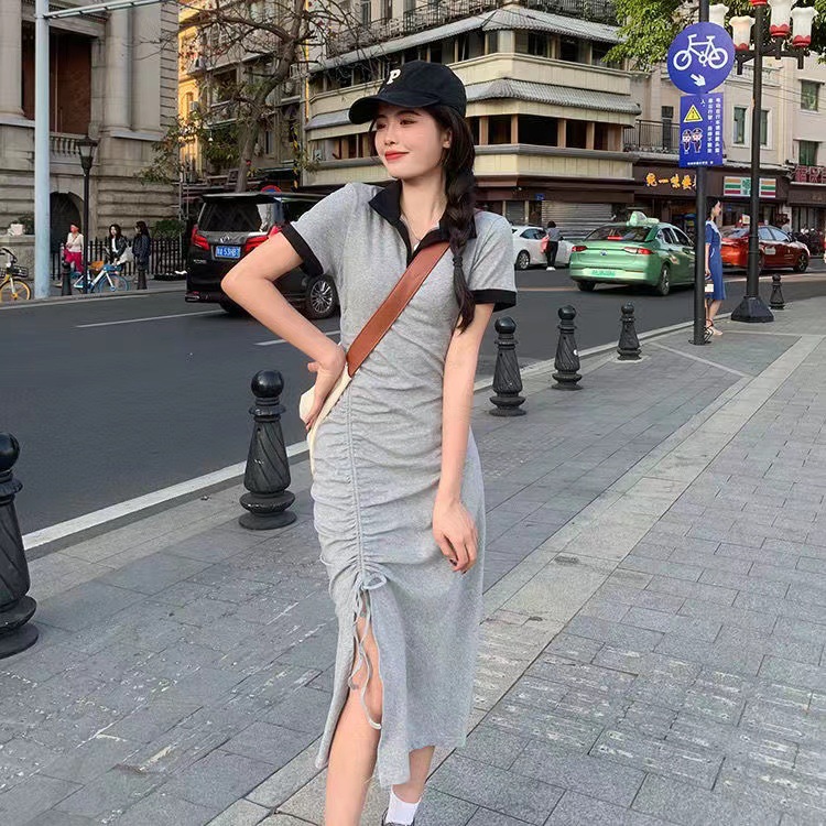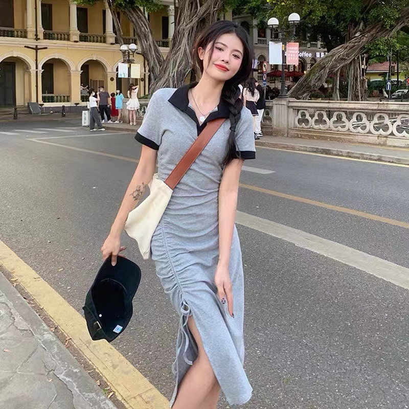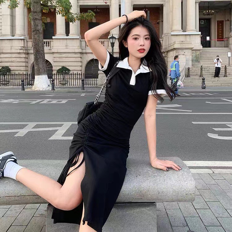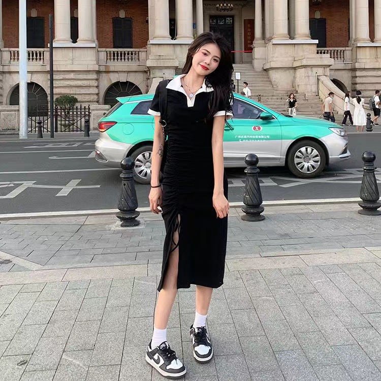 여성을위한 핫 걸 폴로 칼라 드레스 여름 2024 새로운 섹시한 슬릿 허리 슬리밍 힙 커버 중간 길이 스커트스토어 가기