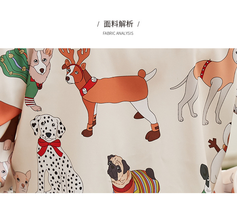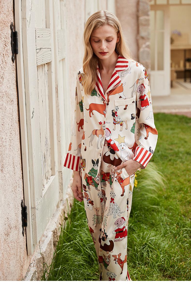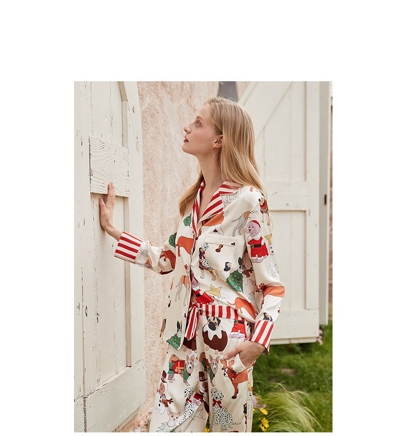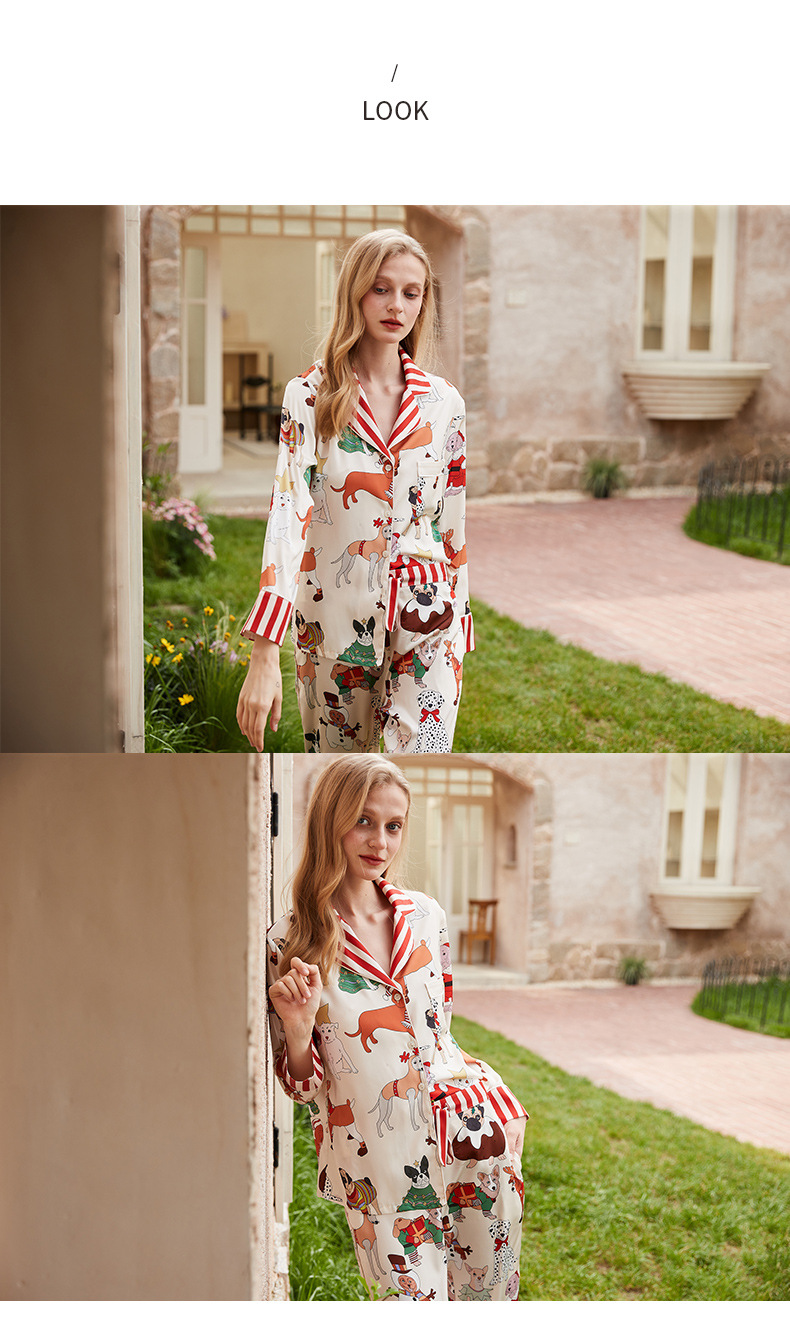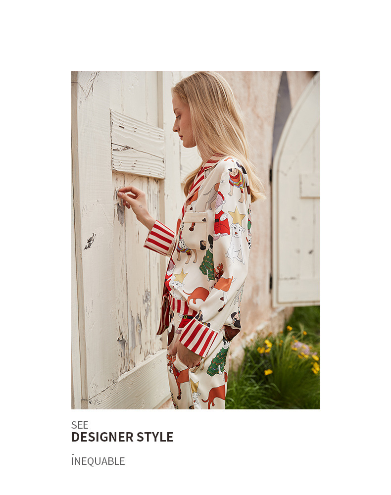[크리스마스 개] Ins 스타일 잠옷 여성 봄, 가을 긴팔 바지 정장 칼라 모조 실크 여성 홈웨어 세트