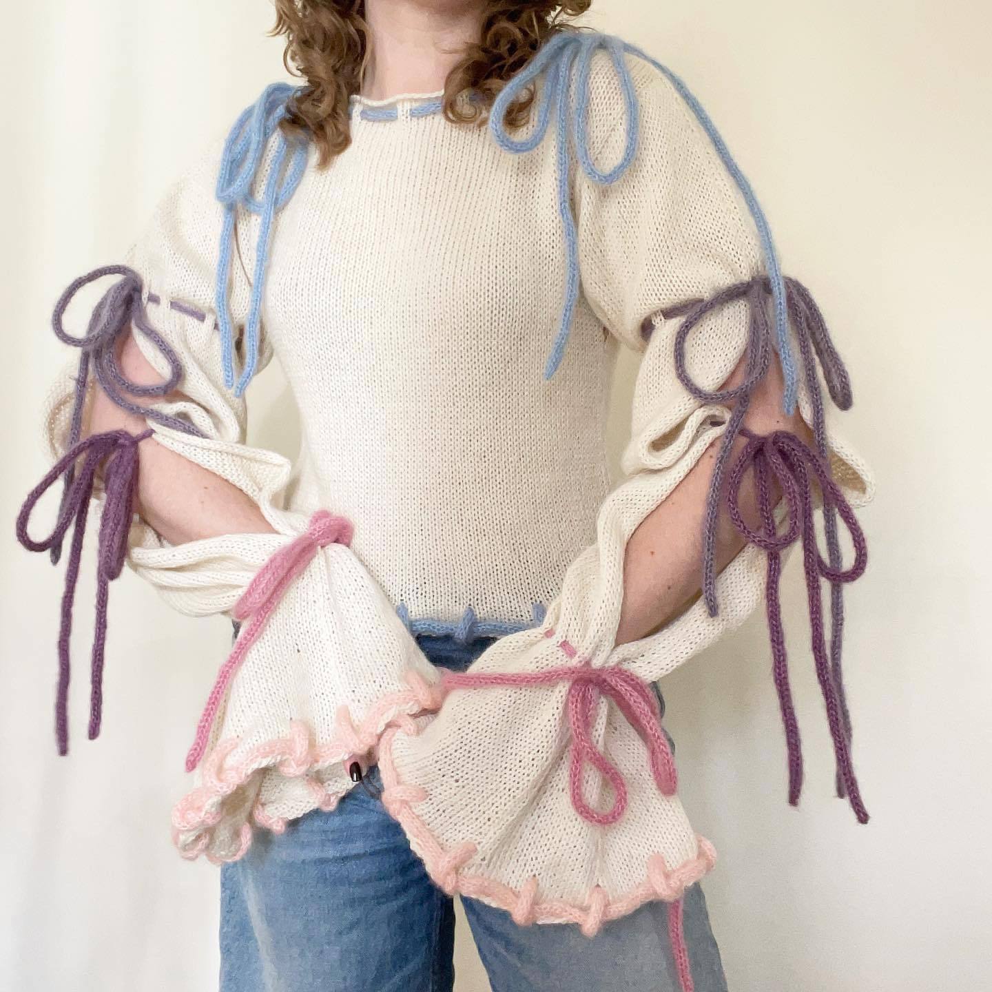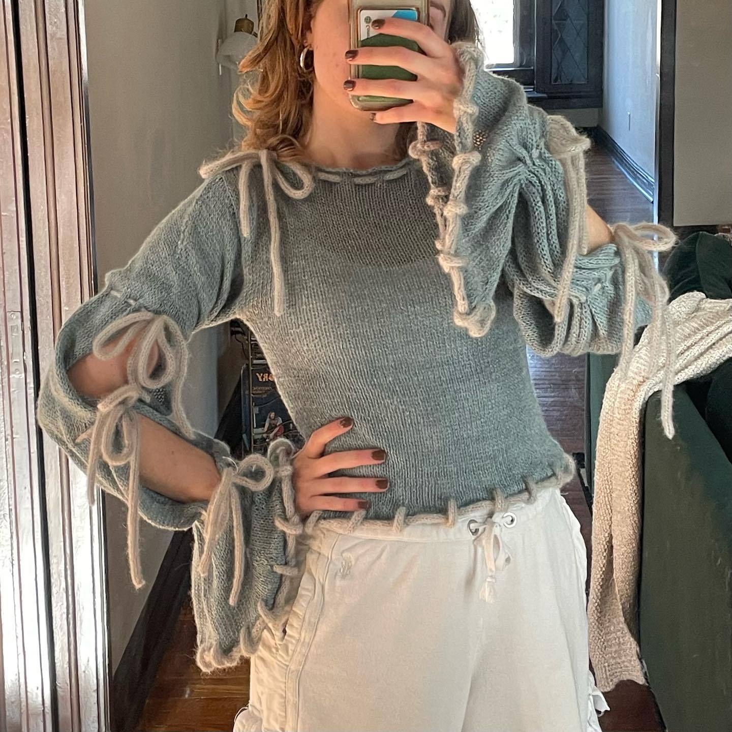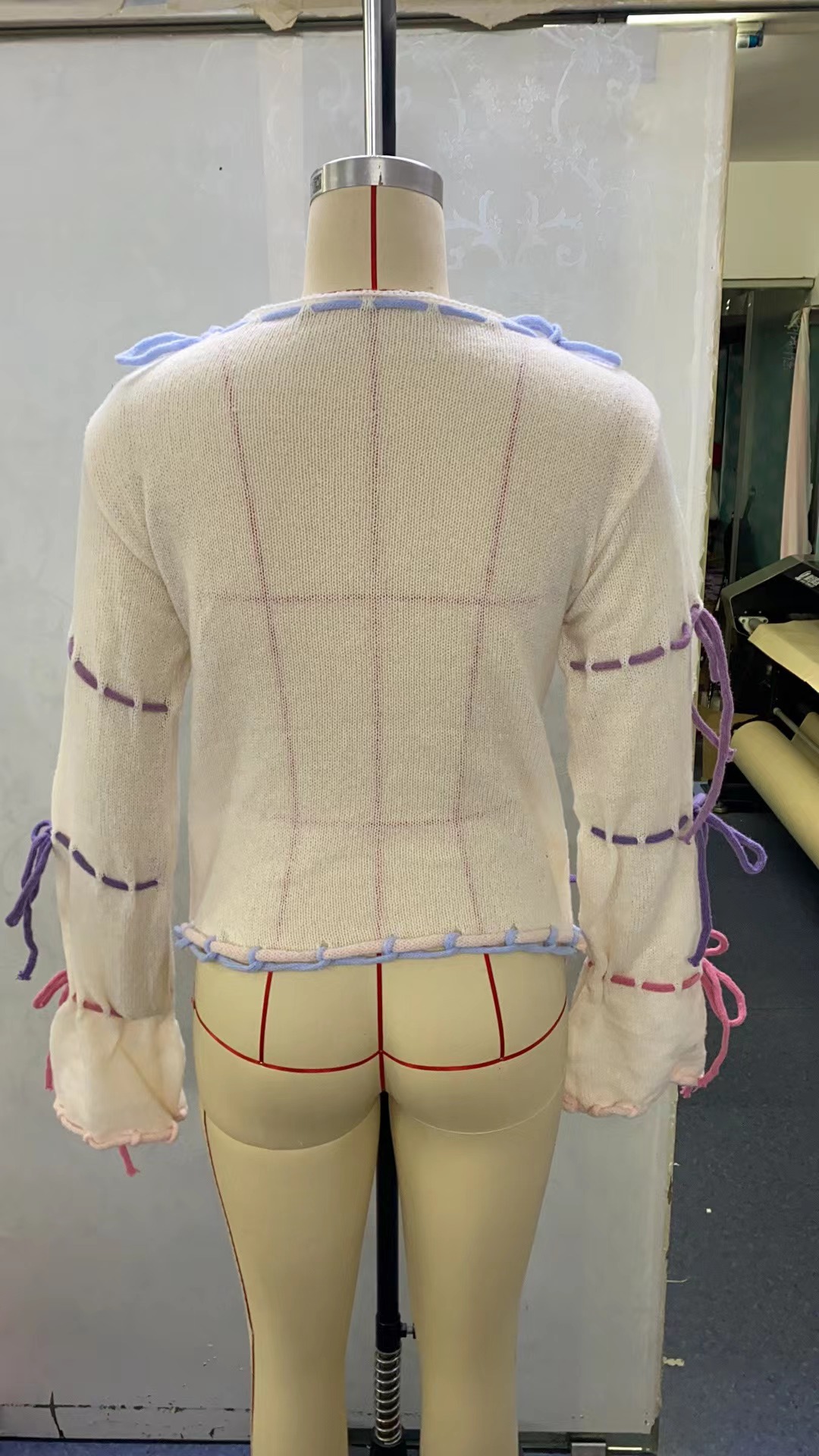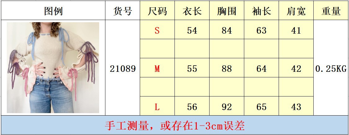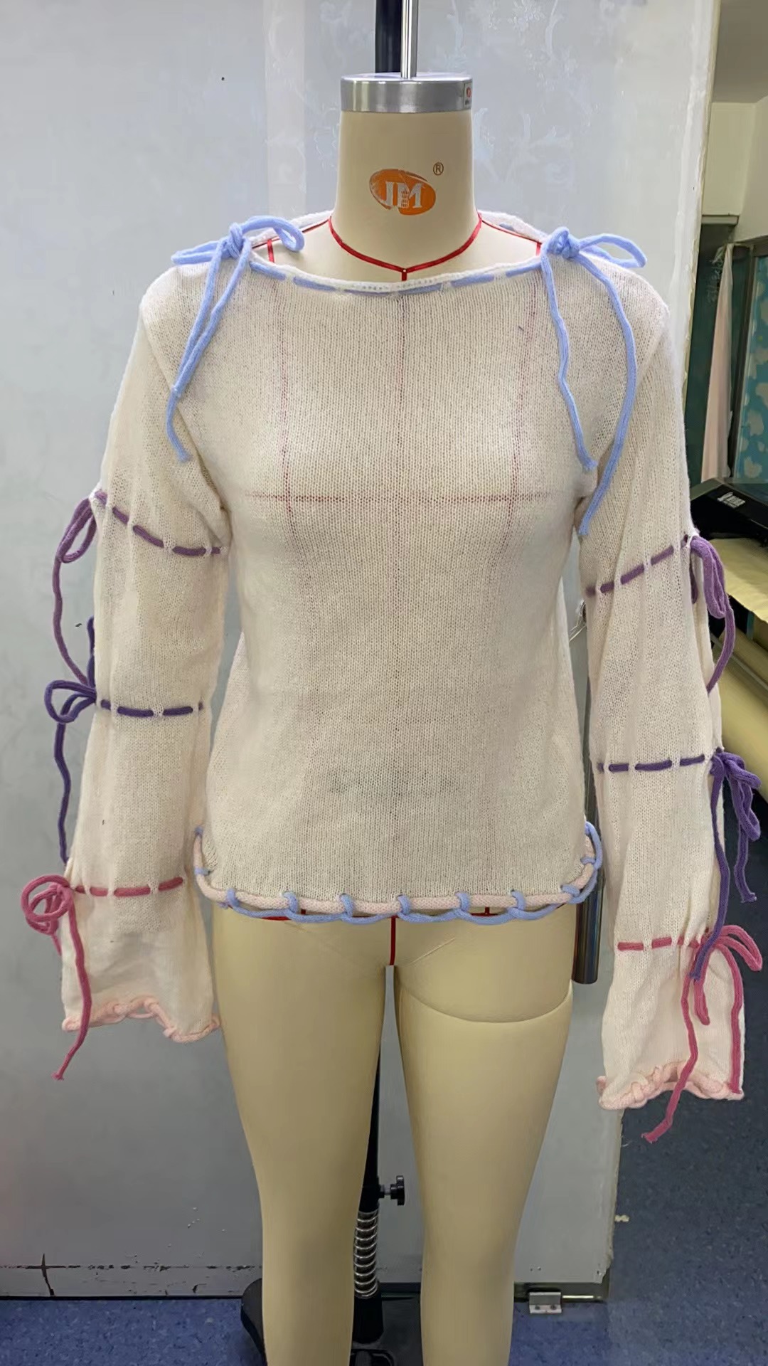 화려한 레이스 업 스웨터 여성의 AliExpress 유럽과 미국 여성의 우아한 라운드 넥 트럼펫 슬리브 컬러 명암 슬림 핏 슬림 스웨터스토어 가기