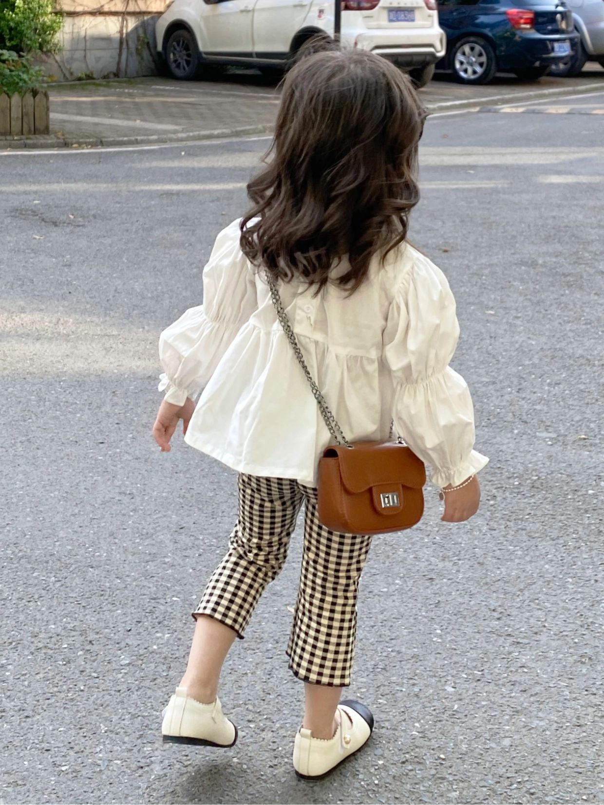 한국 스타일 아동복 2025 새로운 여자 가을 정장 스탠드 칼라 인형 셔츠 슬림 격자 무늬 벨 바닥 투피스 세트스토어 가기