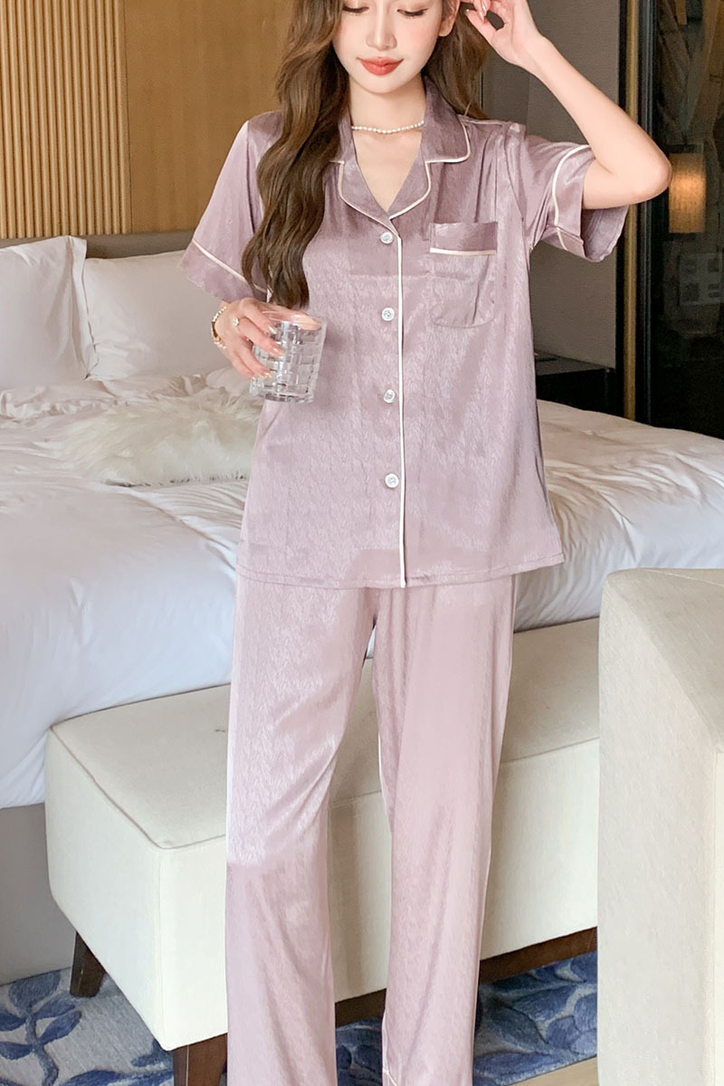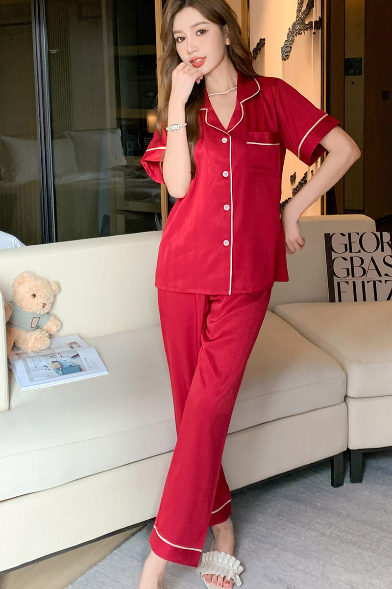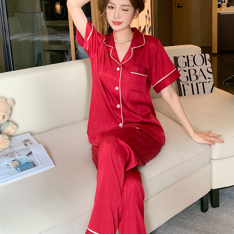 잠옷 여자의 봄과 여름 실크 아이스 실크 반팔 고급 봄과 가을 얇은 여자의 인공 실크 세트스토어 가기