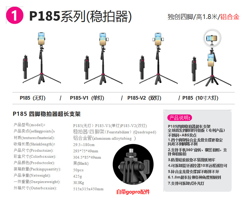 1.8 m P185 셀카 스틱 손떨림 방지 안정제 GOPRO 팬/틸트 GOPRO 라이브 플로어 투 플로어 쿼드 포드 알루미늄 합금 다기능스토어 가기
