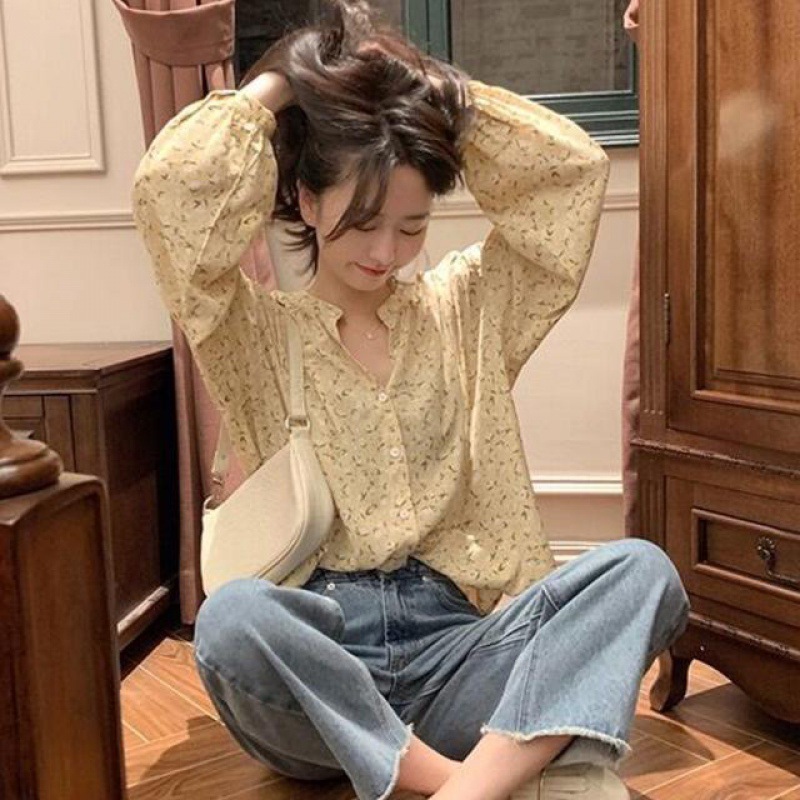 봄 새로운 젠틀 느슨한 슬리밍 우아한 긴팔 베이스 셔츠 여성용 슈퍼 페어리 달콤한 V-넥 꽃 탑 의류스토어 가기