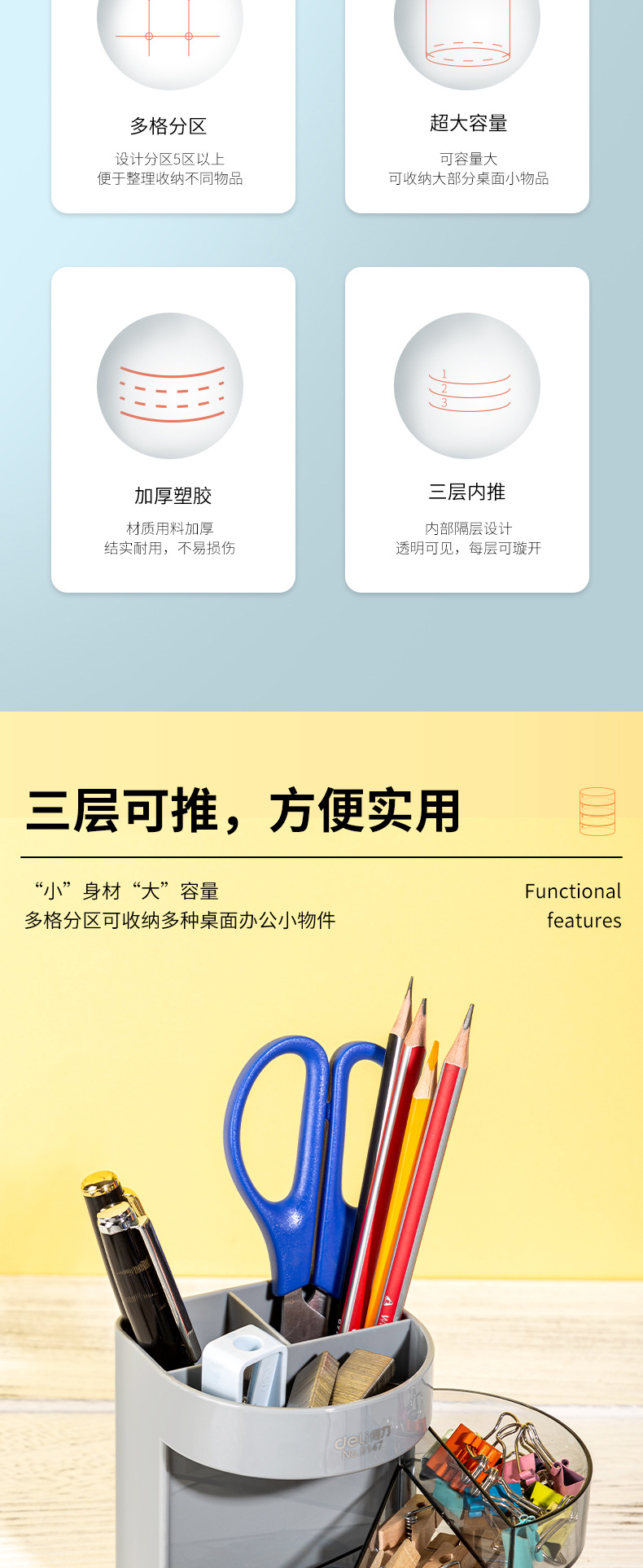 델리 9147 펜 홀더 3 층 다기능 사무실 펜 홀더 데스크탑 비즈니스 사무실 문구 보관 크리에이티브