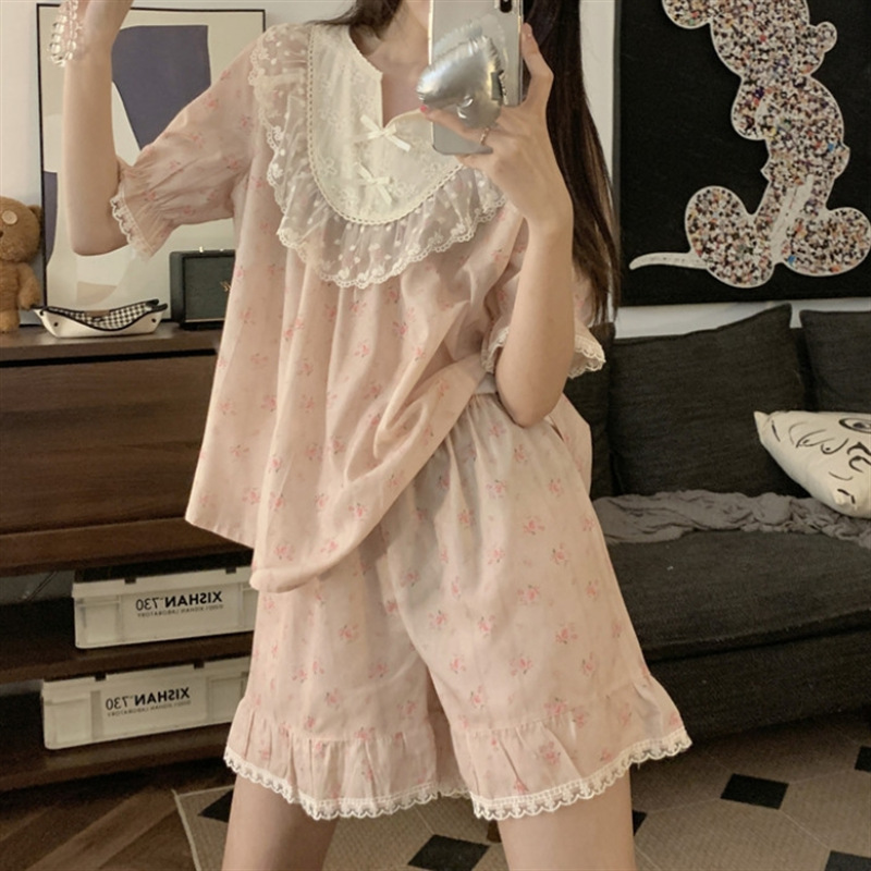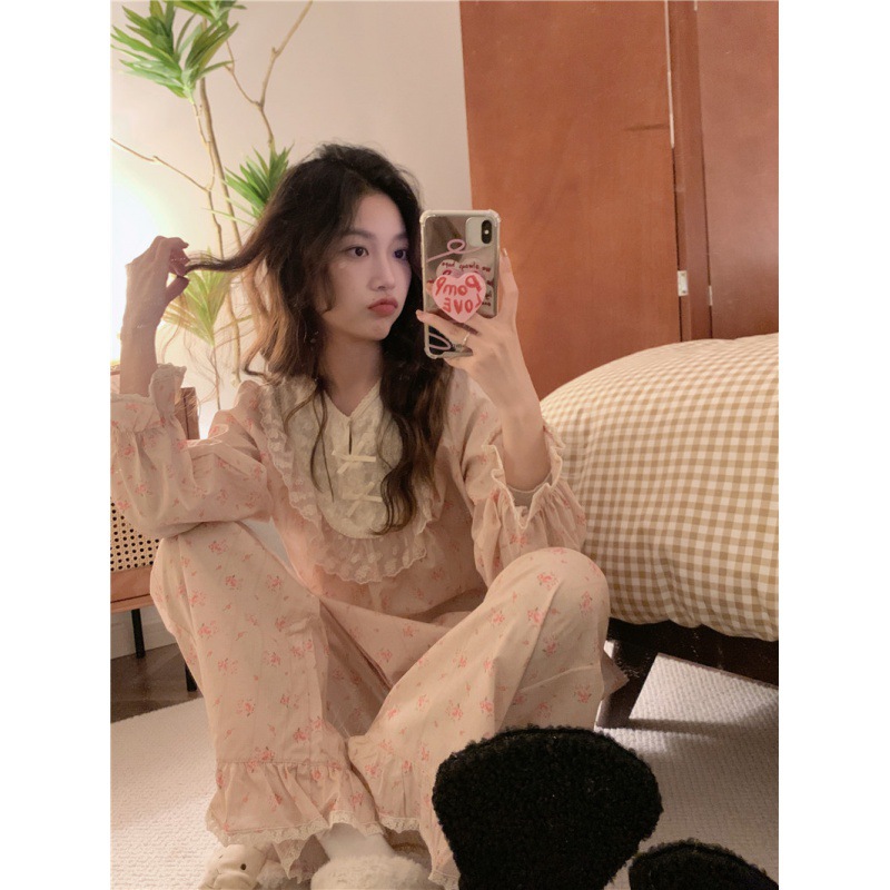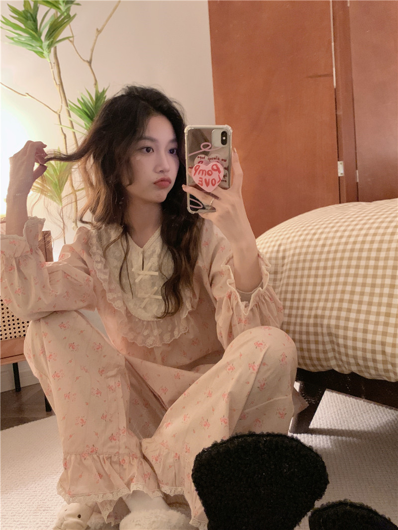한국 in 여자의 봄과 가을 복고풍 코트 스타일 달콤한 여자의 꽃 레이스 긴 소매 가정 옷 잠옷 세트스토어 가기