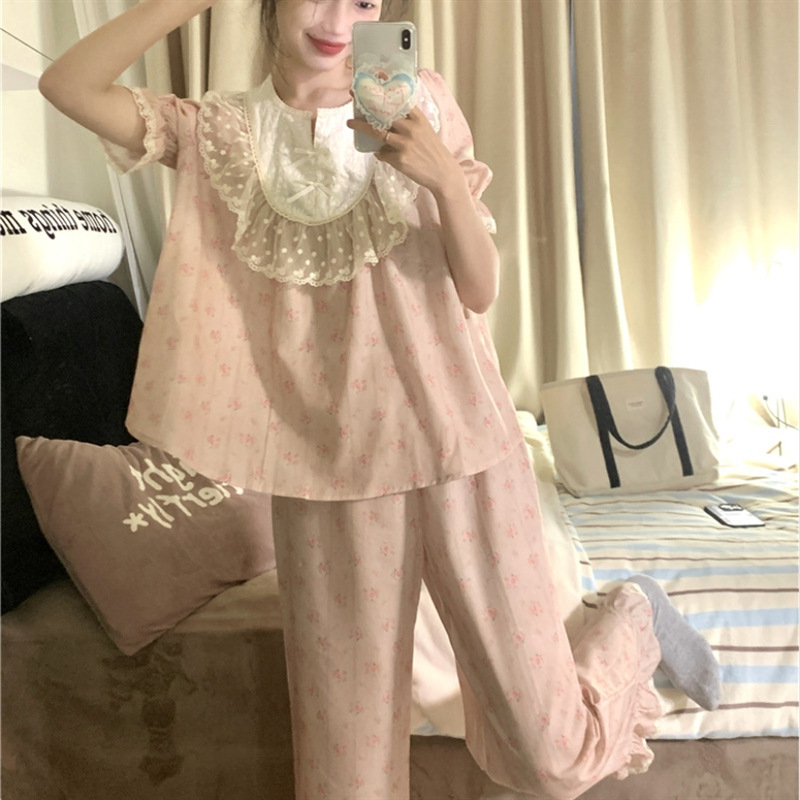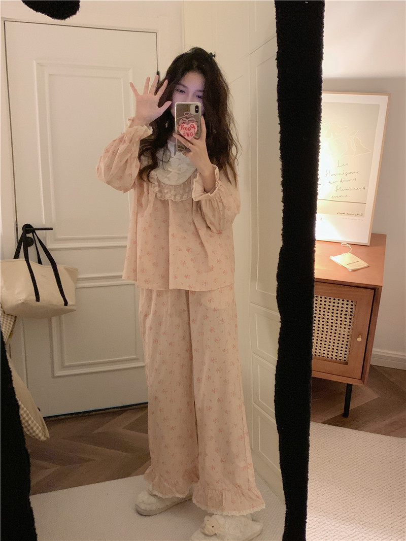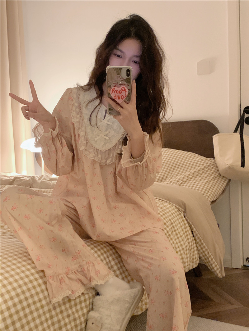 한국 in 여자의 봄과 가을 복고풍 코트 스타일 달콤한 여자의 꽃 레이스 긴 소매 가정 옷 잠옷 세트