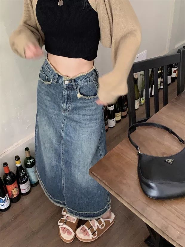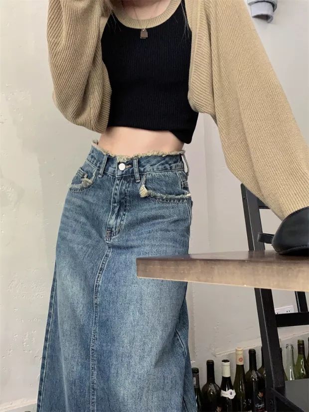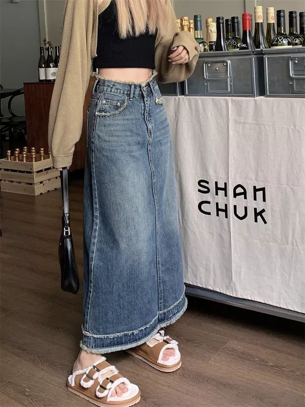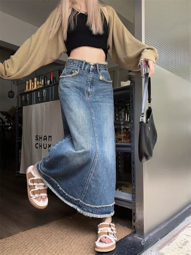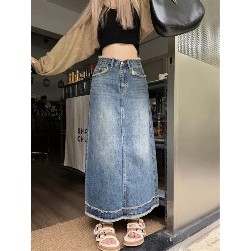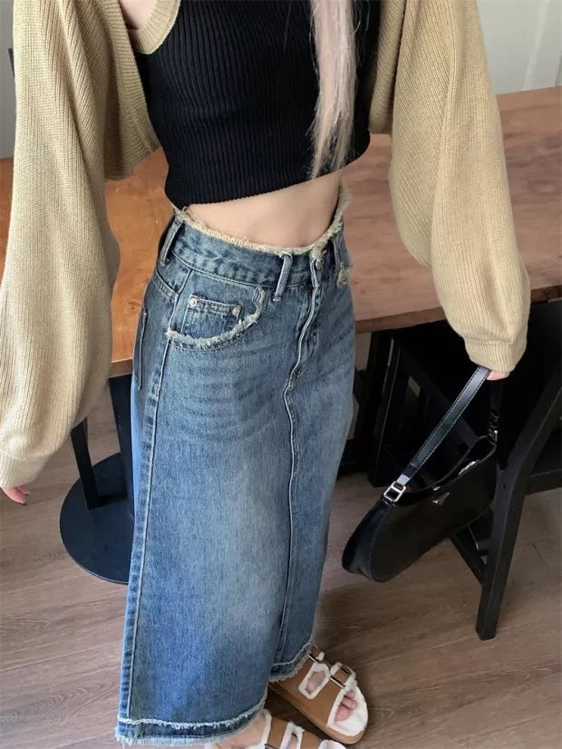 빈티지 버 가장자리 데님 스커트 여자의 가을 2023 새로운 a-모양 하이 웨이스트 디자인 감각 중간 길이 피쉬 테일 스커트스토어 가기
