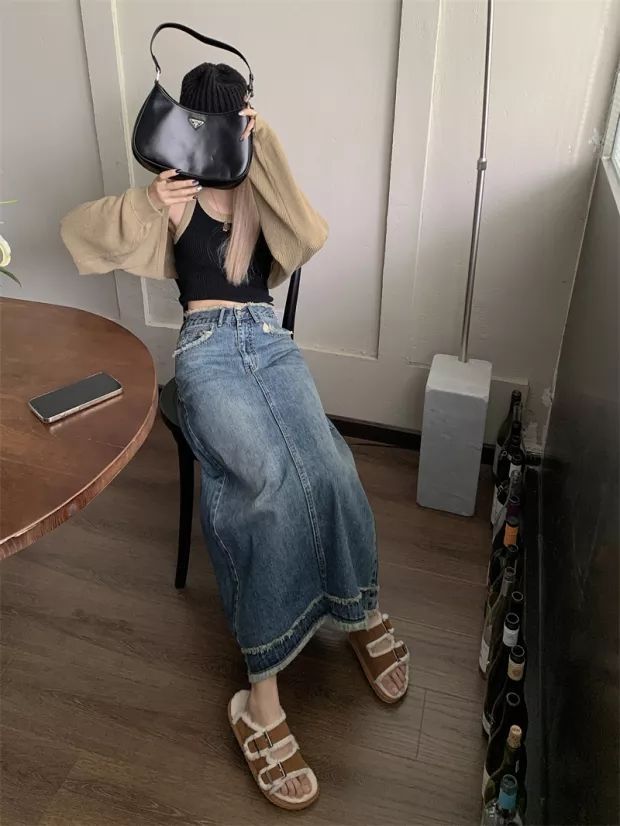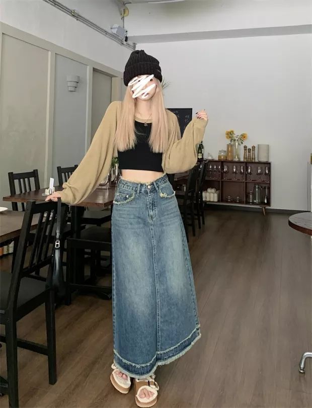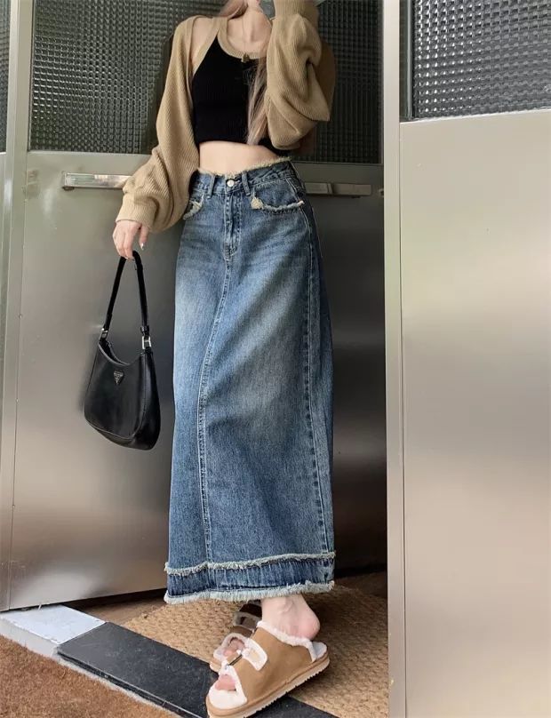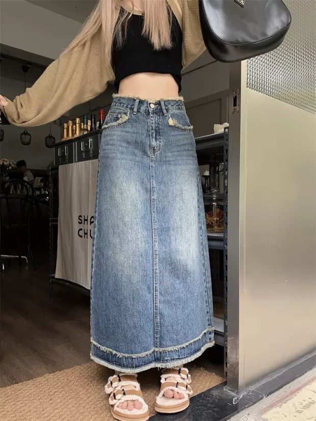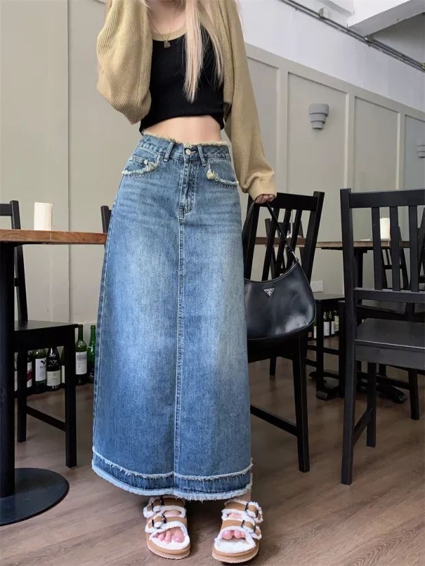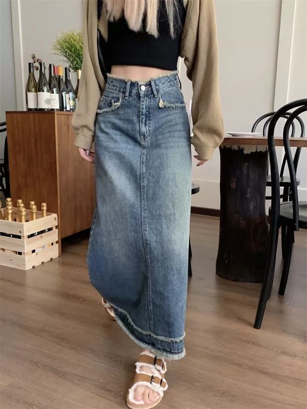 빈티지 버 가장자리 데님 스커트 여자의 가을 2023 새로운 a-모양 하이 웨이스트 디자인 감각 중간 길이 피쉬 테일 스커트스토어 가기