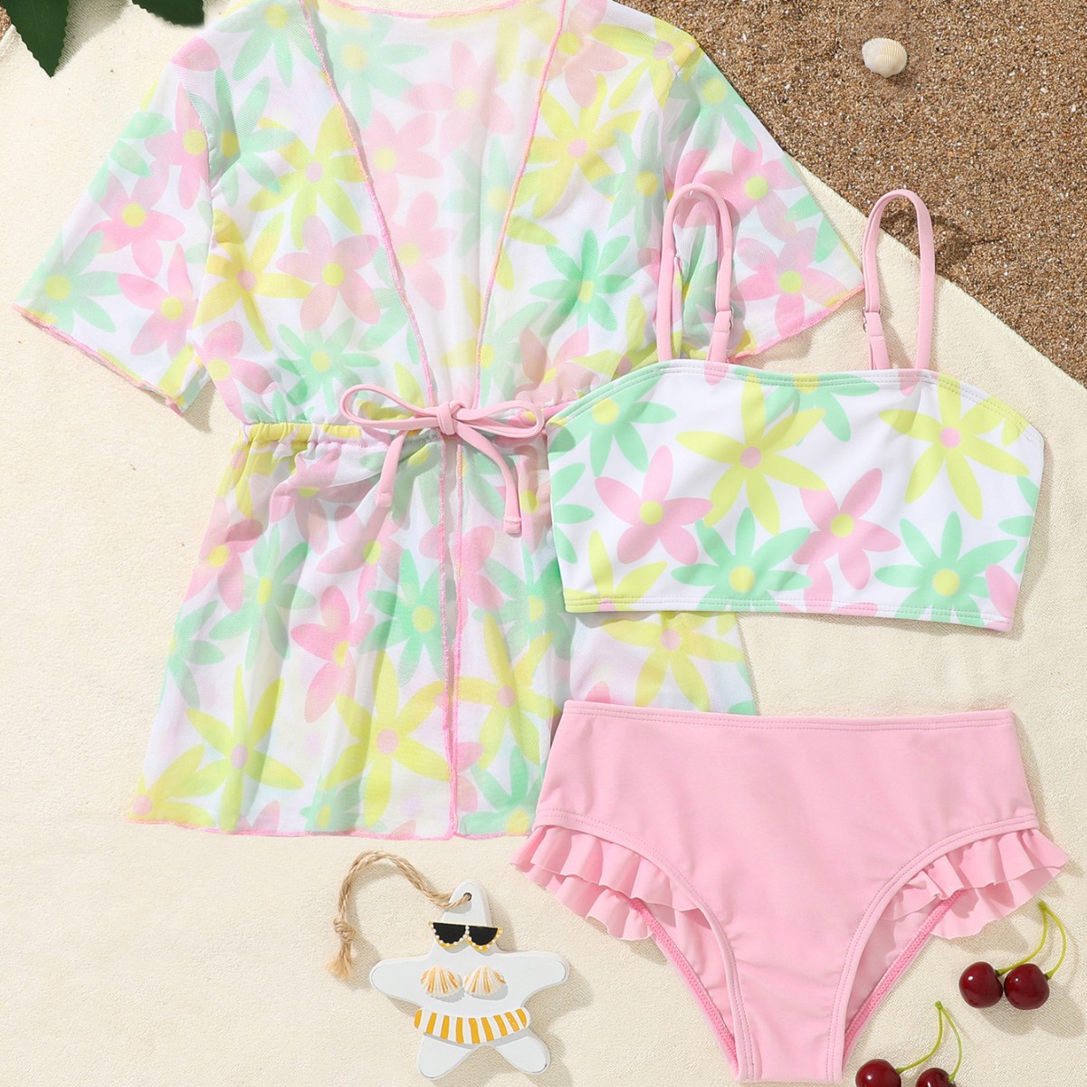 2023 어린이 아기 3 피스 수영복 만화 꽃 블라우스 소녀 수영복 아마존 핫스토어 가기