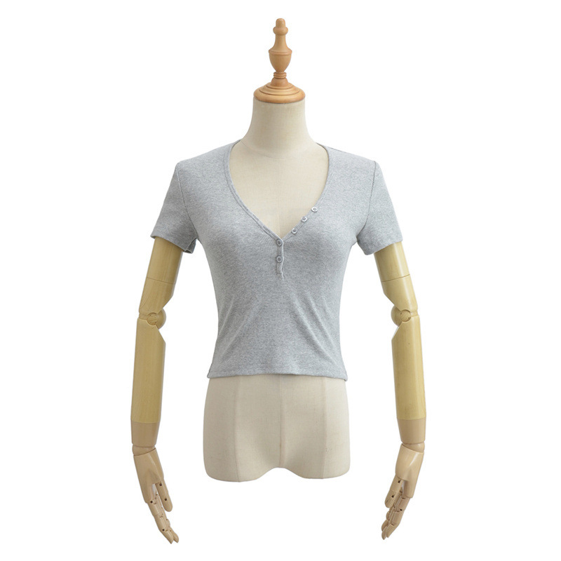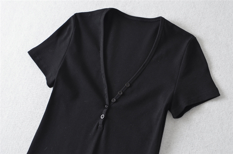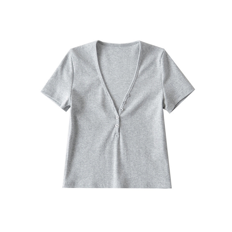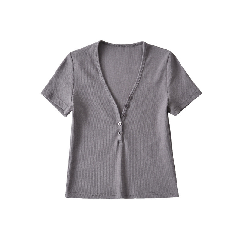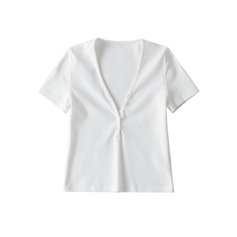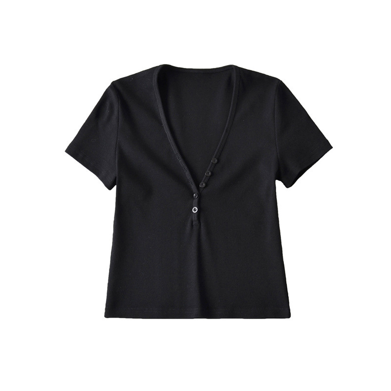 유럽과 미국 스타일 V-넥 버튼 스파이스 걸스베이스 티셔츠 여름 새로운 스타일 웨스턴 스타일 모든 매치 슬림 핏 슬리밍 짧은 크롭 탑