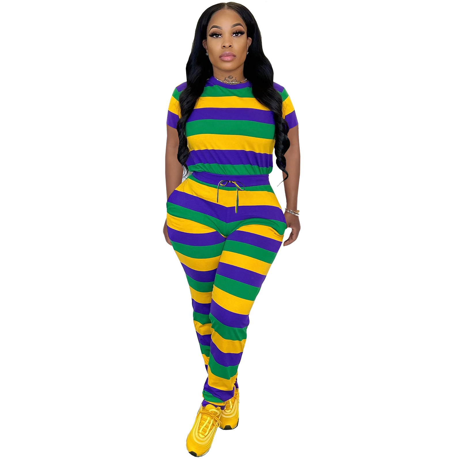 4603 크로스보더 유럽과 미국 여성용 면 땀 흡수 스트라이프 포지셔닝 프린트 라운드 넥 반팔 팬츠 세트 투피스 세트스토어 가기