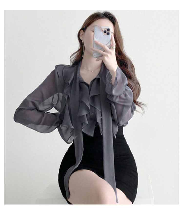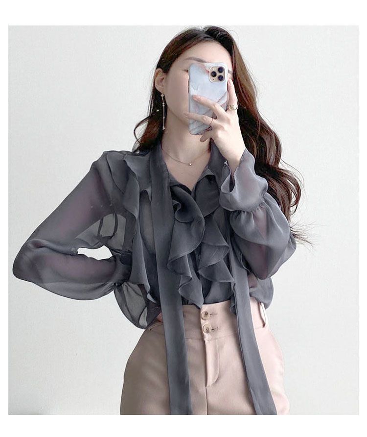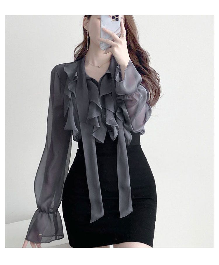 디자인 센스 러플 쉬폰 셔츠 얇은 마이크로 투명 셔츠 셔츠 여성용 봄과 여름 레이스업 긴팔 우아한 V-넥 탑스토어 가기