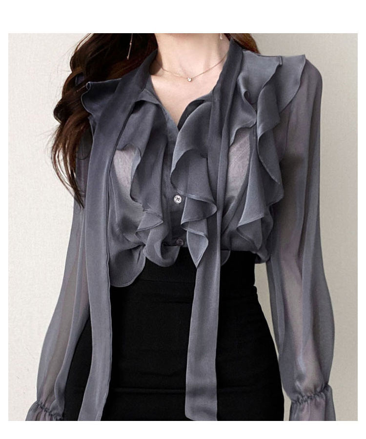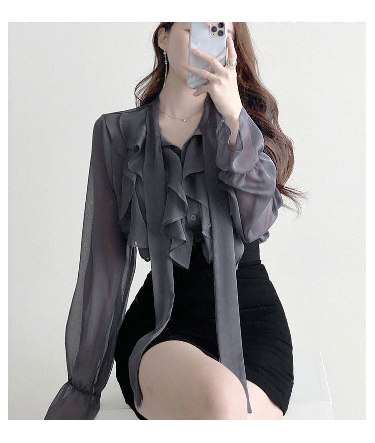 디자인 센스 러플 쉬폰 셔츠 얇은 마이크로 투명 셔츠 셔츠 여성용 봄과 여름 레이스업 긴팔 우아한 V-넥 탑