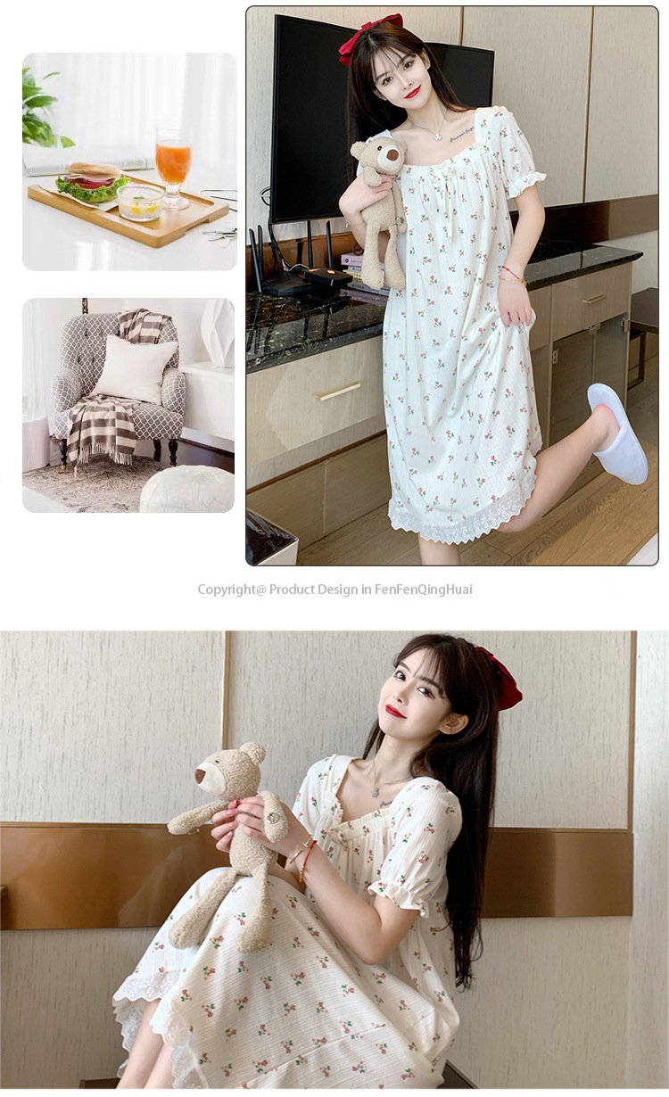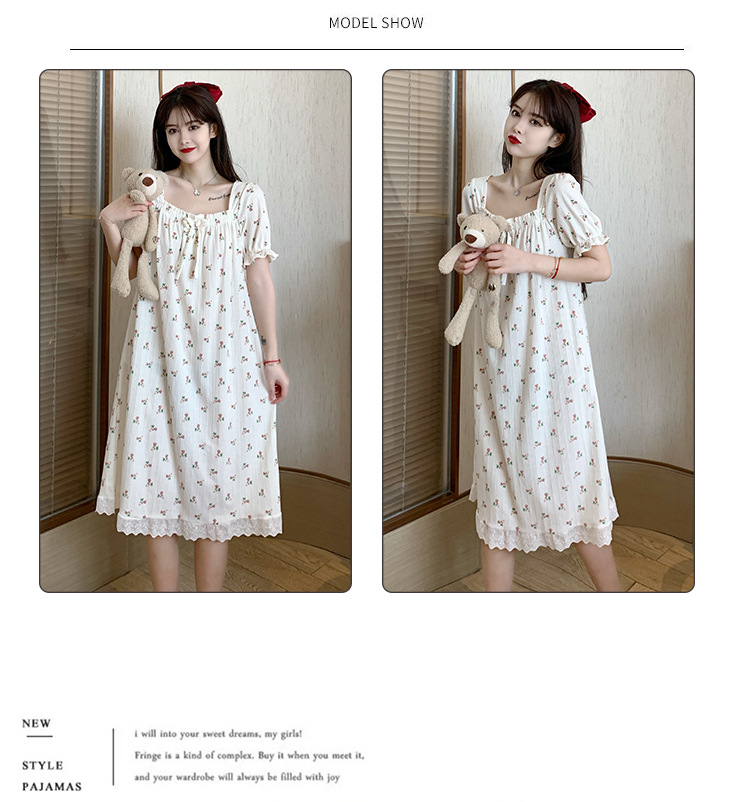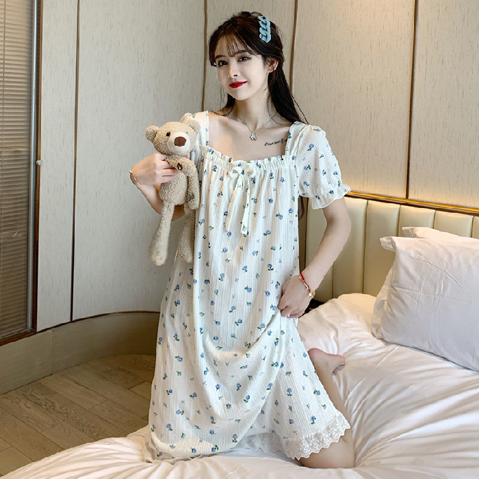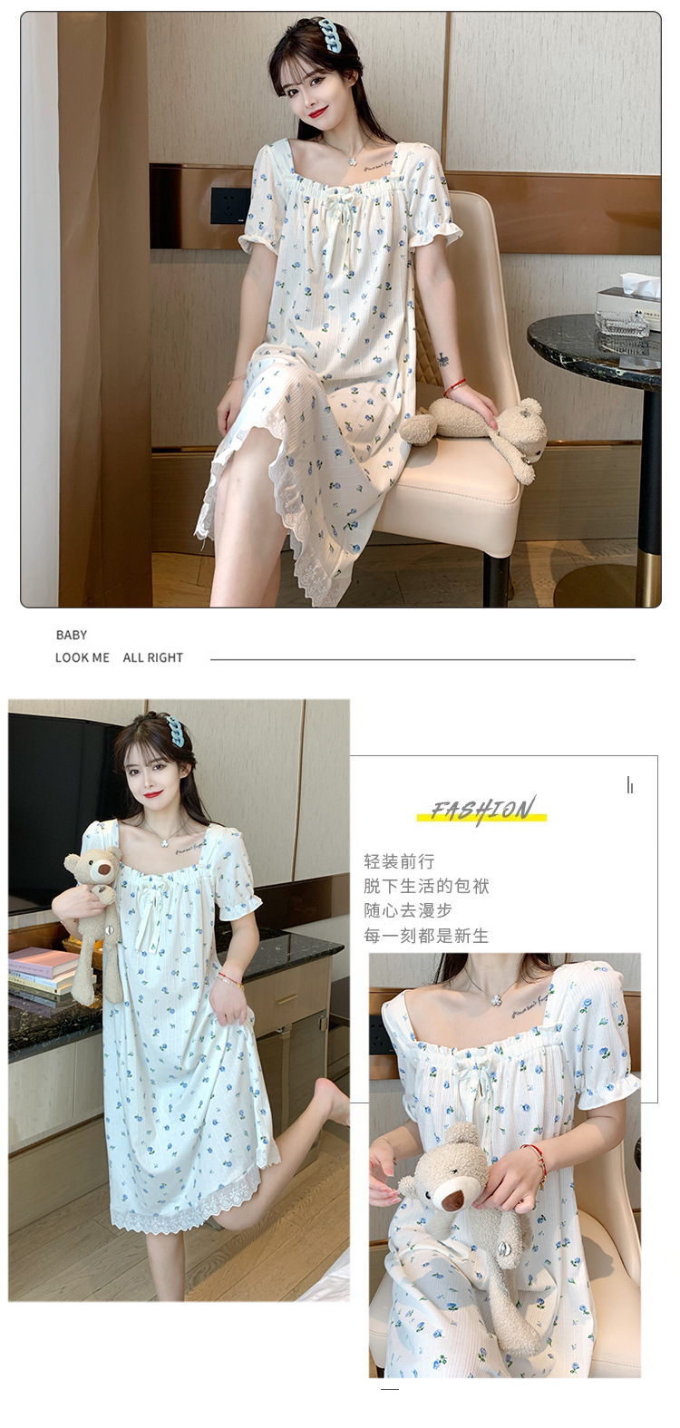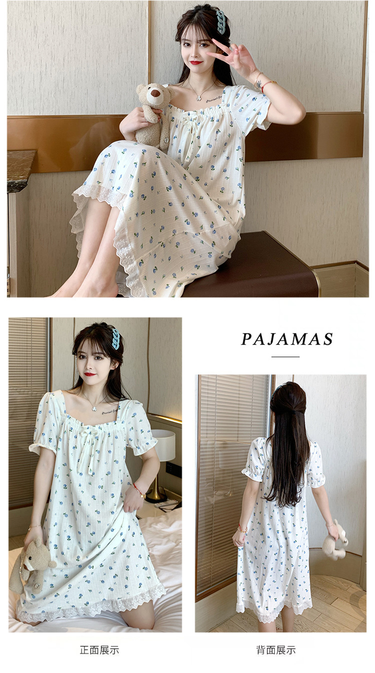 면 잠옷 여성용 여름 새로운 스위트 인 플로럴 반팔 중간 길이 잠옷 소녀의 홈웨어 얇은 겉옷