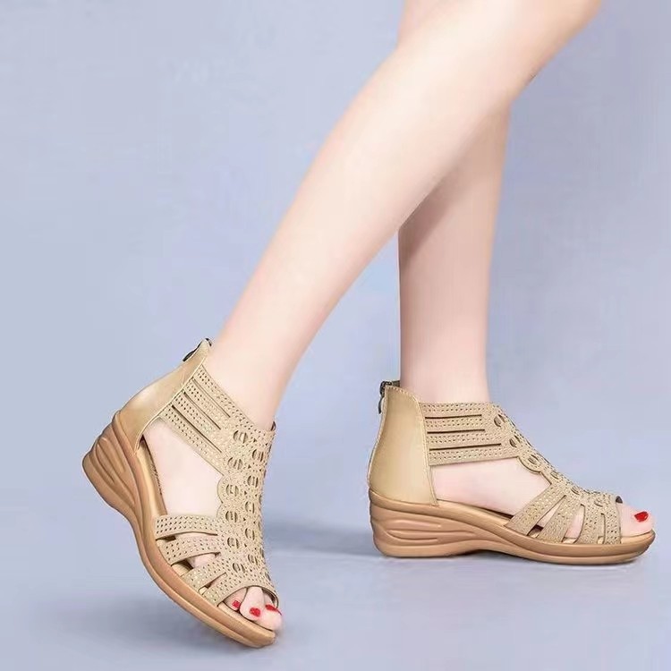 여름 여성의 2023 새로운 샌들 패션 도매 두꺼운 단독 중년 및 늙은 엄마 신발 웨지 미드 힐 소프트 솔 편안스토어 가기
