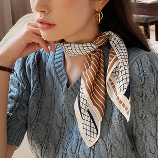 2023新款春季韩版简约仿真丝70cm几何格子丝巾装饰领巾中方巾批发