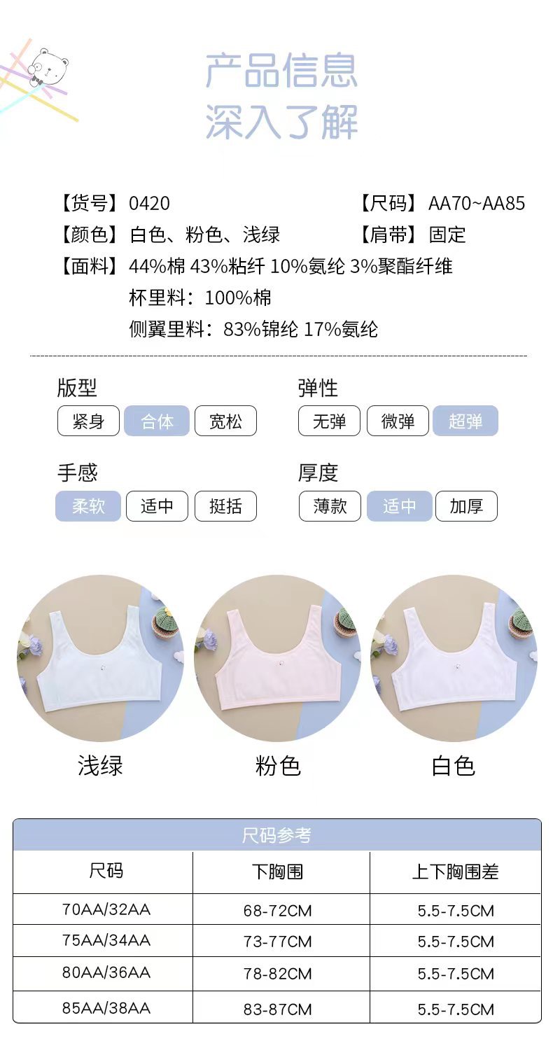 1 단계 십대 발달기 소 조끼 면 안감 아동 여아 속옷 초등학생 여름 스포츠 브라