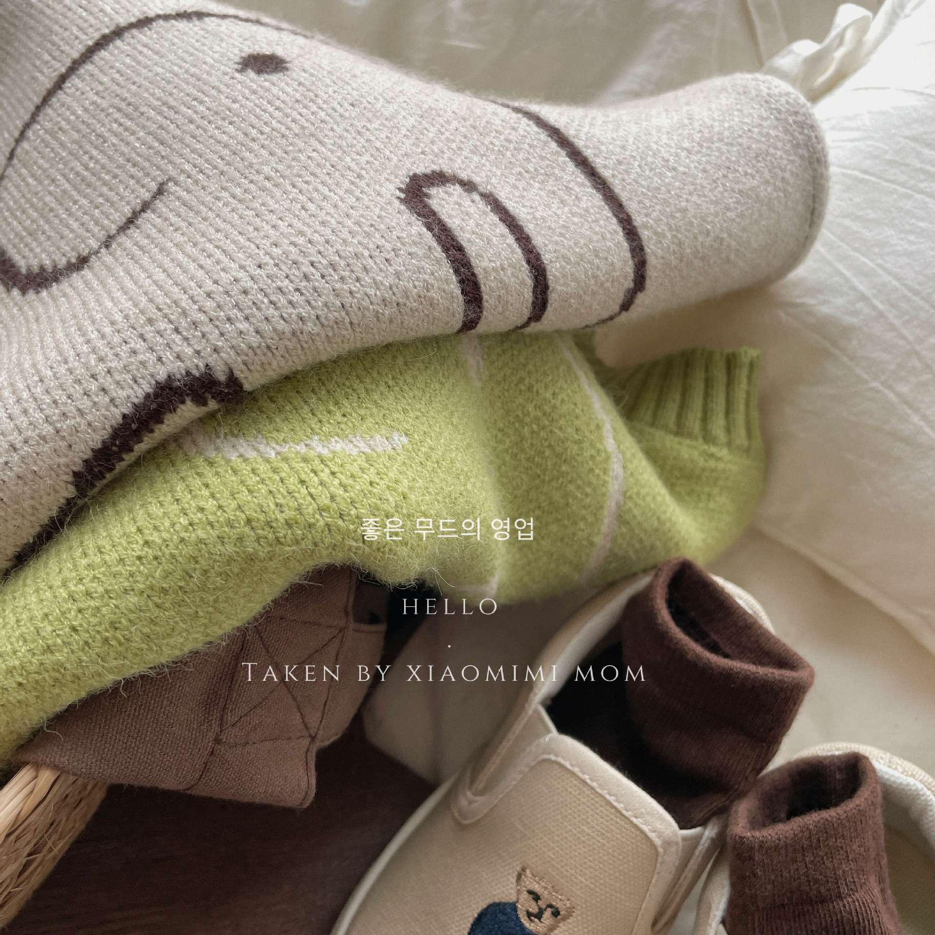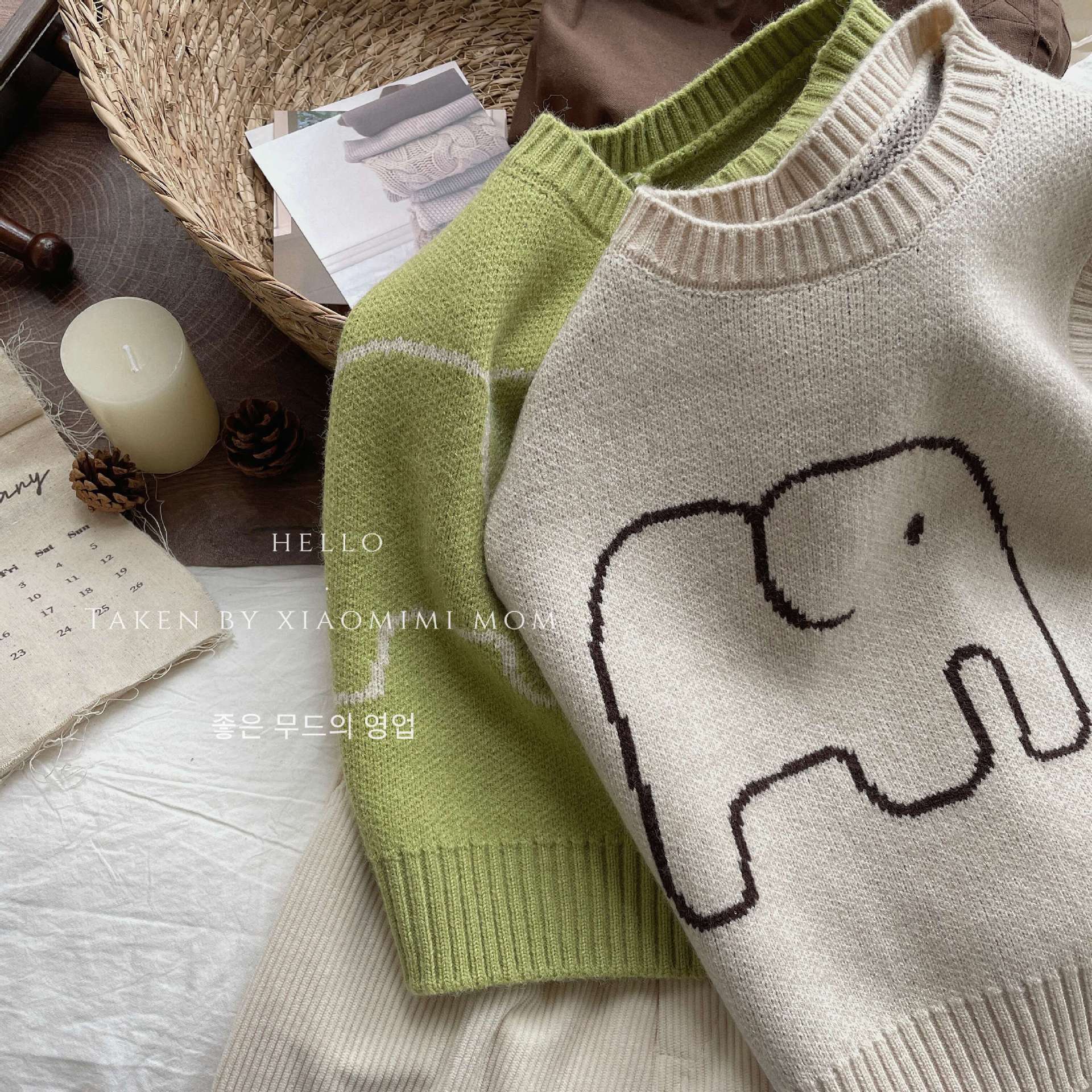 2025 한국 어린이 만화 코끼리 자카드 니트 조끼 봄 가을 신상 남녀 공용 라운드넥 풀오버 스웨터